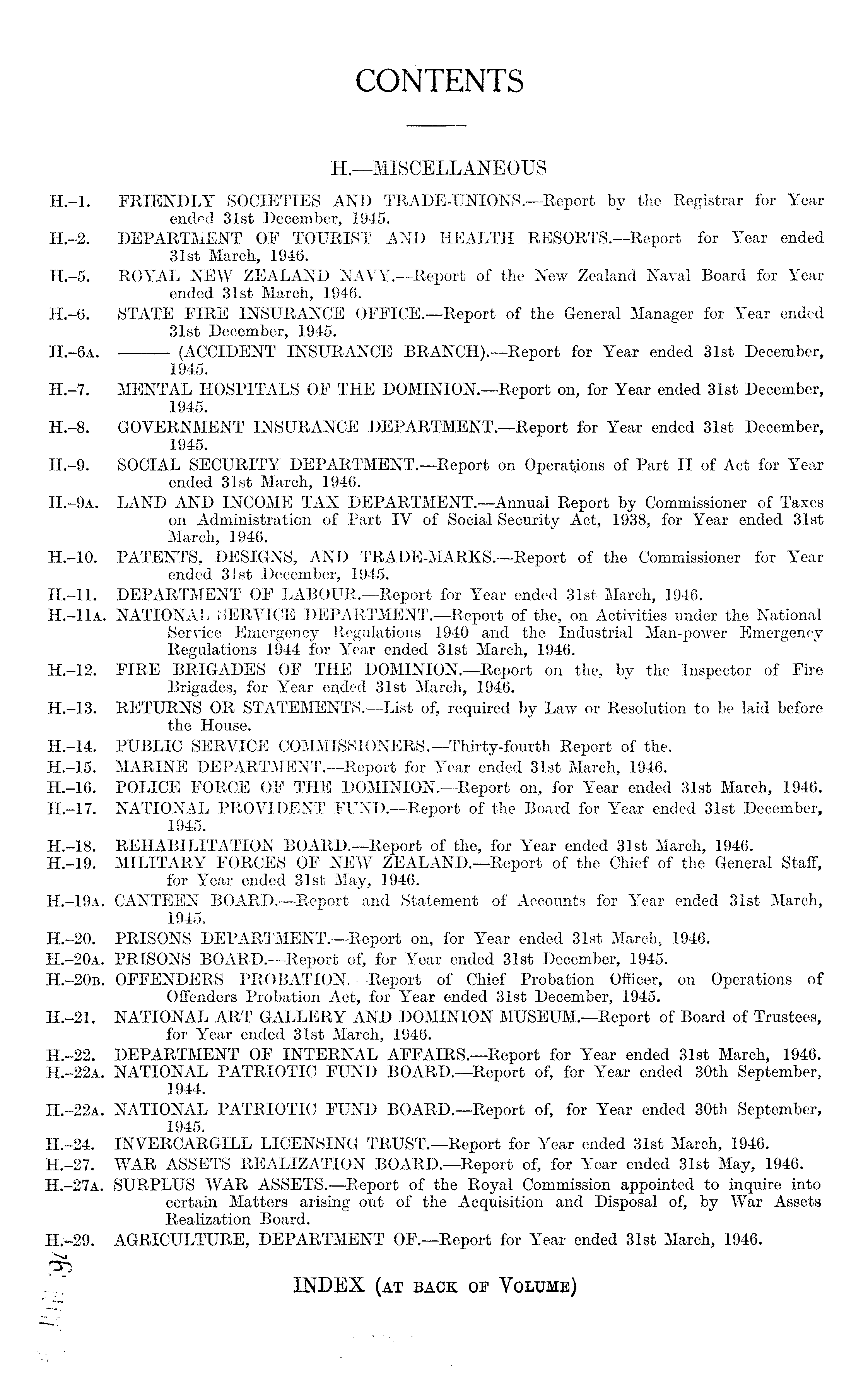 CONTENTS H.—MISCELLANEOUS H.-1. FRIENDLY SOCIETIES AND TRADE-UNlONS.—Report by the Registrar for Year ended 31st December, 1945. H.-2. DEPARTMENT OF TOURIST AND HEALTH RESORTS.—Report for Year ended 31st March, 1946. H.-5. ROYAL NEW ZEALAND NAVY.—Report of the New Zealand Naval Board for Year ended 31st March, 1946. H.-6. STATE FIRE INSURANCE OFFICE.—Report of the General Manager for Year ended 31st December, 1945. H.-6A. (ACCIDENT INSURANCE BRANCH).—Report for Year ended 31st December, 1945. H.-7. MENTAL HOSPITALS OF THE DOMINION.—Report on, for Year ended 31st December, 1945. H.-8. GOVERNMENT INSURANCE DEPARTMENT.—Report for Year' ended 31st December, 1945. H.-9. SOCIAL SECURITY DEPARTMENT.—Report on Operations of Part II of Act for Year ended 31st March, 1946. H.-9a. LAND AND INCOME TAX DEPARTMENT. —Annual Report by Commissioner of Taxes on Administration of Part IV of Social Security Act, 1938, for Year ended 31st March, 1946. H.-10. PATENTS, DESIGNS, AND TRADE-MARKS.—Report of the Commissioner for Year ended 31st December, 1945. H.-11. DEPARTMENT OF LABOUR.—Report for Year ended 31st March, 1946. H.-11a. NATIONAL SERVICE DEPARTMENT. —Report of the, on Activities under the National Service Emergency Regulations 1940 and the Industrial Man-power Emergency Regulations 1944 for Year ended 31st March, 1946. H.-12. FIRE BRIGADES OF THE DOMINION.—Report on the, by the Inspector of Fire Brigades, for Year ended 31st March, 1946. H.-13. RETURNS OR STATEMENTS.—List of, required by Law or Resolution to be laid before the House. H.-14. PUBLIC SERVICE COMMISSIONERS.—Thirty-fourth Report of the. H.-15. MARINE DEPARTMENT.—Report for Year ended 31st March, 1946. H.-16. POLICE FORCE OF THE DOMINION.—Report on, for Year ended 31st March, 1946. H.-17. NATIONAL PROVIDENT FUND. —Report of the Board for Year ended 31st December, 1945. H.-18. REHABILITATION BOARD.—Report of the, for Year ended 31st March, 1946. H.-19. MILITARY FORCES OF NEW ZEALAND.—Report of the Chief of the General Staff, for Year ended 31st May, 1946. H.-19a. CANTEEN BOARD.—Report and Statement of Accounts for Year ended 31st March, 1945. H.-20. PRISONS DEPARTMENT.—Report on, for Year ended 31st March, 1946. H.-20a. PRISONS BOARD.—Report of, for Year ended 31st December, 1945. H.-20b. OFFENDERS PROBATION. —Report of Chief Probation Officer, on Operations of Offenders Probation Act, for Year ended 31st December, 1945. H.-21. NATIONAL ART GALLERY AND DOMINION MUSEUM.—Report of Board of Trustees, for Year ended 31st March, 1946. H.-22. DEPARTMENT OF INTERNAL AFFAIRS.—Report for Year ended 31st March, 1946. H.-22a. NATIONAL PATRIOTIC FUND BOARD.—Report of, for Year ended 30th September, 1944. H.-22a. NATIONAL PATRIOTIC FUND BOARD.—Report of, for Year ended 30th September, 1945. H.-24. INVERCARGILL LICENSING TRUST.—Report for Year ended 31st March, 1946. H.-27. WAR ASSETS REALIZATION BOARD.—Report of, for Year ended 31st May, 1946. H.-27A. SURPLUS WAR ASSETS.—Report of the Royal Commission appointed to inquire into certain Matters arising out of the Acquisition and Disposal of, by War Assets Realization Board. H.-29. AGRICULTURE, DEPARTMENT OF.—Report for Year ended 31st March, 1946. cn INDEX (at back of Volume) < £f S v . OS '
