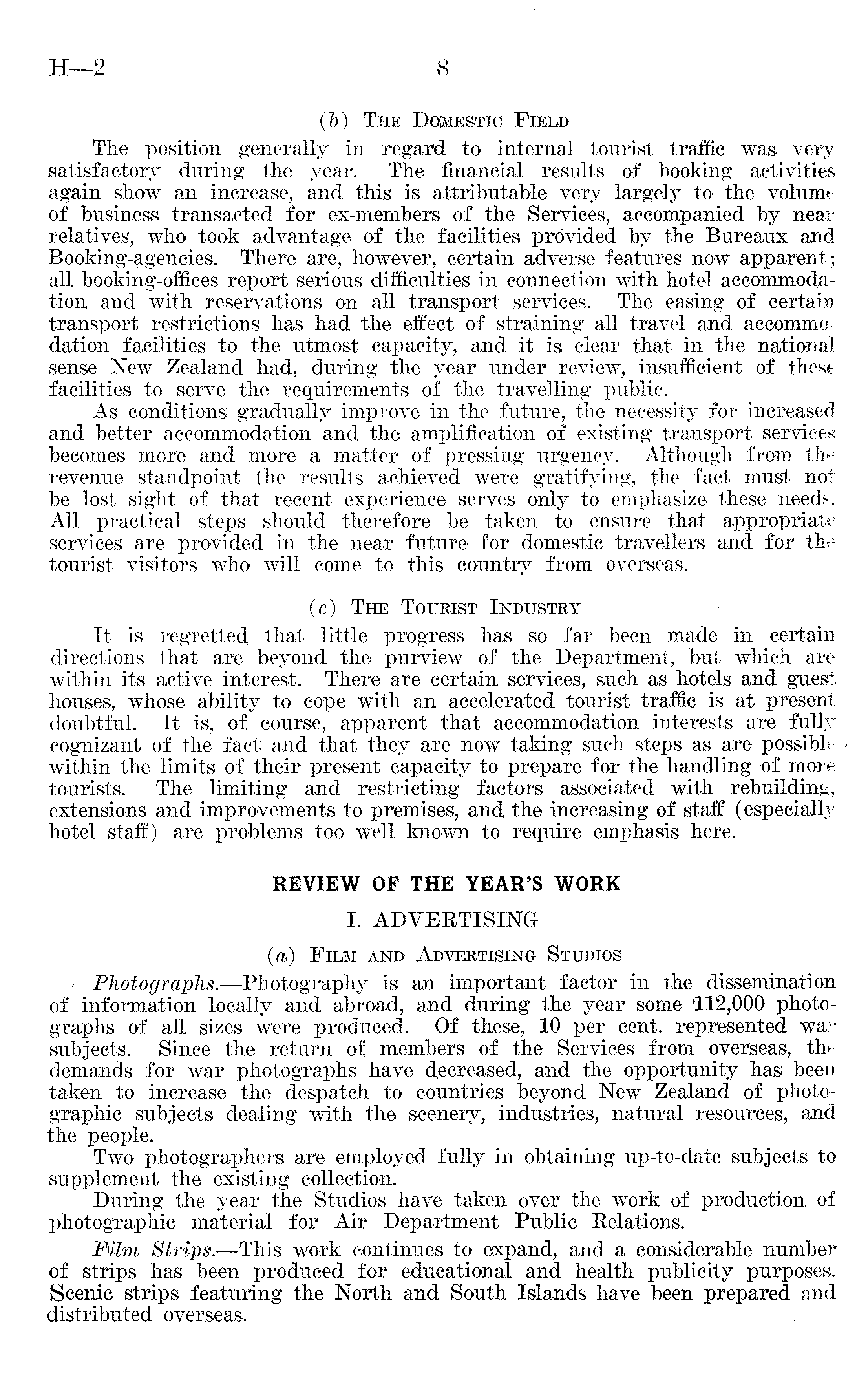 (b) The Domestic Field The position generally in regard to internal tourist traffic was very satisfactory during the year. The financial results of booking activities again show an increase, and this is attributable very largely to the volume of business transacted for ex-members of the Services, accompanied by near relatives, who took advantage of the facilities provided by the Bureaux and Booking-agencies. There are, however, certain adverse features now apparent; all booking-offices report serious difficulties in connection with hotel accommodation and with reservations on all transport services. The easing of certain transport restrictions has. had the effect of straining all travel and accommodation facilities to the utmost capacity, and it is clear that in the national sense New Zealand had, during the year under review, insufficient of these facilities to serve the requirements of the travelling public. As conditions gradually improve in the future, the necessity for increased and better accommodation and the amplification of existing transport services becomes more and more a matter of pressing urgeney. Although from the revenue standpoint the results achieved were gratifying, the fact must not be lost sight of that recent experience serves only to emphasize these needs. All practical steps should therefore be taken to ensure that appropriate services are provided in the near future for domestic travellers and for the tourist visitors who will come to this country from overseas. (>c) The Tourist Industry It is regretted that little progress has so far been made in certain directions that are beyond the purview of the Department, but which are within its active interest. There are certain services, such as hotels and guest houses, whose ability to cope with an accelerated tourist traffic is at present doubtful. It is, of course, apparent that accommodation interests are fully cognizant of the fact and that they are now taking such steps as are possible within the limits of their present capacity to prepare for the handling of more tourists. The limiting and restricting factors associated with rebuilding, extensions and improvements to premises, and the increasing of staff (especially hotel staff) are problems too well known to require emphasis here. REVIEW OF THE YEAR'S WORK I. ADVERTISING (os) Film and Advertising Studios - Photographs.—Photography is an important factor in the dissemination of information locally and abroad, and during the year some '112,000 photographs of all sizes were produced. Of these, 10 per cent, represented war subjects. Since the return of members of the Services from overseas, the demands for war photographs have decreased, and the opportunity has been taken to increase the despatch to countries beyond New Zealand of photographic subjects dealing with the scenery, industries, natural resources, and the people. Two photographers are employed fully in obtaining up-to-date subjects to supplement the existing collection. During the year the Studios have taken over the work of production of photographic material for Air Department Public Relations. Film Strips.—This work continues to expand, and a considerable number of strips has been produced for educational and health publicity purposes. Scenic strips featuring the North and South Islands have been prepared and distributed overseas.