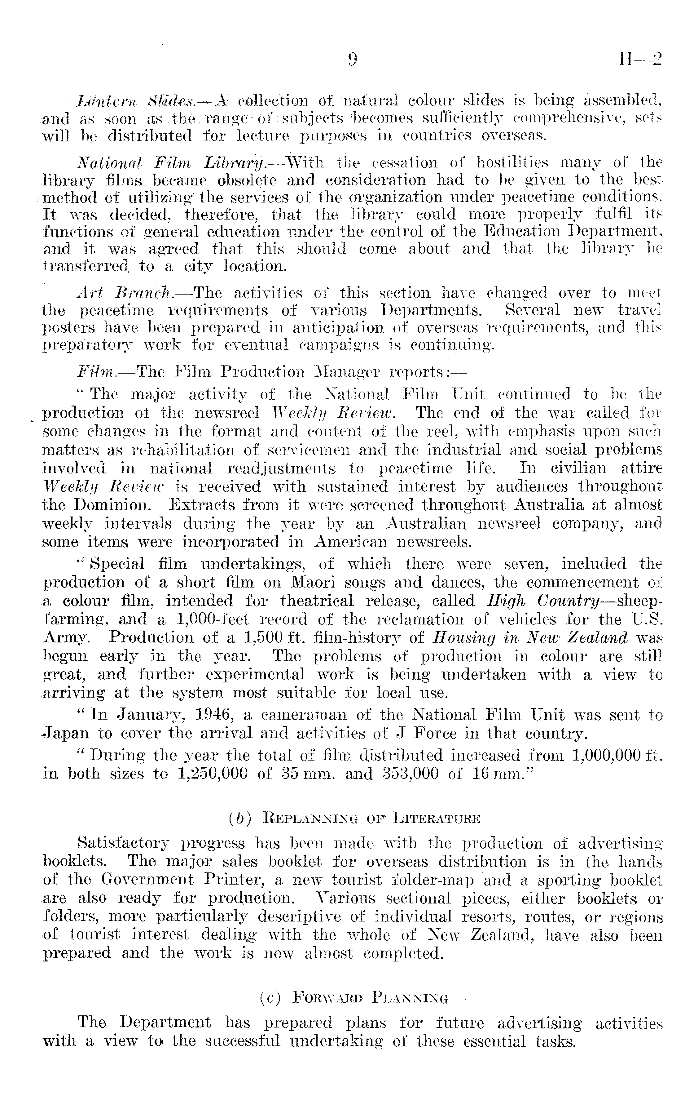 Lantern SUd-ea.—A : collection of natural colour slides is being assembled, and as soon as the . range of: Subjects sufficiently comprehensive, sets will be distributed for lecture purposes in countries overseas. National Film Library.—With the cessation of hostilities many of the library films became obsolete and consideration had to be given to the best method of utilizing the services of the organization under peacetime conditions. It was decided, therefore, that the library could more properly fulfil its functions of general education under the control of the Education Department, arid it was agreed that this should come about and that the library be transferred, to a city location. Art Bra/nick. —The activities of this section have changed over to meet the peacetime requirements of various Departments. Several new travel posters have been prepared in anticipation of overseas requirements, and this preparatory work for eventual Campaigns is continuing. Film.—The Film Production Manager reports:— " The major activity of the National Film Unit continued to be the production of the newsreel Weekly Review. The end of the war called for some changes in the format and content of the reel, with emphasis upon such matters as rehabilitation of servicemen and the industrial and social problems involved in national readjustments to peacetime life. In civilian attire Weekly Review is received with sustained interest by audiences throughout the Dominion. Extracts from it were screened throughout Australia at almost weekly intervals during the year by an Australian newsreel company, and some items were incorporated in American newsreels. " Special film undertakings, of which there were seven, included the production of a short film on Maori songs and dances, the commencement of a colour film, intended for theatrical release, called High Country—sheepfarming, and a 1,000-feet record of the reclamation of vehicles for the U.S. Army. Production of a 1,500 ft. film-history of Housing in New Zealand was begun early in the year. The problems of production in colour are still great, and further experimental work is being undertaken with a view to arriving at the system most suitable for local use. " In January, 1946, a cameraman of the National Film Unit was sent to Japan to cover the arrival and activities of J Force in that country. " During the year the total of film distributed increased from 1,000,000 ft. in both sizes to 1,250,000 of 35 mm. and 353,000 of 16 mm." (5) Eepdanning of Literature Satisfactory progress has been made with the production of advertising "booklets. The major sales booklet for overseas distribution is in the hands of the Government Printer, a new tourist folder-map and a sporting booklet are also ready for production. Various sectional pieces, either booklets or folders, more particularly descriptive of individual resorts, routes, or regions ■of tourist interest dealing with the whole of New Zealand, have also been prepared and the work is now almost completed. (g) Forward Planning - The Department has prepared plans for future advertising activities with a view to the successful undertaking of these essential tasks.