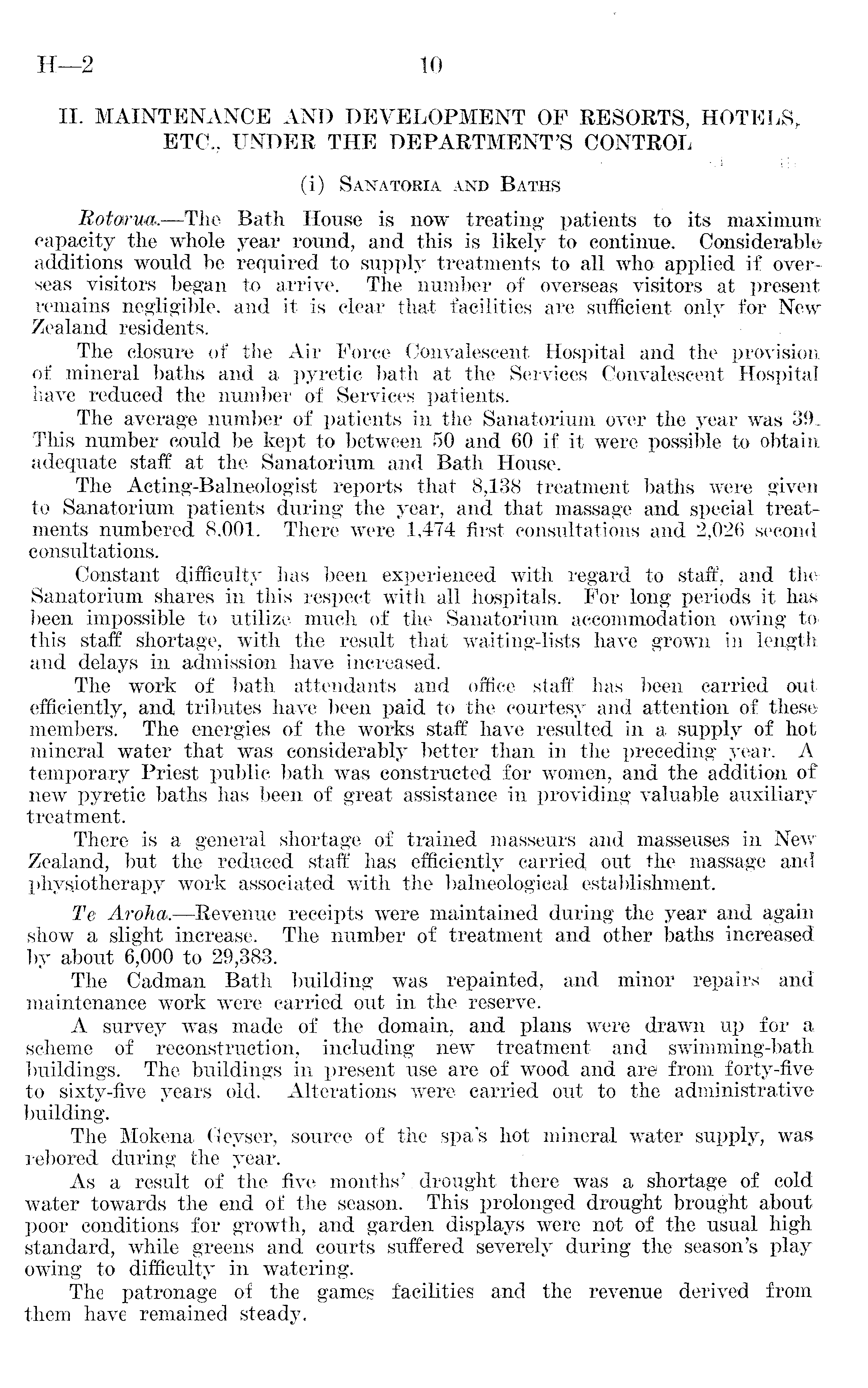 11. MAINTENANCE AND DEVELOPMENT OF RESORTS, HOTELS, ETC., UNDER THE DEPARTMENT'S CONTROL (i) Sanatoria and Baths Rotorva.—The Bath House is now treating patients to its maximum capacity the whole year round, and this is likely to continue. Considerable additions would be required to supply treatments to all who applied if overseas visitors began to arrive. The number of overseas visitors at present remains negligible, and it is clear that facilities are sufficient only for New Zealand residents. The closure of the Air Force Convalescent Hospital and the provision of mineral baths and a pyretic bath at the Services Convalescent Hospital have reduced the number of Services patients. The average number of patients in the Sanatorium over the year was 39. This number could be kept to between 50 and 60 if it were possible to obtain adequate staff at the Sanatorium and Bath House. The Acting-Balneologist reports that 8,138 treatment baths were given to Sanatorium patients during the year, and that massage and special treatments numbered 8,001. There were 1,474 first consultations and 2,026 second consultations. Constant difficulty has been experienced with regard to staff, and the Sanatorium shares in this respect with all hospitals. For long periods it has been impossible to utilize much of the Sanatorium accommodation owing to this staff shortage, with the result that waiting-lists have grown in length and delays in admission have increased. The work of bath attendants and office staff has been carried out efficiently, and tributes have been paid to the courtesy and attention of these members. The energies of the works staff have resulted in a supply of hot mineral water that was considerably better than in the preceding year. A temporary Priest public bath was constructed for women, and the addition of new pyretic baths has been of great assistance in providing valuable auxiliary treatment. There is a general shortage of trained masseurs and masseuses in New Zealand, but the reduced staff has efficiently carried out the massage and physiotherapy work associated with the balneological establishment. Te Aroha.—Revenue receipts were maintained during the year and again show a slight increase. The number of treatment and other baths increased by about 6,000 to 29,383. The Cadman Bath building was repainted, and minor repairs and maintenance work were carried out in the reserve. A survey was made of the domain, and plans were drawn up for a scheme of reconstruction, including new treatment and swimming-bath buildings. The buildings in present use are of wood and are from forty-five to sixty-five years old. Alterations were carried out to the administrative building. The Mokena Geyser, source of the spa's hot mineral water supply, was rebored during the year. As a result of the five months'. drought there was a shortage of cold water towards the end of the season. This prolonged drought brought about poor conditions for growth, and garden displays were not of the usual high standard, while greens and courts suffered severely during the season's play owing to difficulty in watering. The patronage of the games facilities and the revenue derived from them have remained steady.