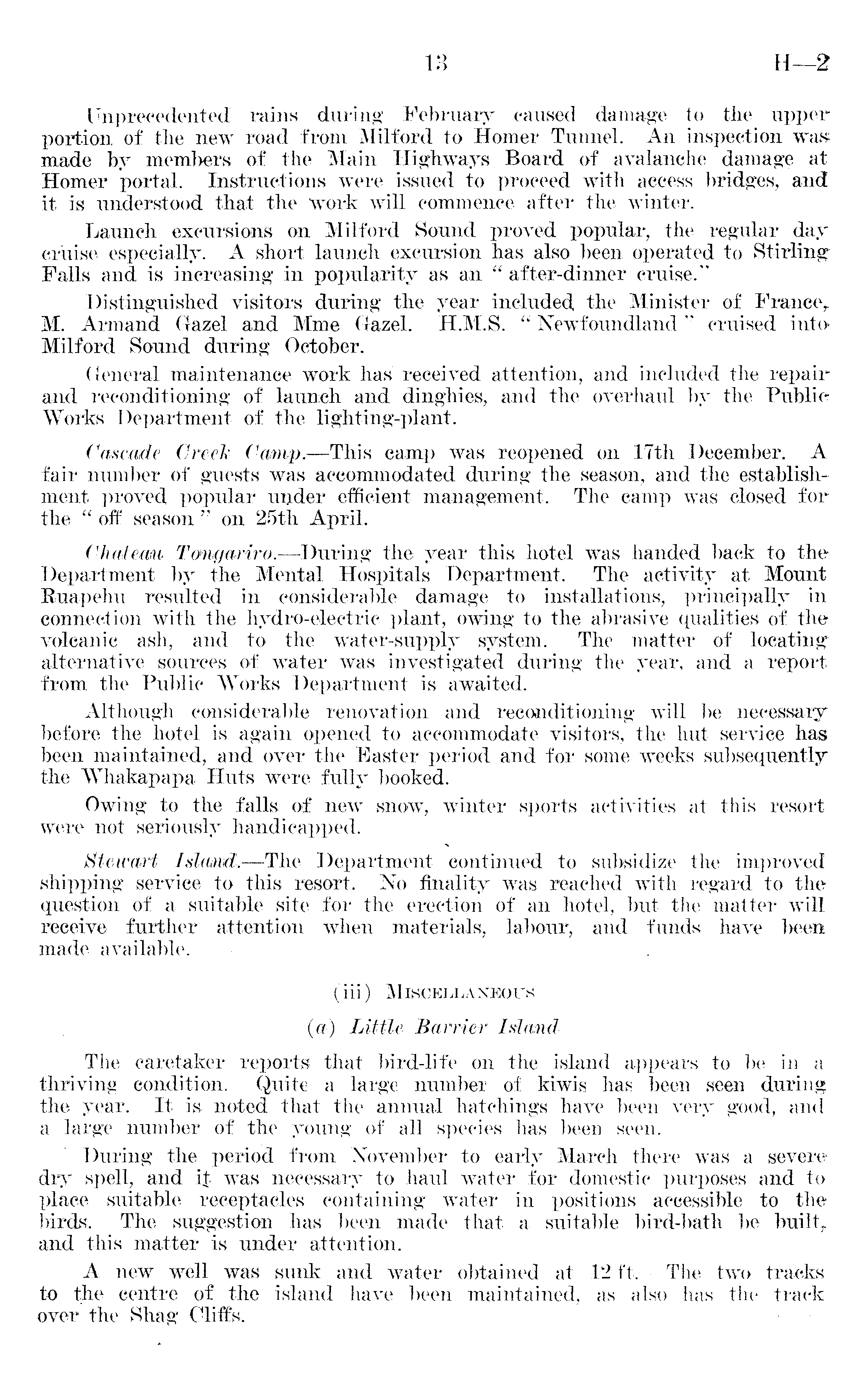Unprecedented rains during February caused damage to the upper portion of the new road from Milford to Homer Tunnel. An inspection was made by members of the Main Highways Board of avalanche damage at Homer portal. Instructions were issued to proceed with access bridges, and it is understood that the work will commence after the winter. Launch excursions on Milford Sound proved popular, the regular day cruise especially. A short launch excursion has also been operated to Stirling Falls and is increasing in popularity as an " after-dinner cruise." Distinguished visitors during the year included, the Minister of France r M. Armand Gazel and Mme Gazel. H.M.S. " Newfoundland" cruised into Milford Sound during October. General maintenance work has received attention, and included the repair and reconditioning of launch and dinghies, and the overhaul by the Public Works Department of the lighting-plant. Cascade, Greek Camp.—This camp was reopened 011 17th December. A fair number of guests was accommodated during the season, and the establishment proved, popular under efficient management. The camp was closed for the " off season " on 25th April. Chateau Tomgariro.—During the year this hotel was handed back to the Department by the Mental Hospitals Department. The activity at Mount Kuapehu resulted in considerable damage to installations, principally in connection with the hydro-electric plant, owing to the abrasive qualities of the volcanic ash, and to the water-supply system. The matter of locating alternative sources of water was investigated during the year, and a report from the Public Works Department is awaited. Although considerable renovation and reconditioning will be necessary before the hotel is again opened to accommodate visitors, the hut service has been maintained, and over the Easter period and for some weeks subsequently the Whakapapa Huts were fully booked. Owing to the falls of new snow, winter sports activities at this resort were not seriously handicapped. Stewart Islawd.—The Department continued to subsidize the improved shipping service to this resort. No finality was reached with regard to the question of a suitable site for the erection of an hotel, but the matter will receive further attention when materials, labour, and funds have been made available. (iii) Miscellaneous ((b) Little Barrier Island The caretaker reports that bird-life on the island appears to be in a thriving condition. Quite a large number of kiwis has been seen during the year. It is noted that the annual hatchings have been very good, and a large number of the young of all species has been seen. - During the period from November to early March there was a severe dry spell, and i£ was necessary to haul water for domestic purposes and to place suitable receptacles containing water in positions accessible to the birds. The suggestion has been made that a suitable bird-bath be built,, and this matter is under attention. A new well was sunk and water obtained at 12 ft. The two tracks to the centre of the island have been maintained, as also has the track over the Shag Cliffs.
