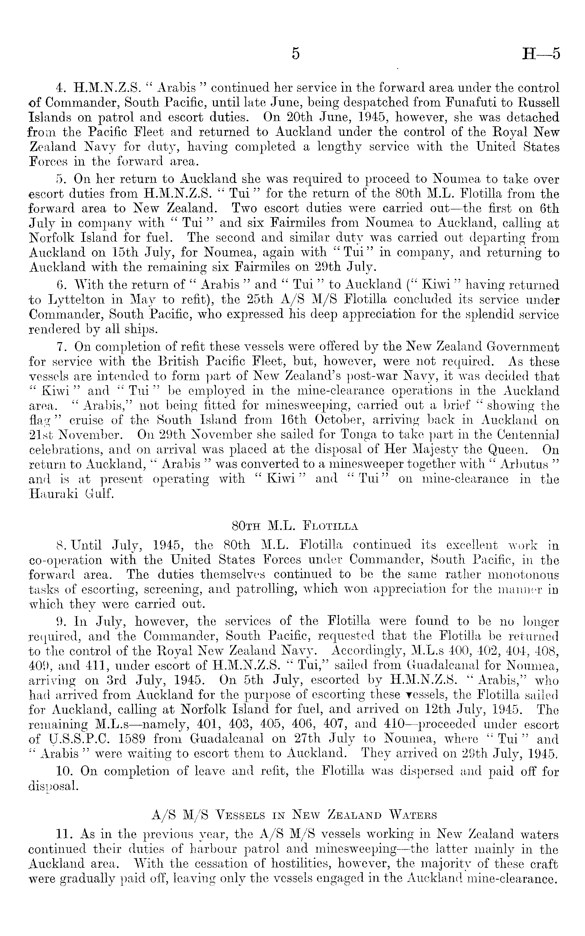 4. H.M.N.Z.S. " Arabis " continued her service in the forward area under the control of Commander, South Pacific, until late June, being despatched from Funafuti to Russell Islands on patrol and escort duties. On 20th June, 1945, however, she was detached from the Pacific Fleet and returned to Auckland under the control of the Royal New Zealand Navy for duty, having completed a lengthy service with the United States Forces in the forward area. 5. On her return to Auckland she was required to proceed to Noumea to take over escort duties from H.M.N.Z.S. " Tui " for the return of the 80th M.L. Flotilla from the forward area to New Zealand. Two escort duties were carried out —the first on 6th July in company with " Tui" and six Fairmiles from Noumea to Auckland, calling at Norfolk Island for fuel. The second and similar duty was carried out departing from Auckland on 15th July, for Noumea, again with " Tui" in company, and returning to Auckland with the remaining six Fairmiles on 29th July. 6. With the return of " Arabis " and " Tui "to Auckland (" Kiwi" having returned to Lyttelton in May to refit), the 25th A/S M/S Flotilla concluded its service under Commander, South Pacific, who expressed his deep appreciation for the splendid service rendered by all ships. 7. On completion of refit these vessels were offered by the New Zealand Government for service with the British Pacific Fleet, but, however, were not required. As these vessels are intended to form part of New Zealand's post-war Navy, it was decided that " Kiwi " and " Tui" be employed in the mine-clearance operations in the Auckland area. " Arabis," not being fitted for minesweeping, carried out a brief " showing the flag " cruise of the South Island from 16th October, arriving back in Auckland on 21st November. On 29th November she sailed for Tonga to take part in the Centennial celebrations, and on arrival was placed at the disposal of Her Majesty the Queen. On return to Auckland, " Arabis " was converted to a minesweeper together with " Arbutus " and is at present operating with "Kiwi" and "Tui" on mine-clearance in the Hauraki Gulf. 80th M.L. Flotilla 8. Until July, 1945, the 80th M.L. Flotilla continued its excellent work in co-operation with the United States Forces under Commander, South Pacific, in the forward area. The duties themselves continued to be the same rather monotonous tasks of escorting, screening, and patrolling, which won appreciation for the manner in which they were carried out. 9. In July, however, the services of the Flotilla were found to be no longer required, and the Commander, South Pacific, requested that the Flotilla be returned to the control of the Royal New Zealand Navy. Accordingly, M.L.s 400, 402, 404, 408, 409, and 411, under escort of H.M.N.Z.S. " Tui," sailed from Guadalcanal for Noumea, arriving on 3rd July, 1945. On sth July, escorted by H.M.N.Z.S. " Arabis," who had arrived from Auckland for the purpose of escorting these vessels, the Flotilla sailed for Auckland, calling at Norfolk Island for fuel, and arrived on 12th July, 1945. The remaining M.L.s —namely, 401, 403, 405, 406, 407, and 410 —proceeded under escort of U.S.S.P.C. 1589 from Guadalcanal on 27th July to Noumea, where " Tui" and " Arabis " were waiting to escort them to Auckland. They arrived on 29th July, 1945. 10. On completion of leave and refit, the Flotilla was dispersed and paid off for disposal. A/S M/S Vessels in New Zealand Waters 11. As in the previous year, the A/S M/S vessels working in New Zealand waters continued their duties of harbour patrol and minesweeping—the latter mainly in the Auckland area. With the cessation of hostilities, however, the majority of these craft were gradually paid off, leaving only the vessels engaged in the Auckland mine-clearance.