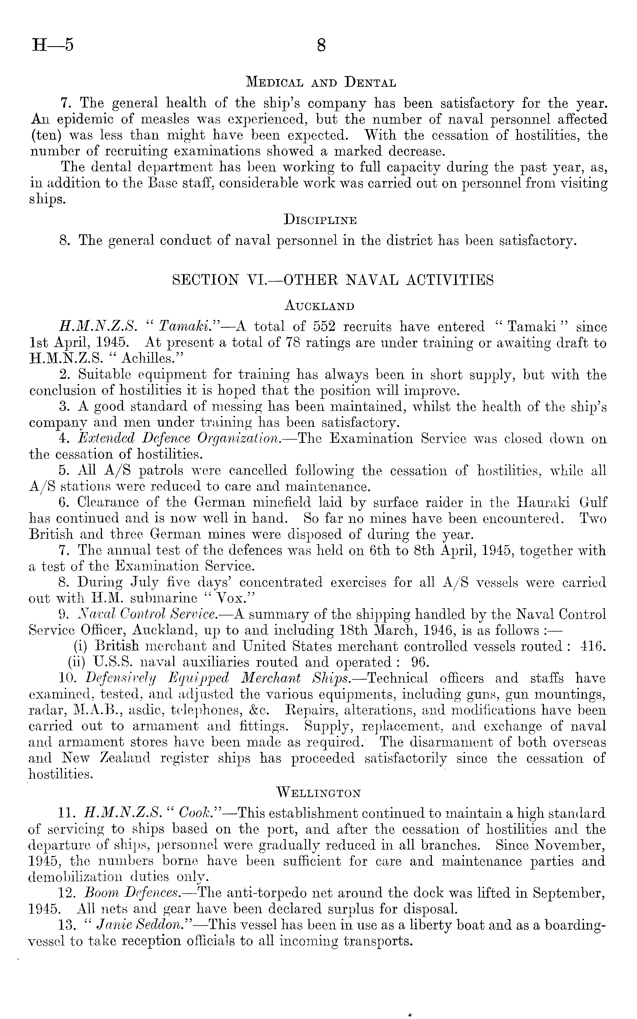 Medical and Dental 7. The general health of the ship's company has been satisfactory for the year. An epidemic of measles was experienced, but the number of naval personnel affected (ten) was less than might have been expected. With the cessation of hostilities, the number of recruiting examinations showed a marked decrease. The dental department has been working to full capacity during the past year, as, in addition to the Base staff, considerable work was carried out on personnel from visiting ships. Discipline 8. The general conduct of naval personnel in the district has been satisfactory. SECTION VI.—OTHER NAVAL ACTIVITIES Auckland H.M.N.Z.S. " Tamaki."—A total of 552 recruits have entered " Tamaki" since Ist April, 1945. At present a total of 78 ratings are under training or awaiting draft to H.M.N.Z.S. " Achilles." 2. Suitable equipment for training has always been in short supply, but with the conclusion of hostilities it is hoped that the position will improve. 3. A good standard of messing has been maintained, whilst the health of the ship's company and men under training has been satisfactory. 4. Extended Defence Organization.—The Examination Service was closed down on the cessation of hostilities. 5. All A/S patrols were cancelled following the cessation of hostilities, while all A/S stations were reduced to care and maintenance. 6. Clearance of the German minefield laid by surface raider in the Hauraki Gulf has continued and is now well in hand. So far no mines have been encountered. Two British and three German mines were disposed of during the year. 7. The annual test of the defences was held on 6th to Bth April, 1945, together with a test of the Examination Service. 8. During July five days' concentrated exercises for all A/S vessels were carried out with H.M. submarine "Vox." 9. Naval Control Service.—A summary of the shipping handled by the Naval Control Service Officer, Auckland, up to and including 18th March, 1946, is as follows : (i) British merchant and United States merchant controlled vessels routed : 416. (ii) U.S.S. naval auxiliaries routed and operated : 96. 10. Defensively Equipped Merchant Ships. —Technical officers and staffs have examined, tested, and adjusted the various equipments, including guns, gun mountings, radar, M.A.8., asdic, telephones, &c. Repairs, alterations, and modifications have been carried out to armament and fittings. Supply, replacement, and exchange of naval and armament stores have been made as required. The disarmament of both overseas and New Zealand register ships has proceeded satisfactorily since the cessation of hostilities. Wellington 11. H.M.N.Z.S. " Cook."—This establishment continued to maintain a high standard of servicing to ships based on the port, and after the cessation of hostilities and the departure of ships, personnel were gradually reduced in all branches. Since November, 1945, the numbers borne have been sufficient for care and maintenance parties and demobilization duties only. 12. Boom Defences. —The anti-torpedo net around the dock was lifted in September, 1945. All nets and gear have been declared surplus for disposal. 13. " Janie Seddon."—This vessel has been in use as a liberty boat and as a boardingvessel to take reception officials to all ineoming / transports.