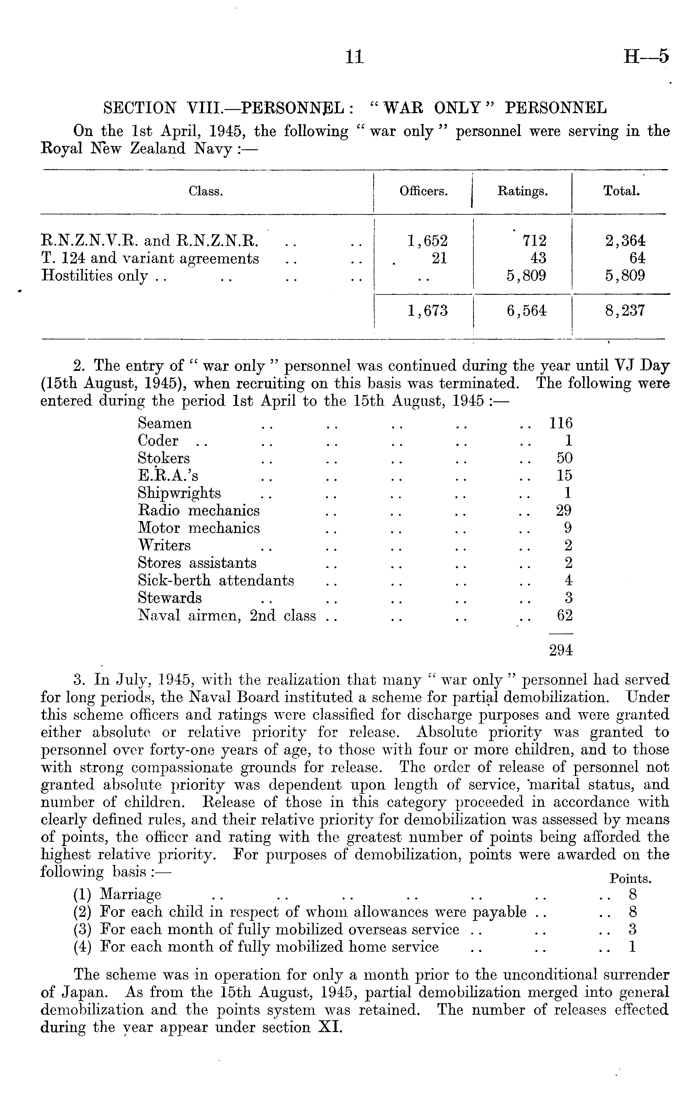 2. The entry of " war only " personnel was continued during the year until VJ Day (15th August, 1945), when recruiting on this basis was terminated. The following were entered during the period Ist April to the 15th August, 1945 : Seamen .. .. .. .. .. 116 Coder .. .. .. .. .. .. 1 Stokers .. .. .. .. 50 E.R.A.'s .. .. .. .. .. 15 Shipwrights .. .. .. .. .. 1 Radio mechanics .. .. .. 29 Motor mechanics .. .. .. .. 9 Writers .. .. .. .. .. 2 Stores assistants .. .. .. .. 2 Sick-berth attendants .. .. .. .. 4 Stewards .. .. .. .. .. 3 Naval airmen, 2nd class .. .. .. .. 62 294 3. In July, 1945, with the realization that many " war only " personnel had served for long periods, the Naval Board instituted a scheme for partial demobilization. Under this scheme officers and ratings were classified for discharge purposes and were granted either absolute or relative priority for release. Absolute priority was granted to personnel over forty-one years of age, to those with four or more children, and to those with strong compassionate grounds for release. The order of release of personnel not granted absolute priority was dependent upon length of service, marital status, and number of children. Release of those in this category proceeded in accordance with clearly defined rules, and their relative priority for demobilization was assessed by means of points, the officer and rating with the greatest number of points being afforded the highest relative priority. For purposes of demobilization, points were awarded on the following basis Points . (1) Marriage .. .. .. .. .. .. .. 8 (2) For each child in respect of whom allowances were payable .. 8 (3) For each month of fully mobilized overseas service .. .. 3 (4) For each month of fully mobilized home service .. .. 1 The scheme was4n operation for only a month prior to the unconditional surrender of Japan. As from the 15th August, 1945, partial demobilization merged into general demobilization and the points system was retained. The number of releases effected during the year appear under section XI.