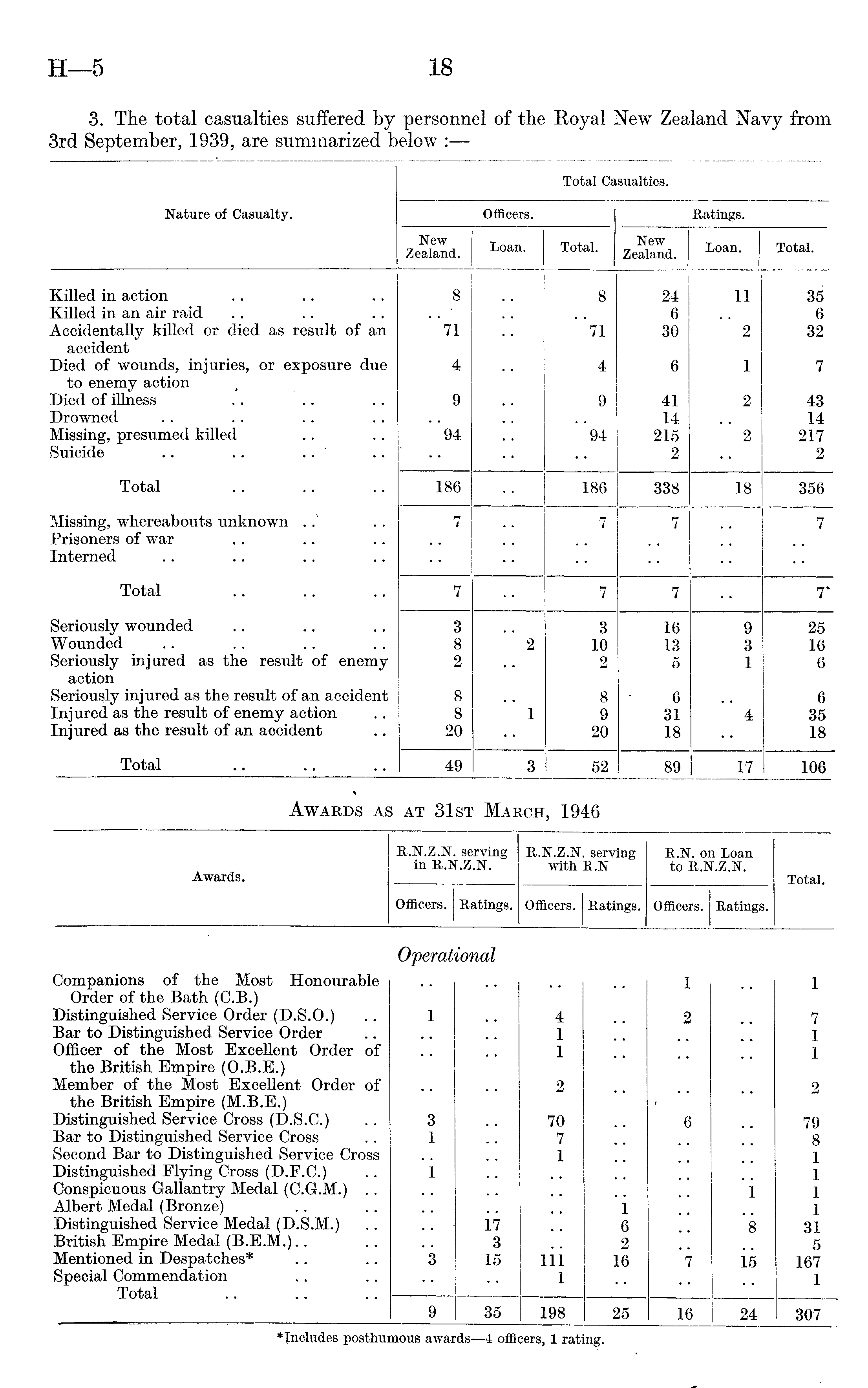 3. The total casualties suffered by personnel of the Royal New Zealand Navy from 3rd September, 1939, are summarized below :