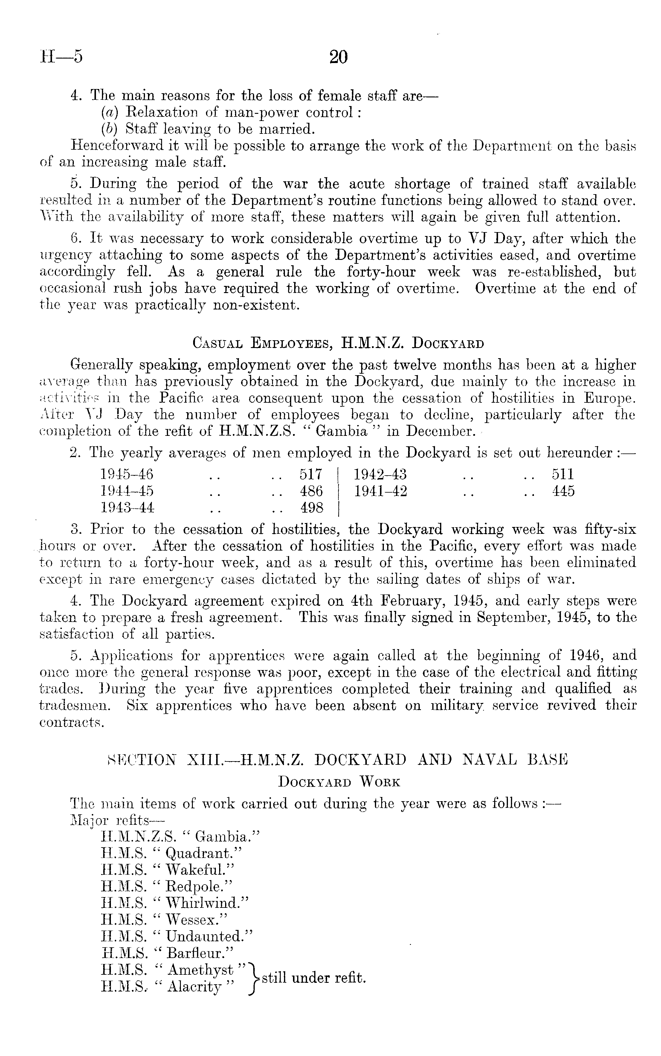 4. The main reasons for the loss of female staff are — (а) Relaxation of man-power control: (б) Staff leaving to be married. Henceforward it will be possible to arrange the work of the Department on the basis of an increasing male staff. 5. During the period of the war the acute shortage of trained staff available resulted in a number of the Department's routine functions being allowed to stand over. With the availability of more staff, these matters will again be given full attention. 6. It was necessary to work considerable overtime up to VJ Day, after which the urgency attaching to some aspects of the Department's activities eased, and overtime accordingly fell. As a general rule the forty-hour week was re-established, but occasional rush jobs have required the working of overtime. Overtime at the end of the year was practically non-existent. Casual Employees, H.M.N.Z. Dockyard Generally speaking, employment over the past twelve months has been at a higher average than has previously obtained in the Dockyard, due mainly to the increase in activities in the Pacific area consequent upon the cessation of hostilities in Europe. After VJ Day the number of employees began to decline, particularly after the completion of the refit of H.M.N.Z.S. " Gambia " in December. - 2. The yearly averages of men employed in the Dockyard is set out hereunder:— 1945-46 .. .. 517 1942-43 .. .. 511 1944-45 .. .. 486 1941-42 .. .. 445 1943-44 .. .. 498 3. Prior to the cessation of hostilities, the Dockyard working week was fifty-six % hours or over. After the cessation of hostilities in the Pacific, every effort was made to return to a forty-hour week, and as a result of this, overtime has been eliminated except in rare emergency cases dictated by the sailing dates of ships of war. 4. The Dockyard agreement expired on 4th February, 1945, and early steps were taken to prepare a fresh agreement. This was finally signed in September, 1945, to the satisfaction -of all parties. 5. Applications for apprentices were again called at the beginning of 1946, and once more the general response was poor, except in the case of the electrical and fitting trades. During the year five apprentices completed their training and qualified as tradesmen. Six apprentices who have been absent on military service revived their contracts. SECTION XIII.—H.M.N.Z. DOCKYARD AND NAVAL BASE Dockyard Work The main items of work carried out during the year were as follows : Major refits — " H.M.N.Z.S. " Gambia." H.M.S. " Quadrant." H.M.S. " Wakeful." H.M.S. " Redpole." H.M.S. " Whirlwind." H.M.S. " Wessex." H.M.S. " Undaunted." H.M.S. " Barfleur."