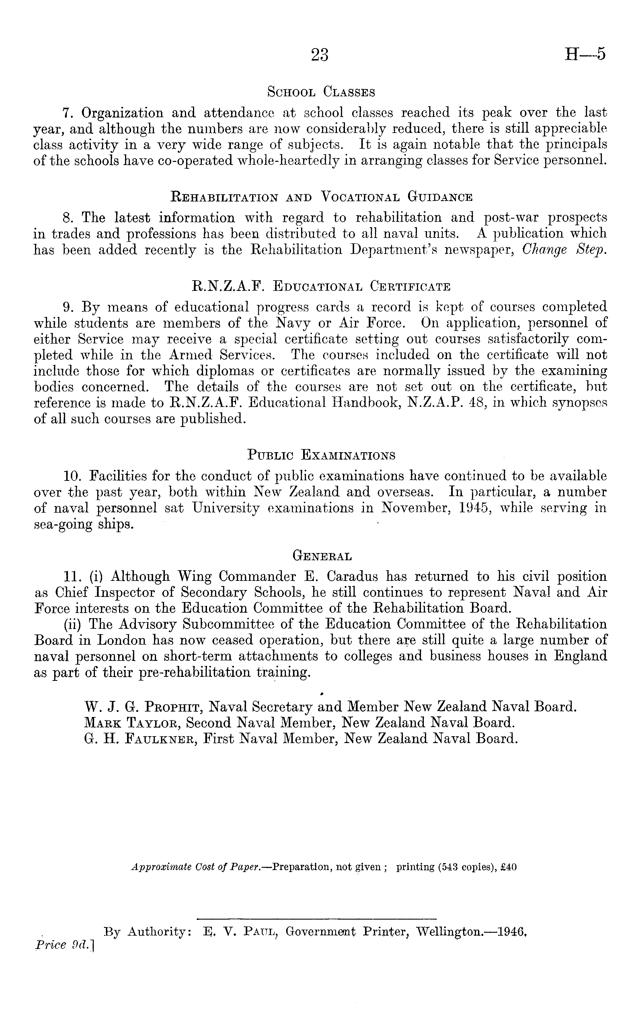 School Classes 7. Organization and attendance at school classes reached its peak over the last year, and although the numbers are now considerably reduced, there is still appreciable class activity in a very wide range of subjects. It is again notable that the principals of the schools have co-operated whole-heartedly in arranging classes for Service personnel. Rehabilitation and Vocational Guidance 8. The latest information with regard to rehabilitation and post-war prospects in trades and professions has been distributed to all naval units. A publication which has been added recently is the Rehabilitation Department's newspaper, Change Step. R.N.Z.A.F. Educational Certificate 9. By means of educational progress cards a record is kept of courses completed while students are members of the Navy or Air Force. On application, personnel of either Service may receive a special certificate setting out courses satisfactorily completed while in the Armed Services. The courses included on the certificate will not include those for which diplomas or certificates are normally issued by the examining bodies concerned. The details of the courses are not set out on the certificate, but reference is made to R.N.Z.A.F. Educational Handbook, N.Z.A.P. 48, in which synopses of all such courses are published. Public Examinations 10. Facilities for the conduct of public examinations have continued to be available over the past year, both within New Zealand and overseas. In particular, a number of naval personnel sat University examinations in November, 1945, while serving in sea-going ships. General 11. (i) Although Wing Commander E. Caradus has returned to his civil position as Chief Inspector of Secondary Schools, he still continues to represent Naval and Air Force interests on the Education Committee of the Rehabilitation Board. (ii) The Advisory Subcommittee of the Education Committee of the Rehabilitation Board in London has now ceased operation, but there are still quite a large number of naval personnel on short-term attachments to colleges and business houses in England as part of their pre-rehabilitation training. W. J. G. Prophit, Naval Secretary and Member New Zealand Naval Board. Mark Taylor, Second Naval Member, New Zealand Naval Board. G. H. Faulkner, First Naval Member, New Zealand Naval Board. Approximate Cost of Paper.Preparation, not given ; printing (543 copies), £4O