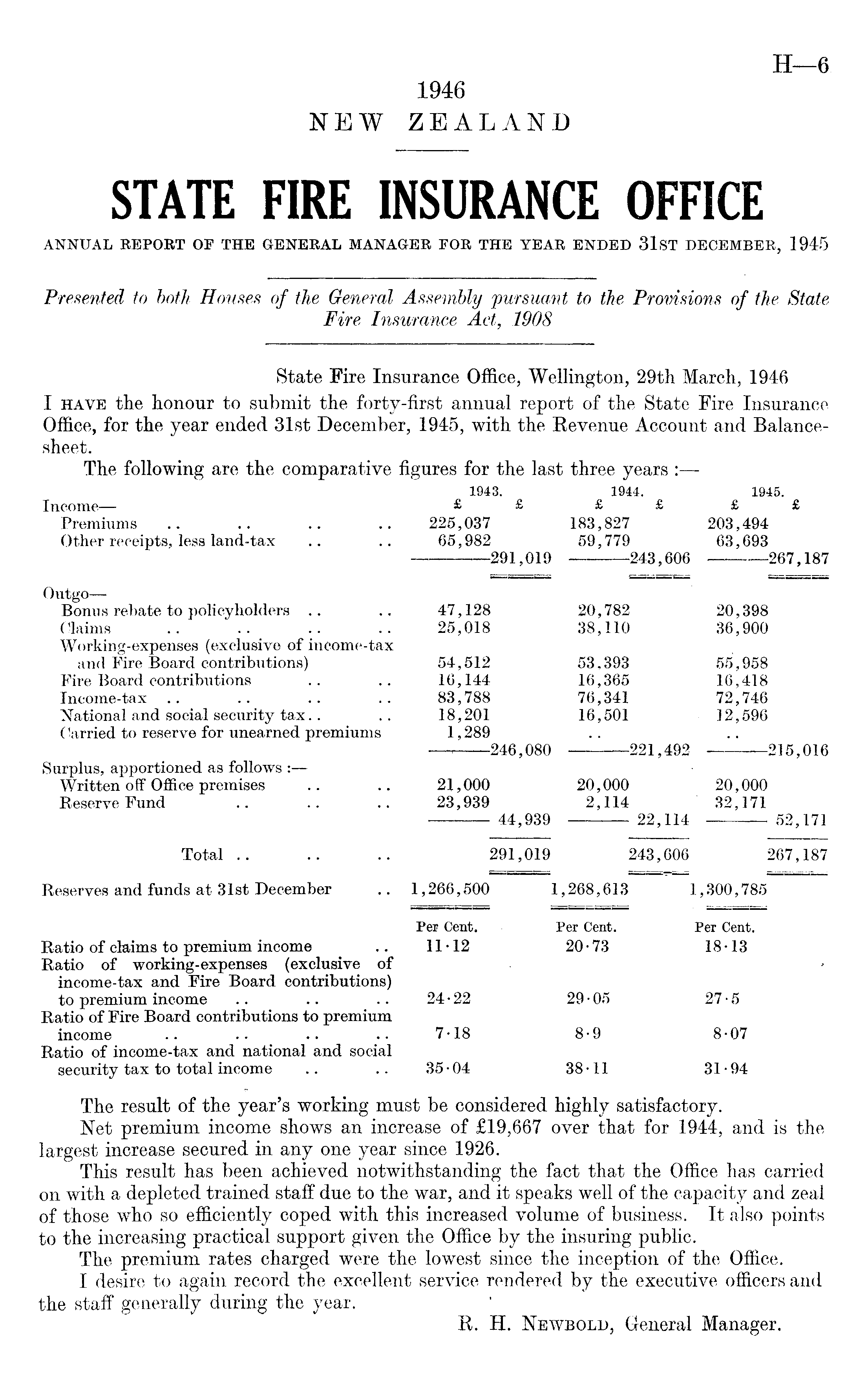 State Fire Insurance Office, Wellington, 29th March, 1946 I have the honour to submit the forty-first annual report of the State Fire Insurance Office, for the year ended 31st December, 1945, with the Revenue Account and Balancesheet. The following are the comparative figures for the last three years : 1943. 1944. 1945. Income— £ £ £ £ £ £ Premiums .. .. .. .. 225,037 183,827 203,494 Other receipts, less land-tax .. .. 65,982 59,779 63,693 291,019 243,606 267,187 Outgo— Bonus rebate to policyholders .. .. 47,128 20,782 20,398 Claims .. .. .. .. 25,018 38,110 36,900 Working-expenses (exclusive of income-tax and Fire Board contributions) 54,512 53,393 55,958 Fire Board contributions .. .. 16,144 16,365 16,418 Income-tax .. .. .. .. 83,788 76,341 72,746 National and social security tax.. .. 18,201 16,501 12,596 Carried to reserve for unearned premiums 1,289 —r 246,080 221,492 215,016 Surplus, apportioned as follows : Written off Office premises .. .. 21,000 20,000 20,000 Reserve Fund .. .. .. 23,939 2,114 32,171 44,939 22,114 52,171 Total .. .. .. 291,019 243,606 267,187 Reserves and funds at 31st December .. 1,266,500 1,268,613 1,300,785 Per Cent. Per Cent. Per Cent. Ratio of claims to premium income .. 11-12 20-73 18-13 Ratio of working-expenses (exclusive of income-tax and Fire Board contributions) to premium income .. .. .. 24-22 29-05 27-5 Ratio of Fire Board contributions to premium income .. .. .. .. 7-18 8-9 8-07 Ratio of income-tax and national and social security tax to total income .. .. 35-04 38-11 31-94 The result of the year's working must be considered highly satisfactory. Net premium income shows an increase of £19,667 over that for 1944, and is the largest increase secured in any one year since 1926. This result has been achieved notwithstanding the fact that the Office has carried on with a depleted trained staff due to the war, and it speaks well of the capacity and zeal of those who so efficiently coped with this increased volume of business. It also points to the increasing practical support given the Office by the insuring public. The premium rates charged were the lowest since the inception of the Office. I desire to again record the excellent service rendered by the executive officers and the staff generally during the year. R. H. Newbold, General Manager.