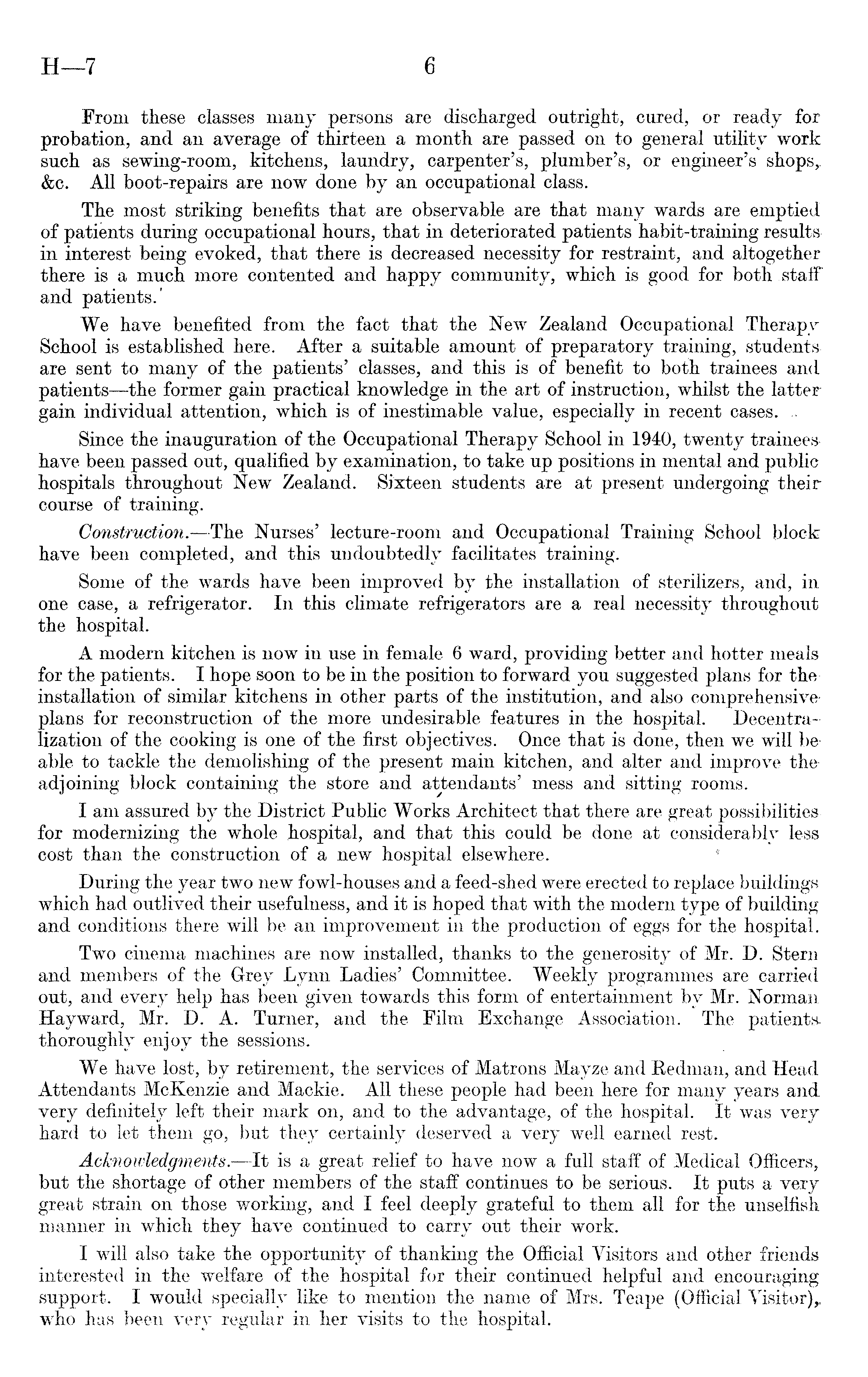 From these classes many persons are discharged outright, cured, or ready for probation, and an average of thirteen a month are passed on to general utility work such as sewing-room, kitchens, laundry, carpenter's, plumber's, or engineer's shops, &c. All boot-repairs are now done by an occupational class. The most striking benefits that are observable are that many wards are emptied of patients during occupational hours, that in deteriorated patients habit-training results in interest being evoked, that there is decreased necessity for restraint, and altogether there is a much more contented and happy community, which is good for both staff and patients.' We have benefited from the fact that the New Zealand Occupational Therapy School is established here. After a suitable amount of preparatory training, students are sent to many of the patients' classes, and this is of benefit to both trainees and patients —the former gain practical knowledge in the art of instruction, whilst the latter gain individual attention, which is of inestimable value, especially in recent cases. Since the inauguration of the Occupational Therapy School in 1940, twenty traineeshave been passed out, qualified by examination, to take up positions in mental and public hospitals throughout New Zealand. Sixteen students are at present undergoing their course of training. Construction. —The Nurses' lecture-room and Occupational Training School block have been completed, and this undoubtedly facilitates training. Some of the wards have been improved by the installation of sterilizers, and, in one case, a refrigerator. In this climate refrigerators are a real necessity throughout the hospital. A modern kitchen is now in use in female 6 ward, providing better and hotter meals for the patients. I hope soon to be in the position to forward you suggested plans for the installation of similar kitchens in other parts of the institution, and also comprehensiveplans for reconstruction of the more undesirable features in the hospital. Decentralization of the cooking is one of the first objectives. Once that is done, then we will beable to tackle the demolishing of the present main kitchen, and alter and improve theadjoining block containing the store and attendants' mess and sitting rooms. I am assured by the District Public Works Architect that there are great possibilities for modernizing the whole hospital, and that this could be done at considerably less cost than the construction of a new hospital elsewhere. During the year two new fowl-houses and a feed-shed were erected to replace buildings which had outlived their usefulness, and it is hoped that with the modern type of building and conditions there will be an improvement in the production of eggs for the hospital. Two cinema machines are now installed, thanks to the generosity of Mr. D. Stern and members of the Grey Lynn Ladies' Committee. Weekly programmes are carried out, and every help has been given towards this form of entertainment by Mr. Norman Hayward, Mr. D. A. Turner, and the Film Exchange Association. The patients* thoroughly enjoy the sessions. We have lost, by retirement, the services of Matrons Mayze and Redman, and Head Attendants McKenzie and Mackie. All these people had been here for many years and very definitely left their mark on, and to the advantage, of the hospital. It was very hard to let them go, but they certainly deserved a very well earned rest. Acknowledgments. —It is a great relief to have now a full staff of Medical Officers,, but the shortage of other members of the staff continues to be serious. It puts a very great strain on those working, and I feel deeply grateful to them all for the unselfish manner in which they have continued to carry out their work. I will also take the opportunity of thanking the Official Visitors and other friends, interested in the welfare of the hospital for their continued helpful and encouraging support. I would specially like to mention the name of Mrs. Teape (Official Visitor), who has been very regular in her visits to the hospital.
