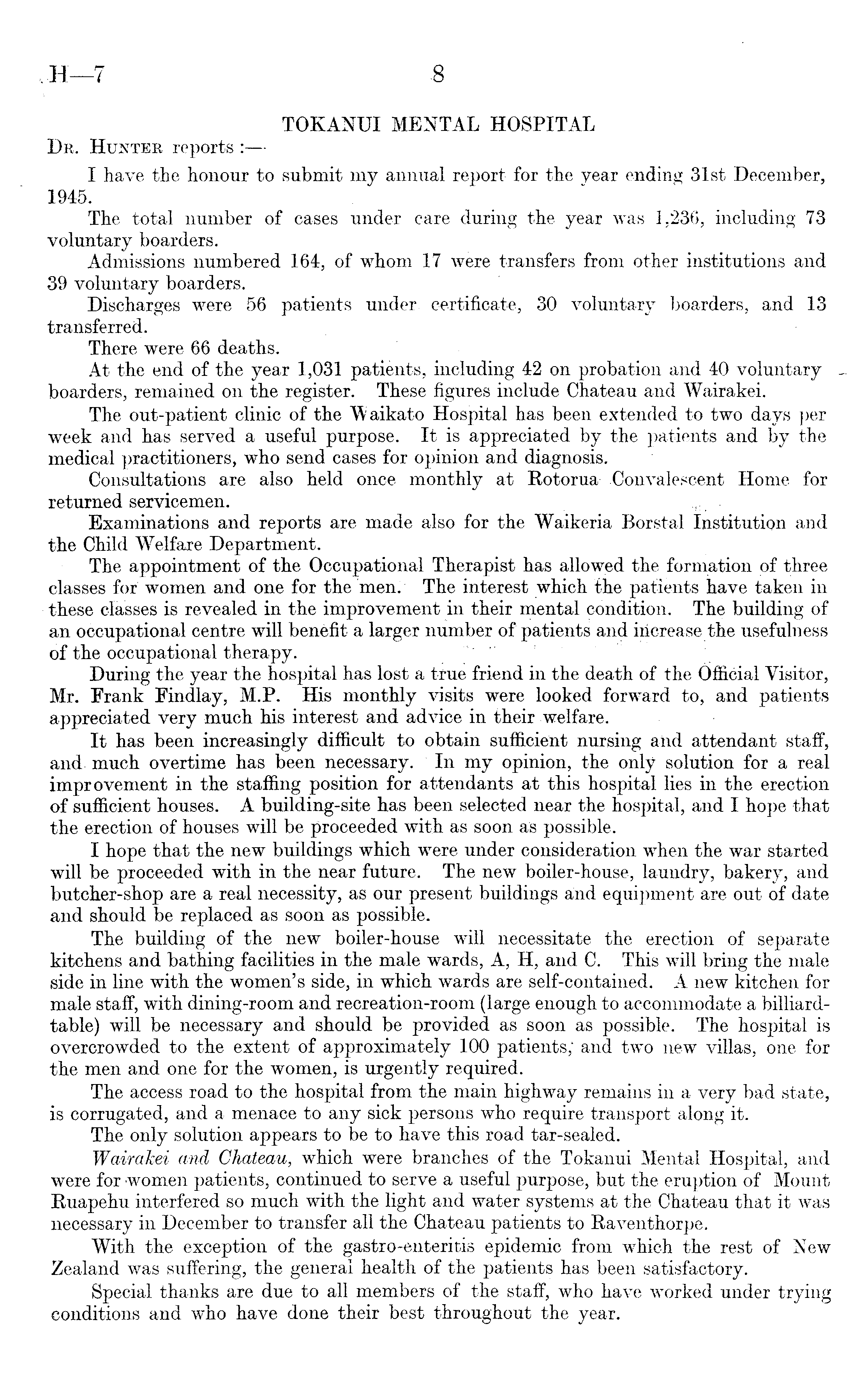 TOKANUI MENTAL HOSPITAL Dr. Hunter reports : I have the honour to submit my annual report for the year ending 31st December, 1945. The total number of cases under care during the year was 1,236, including 73 voluntary boarders. Admissions numbered 164, of whom 17 were transfers from other institutions and 39 voluntary boarders. Discharges were 56 patients under certificate, 30 voluntary boarders, and 13 transferred. There were 66 deaths. At the end of the year 1,031 patients, including 42 on probation and 40 voluntary boarders, remained on the register. These figures include Chateau and Wairakei. The out-patient clinic of the W aikato Hospital has been extended to two days per week and has served a useful purpose. It is appreciated by the patients and by the medical practitioners, who send cases for opinion and diagnosis. Consultations are also held once monthly at Rotorua Convalescent Home for returned servicemen. r: Examinations and reports are made also for the Waikeria Borstal Institution and the Child Welfare Department. The appointment of the Occupational Therapist has allowed the formation of three classes for women and one for the men. The interest which the patients have taken in these classes is revealed in the improvement in their mental condition. The building of an occupational centre will benefit a larger number of patients and increase the usefulness of the occupational therapy. During the year the hospital has lost a true friend in the death of the Official Visitor, Mr. Frank Findlay. M.P. His monthly visits were looked forward to, and patients appreciated very much his interest and advice in their welfare. It has been increasingly difficult to obtain sufficient nursing and attendant staff, and much overtime has been necessary. In my opinion, the only solution for a real improvement in the staffing position for attendants at this hospital lies in the erection of sufficient houses. A building-site has been selected near the hospital, and I hope that the erection of houses will be proceeded with as soon as possible. I hope that the new buildings which were under consideration when the war started will be proceeded with in the near future. The new boiler-house, laundry, bakery, and butcher-shop are a real necessity, as our present buildings and equipment are out of date and should be replaced as soon as possible. The building of the new boiler-house will necessitate the erection of separate kitchens and bathing facilities in the male wards, A, H, and C. This will bring the male side in line with the women's side, in which wards are self-contained. A new kitchen for male staff, with dining-room and recreation-room (large enough to accommodate a billiardtable) will be necessary and should be provided as soon as possible. The hospital is overcrowded to the extent of approximately 100 patients,' and two new villas, one for the men and one for the women, is urgently required. The access road to the hospital from the main highway remains in a very bad state, is corrugated, and a menace to any sick persons who require transport along it. The only solution appears to be to have this road tar-sealed. Wairakei and Chateau, which were branches of the Tokanui Mental Hospital, and were for women patients, continued to serve a useful purpose, but the eruption of Mount Ruapehu interfered so much with the light and water systems at the Chateau that it was necessary in December to transfer all the Chateau patients to Raventhorpe. With the exception of the gastro-enteritis epidemic from which the rest of New Zealand was suffering, the general health of the patients has been satisfactory. Special thanks are due to all members of the staff, who have worked under trying conditions and who have done their best throughout the year.
