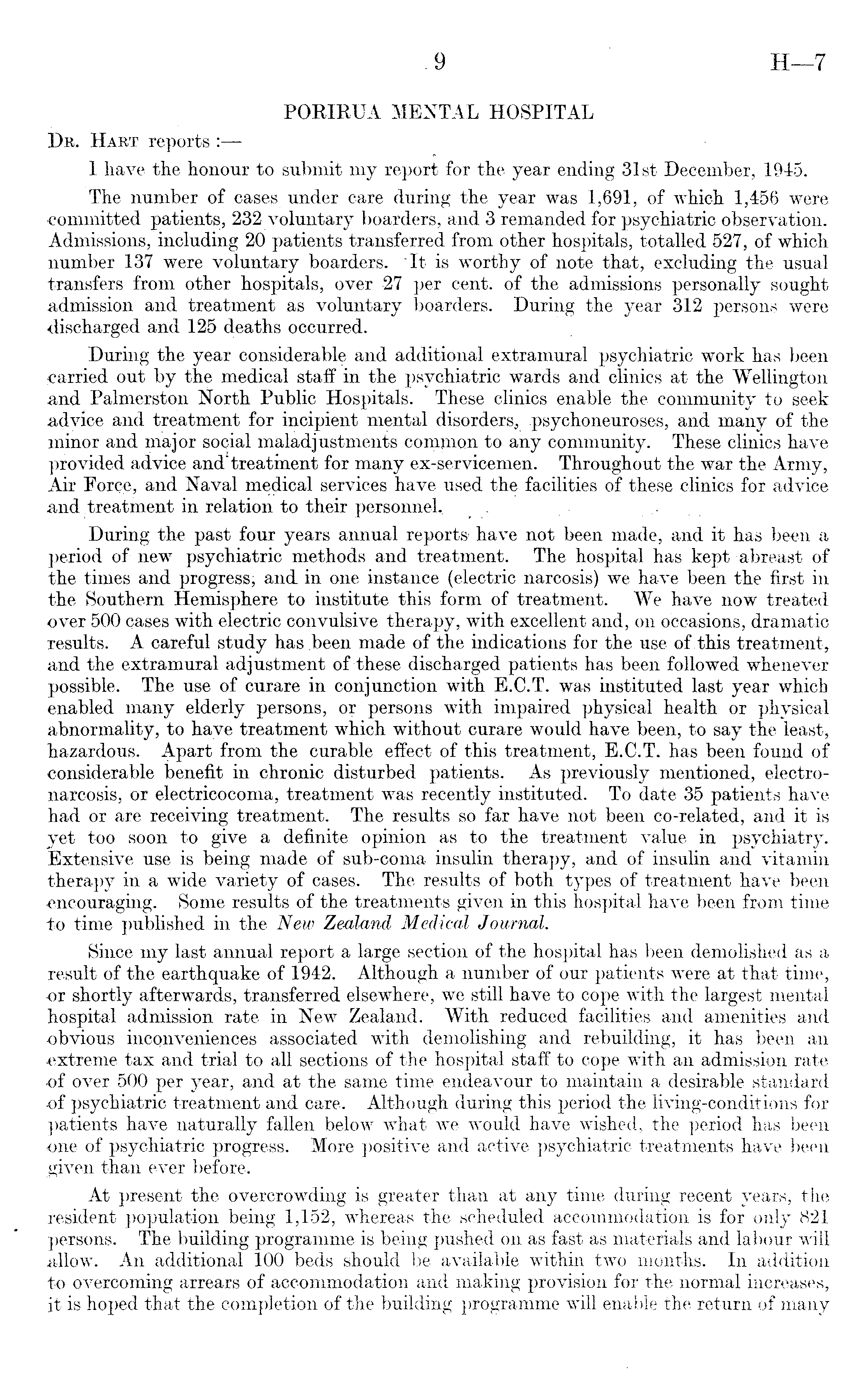 PORIRUA MENTAL HOSPITAL Dr. Hart reports : I have the honour to submit my report for the year ending 31st December, 1945. The number of cases under care during the year was 1,691, of which 1,456 were committed patients, 232 voluntary boarders, and 3 remanded for psychiatric observation. Admissions, including 20 patients transferred from other hospitals, totalled 527, of which number 137 were voluntary boarders. "It is worthy of note that, excluding the usual transfers from other hospitals, over 27 per cent, of the admissions personally sought admission and treatment as voluntary boarders. During the year 312 persons were discharged and 125 deaths occurred. During the year considerable and additional extramural psychiatric work has been carried out by the medical staff in the psychiatric wards and clinics at the Wellington and Palmerston North Public Hospitals. These clinics enable the community to seek advice and treatment for incipient mental disorders, psychoneuroses, and many of the minor and major social maladjustments common to any community. These clinics have provided advice and'treatment for many ex-servicemen. Throughout the war the Army, Air Force, and Naval medical services have used the facilities of these clinics for advice and treatment in relation to their personnel^ During the past four years annual reports' have not been made, and it has been a period of new psychiatric methods and treatment. The hospital has kept abreast of the times and progress, and in one instance (electric narcosis) we have been the first in the Southern Hemisphere to institute this form of treatment. We have now treated over 500 cases with electric convulsive therapy, with excellent and, on occasions, dramatic results. A careful study has been made of the indications for the use of this treatment, and the extramural adjustment of these discharged patients has been followed whenever possible. The use of curare in conjunction with E.C.T. was instituted last year which enabled many elderly persons, or persons with impaired physical health or physical abnormality, to have treatment which without curare would have been, to say the least, hazardous. Apart from the curable effect of this treatment, E.C.T. has been found of considerable benefit in chronic disturbed patients. As previously mentioned, electronarcosis, or electricocoma, treatment was recently instituted. To date 35 patients have had or are receiving treatment. The results so far have not been co-related, and it is yet too soon to give a definite opinion as to the treatment value in psychiatry. Extensive use is being made of sub-coma insulin therapy, and of insulin and vitamin therapy in a wide variety of cases. The results of both types of treatment have been encouraging. Some results of the treatments given in this hospital have been from time to time published in the New Zealand Medical Journal. Since my last annual report a large section of the hospital has been demolished as a result of the earthquake of 1942. Although a number of our patients were at that time, •or shortly afterwards, transferred elsewhere, we still have to cope with the largest mental hospital admission rate in New Zealand. With reduced facilities and amenities and obvious inconveniences associated with demolishing and rebuilding, it has been an extreme tax and trial to all sections of the hospital staff to cope with an admission rate of over 500 per year, and at the same time endeavour to maintain a desirable standard of psychiatric treatment and care. Although during this period the living-conditions for patients have naturally fallen below what we would have wished, the period has been one of psychiatric progress. More positive and active psychiatric treatments have been given than ever before. At present the overcrowding is greater than at any time during recent years, the resident population being 1,152, whereas the scheduled accommodation is for only 821 persons. The building programme is being pushed on as fast as materials and labour will allow. An additional 100 beds should be available within two months. In addition to overcoming arrears of accommodation and making provision for the normal increases, it is hoped that the completion of the building programme will enable the return of many