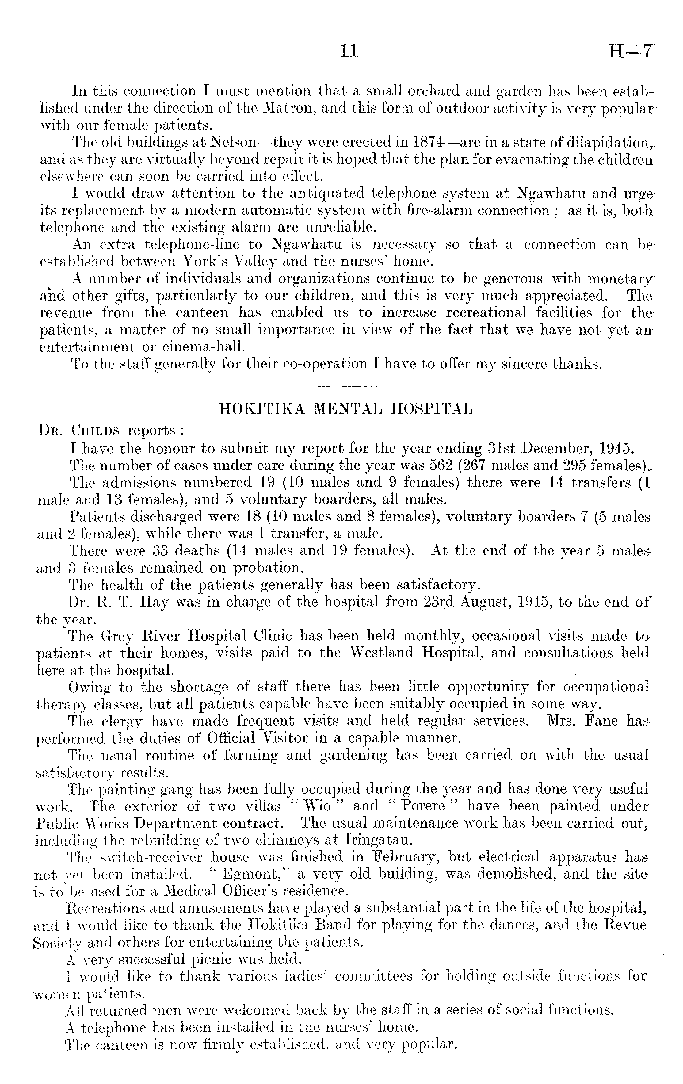 HOKITIKA MENTAL HOSPITAL Dr. Childs reports : I have the honour to submit my report for the year ending 31st December, 1945. The number of cases under care during the year was 562 (267 males and 295 females)^ The admissions numbered 19 (10 males and 9 females) there were 14 transfers (1 male and 13 females), and 5 voluntary boarders, all males. Patients discharged were 18 (10 males and 8 females), voluntary boarders 7 (5 malea and 2 females), while there was 1 transfer, a male. There were 33 deaths (14 males and 19 females). At the end of the year 5 males and 3 females remained on probation. The health of the patients generally has been satisfactory. Dr. R. T. Hay was in charge of the hospital from 23rd August, 1945, to the end of the year. The Grey River Hospital Clinic has been held monthly, occasional visits made to patients at their homes, visits paid to the Westland Hospital, and consultations held here at the hospital. Owing to the shortage of staff there has been little opportunity for occupational therapy classes, but all patients capable have been suitably occupied in some way. The clergy have made frequent visits and held regular services. Mrs. Fane has performed the duties of Official Visitor in a capable manner. The usual routine of farming and gardening has been carried on with the usual satisfactory results. The painting gang has been fully occupied during the year and has done very useful work. The exterior of two villas " Wio " and " Porere " have been painted under Public Works Department contract. The usual maintenance work has been carriedoourt r including the rebuilding of two chimneys at Iringatau. The switch-receiver house was finished in February, but electrical apparatus has not yet been installed. " Egmont," a very old building, was demolished, and the site is to be used for a Medical Officer's residence. Recreations and amusements have played a substantial part in the life of the hospital, and I would like to thank the Hokitika Band for playing for the dances, and the Revue Society and others for entertaining the patients. A very successful picnic was held. I would like to thank various ladies' committees for holding outside functions for women patients. All returned men were welcomed back by the staff in a series of social functions. A telephone has been installed in the nurses' home, The canteen is now firmly established, and very popular.