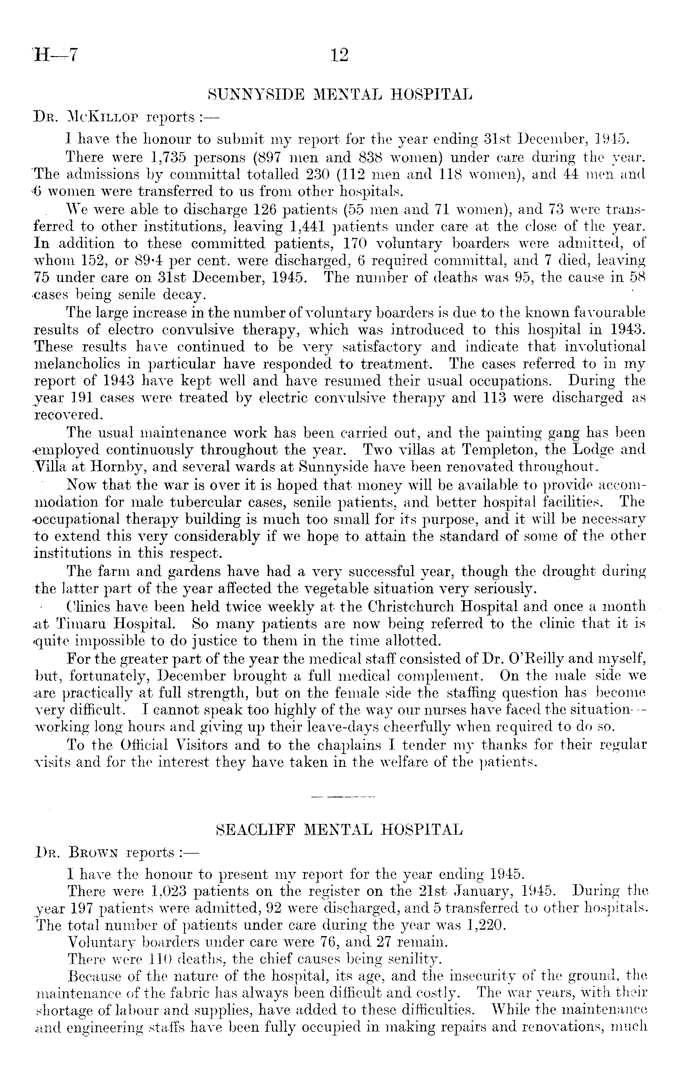 SUNNYSIDE MENTAL HOSPITAL Dr. McKillop reports : I have the honour to submit my report for the year ending 31st December, 1945. There were 1,735 persons (897 men and 838 women) under care during the year. The admissions by committal totalled 230 (112 men and 118 women), and 44 men and •6 women were transferred to us from other hospitals. We were able to discharge 126 patients (55 men and 71 women), and 73 were transferred to other institutions, leaving 1,441 patients under care at the close of the year. In addition to these committed patients, 170 voluntary boarders were admitted, of whom 152, or 89*4 per cent, were discharged, 6 required committal, and 7 died, leaving 75 under care on 31st December, 1945. The number of deaths was 95, the cause in 58 •cases being senile decay. The large increase in the number of voluntary boarders is due to the known favourable results of electro convulsive therapy, which was introduced to this hospital in 1943. These results have continued to be very satisfactory and indicate that involutional melancholies in particular have responded to treatment. The cases referred to in my report of 1943 have kept well and have resumed their usual occupations. During the year 191 cases were treated by electric convulsive therapy and 113 were discharged as recovered. The usual maintenance work has been carried out, and the painting gang has been •employed continuously throughout the year. Two villas at Templeton, the Lodge and .Villa at Hornby, and several wards at Sunny side have been renovated throughout. Now that the war is over it is hoped that money will be available to provide accommodation for male tubercular cases, senile patients, and better hospital facilities. The •occupational therapy building is much too small for its purpose, and it will be necessary to extend this very considerably if we hope to attain the standard of some of the other institutions in this respect. The farm and gardens have had a very successful year, though the drought during "the latter part of the year affected the vegetable situation very seriously. Clinics have been held twice weekly at the Christchurch Hospital and once a month •at Timaru Hospital. So many patients are now being referred to the clinic that it is •quite impossible to do justice to them in the time allotted. For the greater part of the year the medical staff consisted of Dr. O'Reilly and myself, but, fortunately, December brought a full medical complement. On the male side we are practically at full strength, but on the female side the staffing question has become very difficult. I cannot speak too highly of the way our nurses have faced the situationworking long hours and giving up their leave-days cheerfully when required to do so. To the Official Visitors and to the chaplains I tender my thanks for their regular visits and for the interest they have taken in the welfare of the patients.