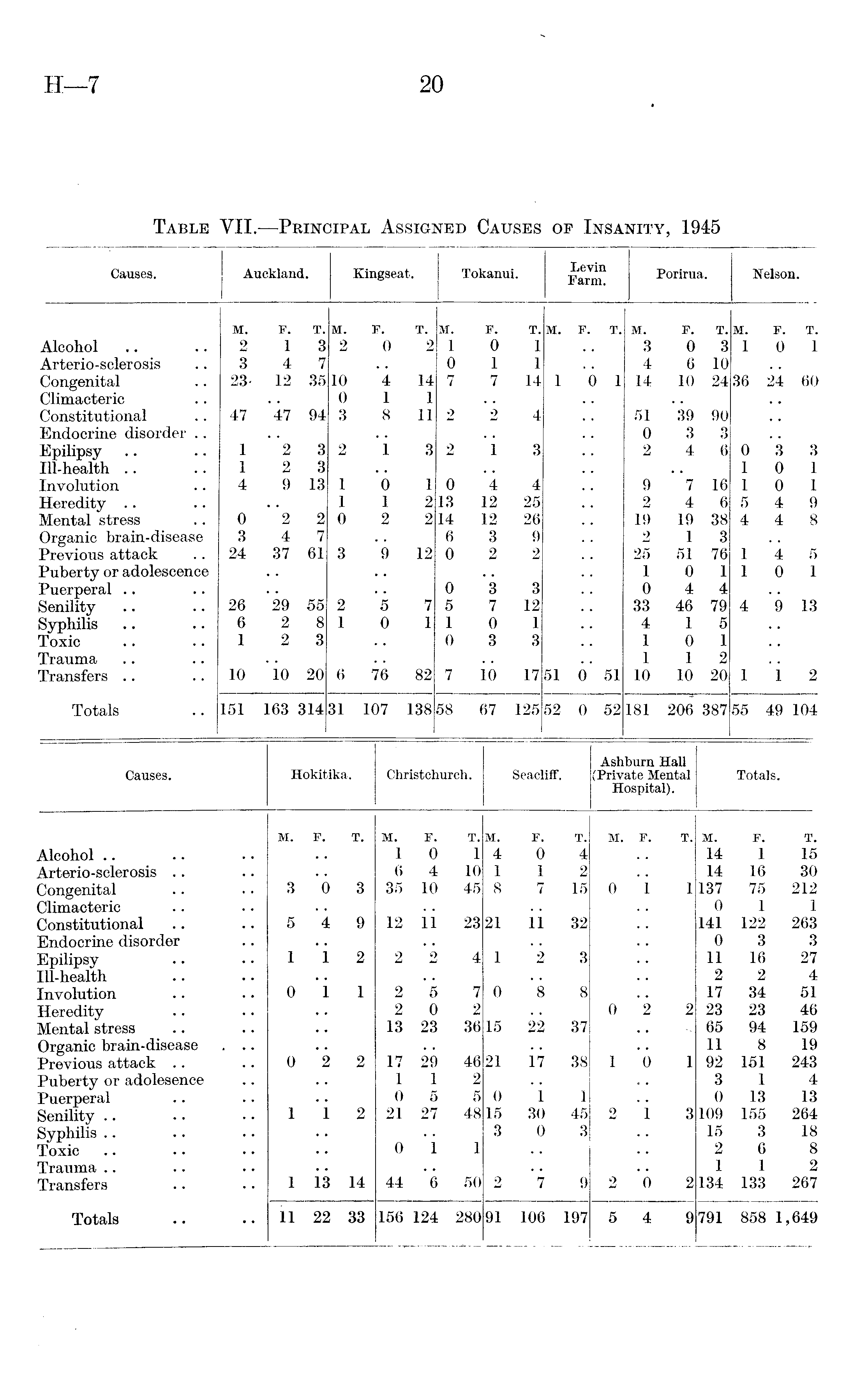 Causes. Auckland. Kingseat. Tokanui. Levin Farm. Porirua. Nelson. M. F. T. M. F. T. M. F. T. M. F. T. M. F. T. M. F. T. Alcohol 2 1 3 2 0 2 1 0 1 3 0 3 1 0 1 Arterio-sclerosis 3 4 7 0 1 1 4 6 10 Congenital 2312 35 10 4 14 7 7 14 1 1 1 14 10 24 36 24 60 Climacteric 0 1 1 Constitutional 47 47 94 3 8 11 2 2 4 51 *39 90 Endocrine disorder .. 0 3 3 Epilipsy 1 2 3 2 i 3 2 1 3 2 4 6 0 3 3 Ill-health 1 2 3 1 0 1 Involution 4 9 13 1 0 1 0 4 4 9 "7 16 1 0 1 Heredity 1 I 2 13 12 25 2 4 6 5 4 9 Mental stress 0 2 2 0 2 2 14 12 26 19 19 38 4 4 8 Organic brain-disease 3 4 7 6 3 9 2 1 3 Previous attack 24 37 61 3 9 12 0 2 2 25 51 76 1 4 5 Puberty or adolescence 1 0 1 1 0 1 Puerperal 0 3 3 0 4 4 Senility 26 29 55 2 5 7 5 7 12 33 46 79 4 9 13 Syphilis 6 2 8 1 0 1 1 0 1 4 1 5 Toxic 1 2 3 0 3 3 1 0 1 Trauma 1 1 2 Transfers 10 io 20 6 76 82 7 10 17 51 0 51 10 10 20 1 1 2 Totals 151 163 314 31 107 138 58 67 125 52 0 52 181 206 387 55 49 104 * Ashburn Hall Causes. Hokitika. Christchurch. Seacliff. (Private Mental Totals. Hospital). M. F. T. M. F. T. M. F. T. M. F. T. M. F. T. Alcohol 1 0 1 4 0 4 14 1 15 Arterio-sclerosis .. 6 4 10 1 1 2 14 16 30 Congenital 3 0 3 35 10 45 8 7 15 0 1 137 75 212 Climacteric 0 1 1 Constitutional 5 4 9 12 11 23 21 11 32 141 -122 263 Endocrine disorder 0 3 3 Epilipsy 1 1 2 2 2 4 1 "l ! 3 11 16 27 Ill-health 2 2 4 Involution 0 1 1 2 5 7 0 S ; 8 17 34 51 Heredity 2 0 2 0 2 23 23 46 Mental stress 13 23 36 15 22 37 65 94 159 Organic brain-disease 11 8 19 Previous attack .. 0 2 2 17 29 46 21 17 38 1 1 92 151 243 Puberty or adolesence 1 1 2 3 1 4 Puerperal 0 5 5 0 i 1 0 13 13 Senility 1 1 2 21 27 48 15 30 45 2 3 109 155 264 Syphilis 0 3 0 3 15 3 18 Toxic 1 1 2 6 8 Trauma 1 1 2 Transfers 1 13 14 44 6 50 2 i 9 2 0 2 134 133 267 Totals 11 22 33 156 124 280 91 106 197 5 4 9 791 858 1, ,649