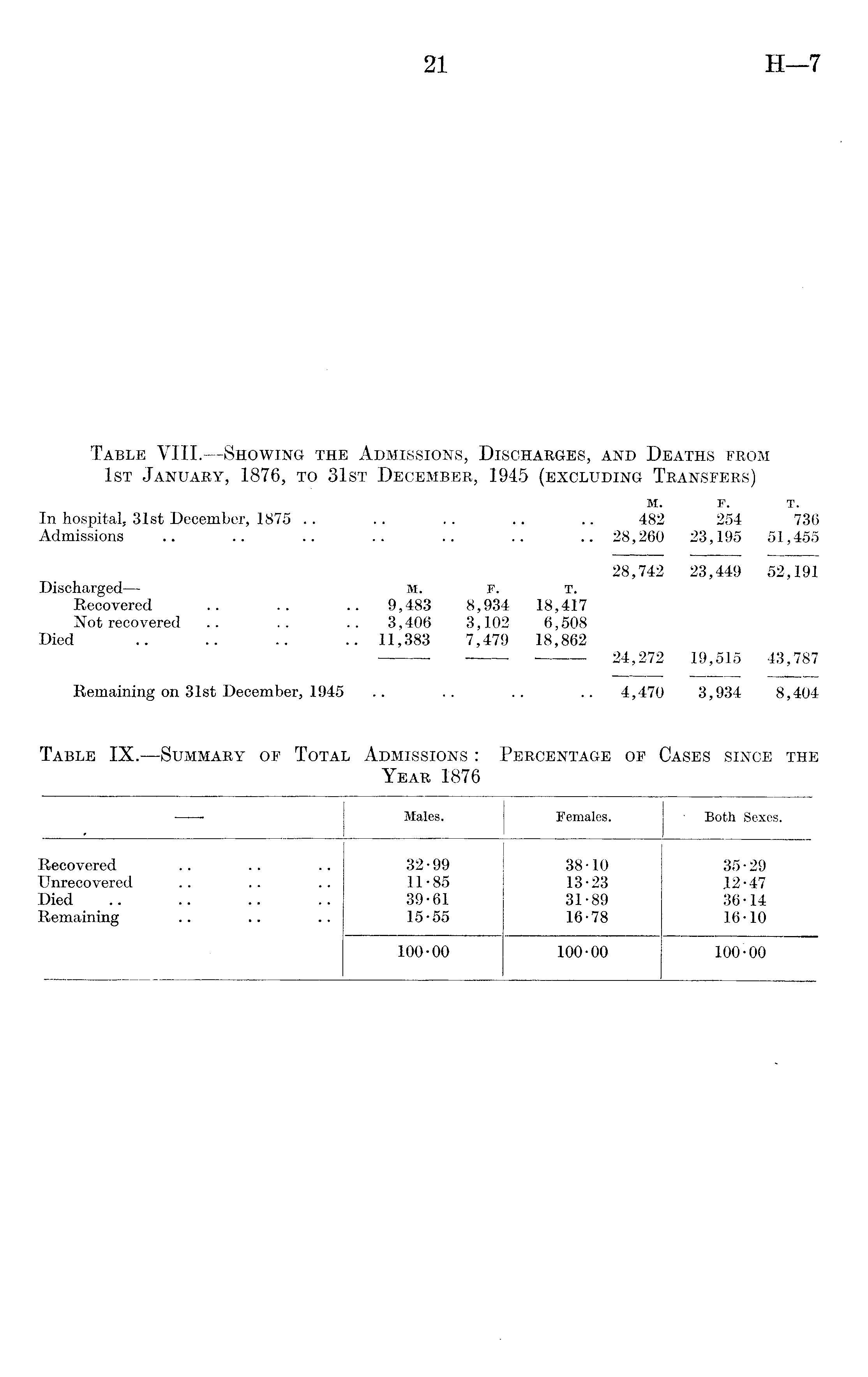 Table Ylll.—Showing the Admissions, Discharges, and Deaths from Ist January, 1876, to 31st December, 1945 (excluding Transfers) M. P. T. In hospital, 31st December, 1875 .. .. .. .. .. 482 254 736 Admissions .. .. .. .. .. .. .. 28,260 23,195 51,455 28,742 23,449 52,191 Discharged— M. F. T. Recovered .. .. .. 9,483 8,934 18,417 Not recovered .. .. .. 3,406 3,102 6,508 Died .. .. .. .. 11,383 7,479 18,862 24,272 19,515 43,787 Remaining on 31st December, 1945 .. .. .. .. 4,470 3,934 8,404