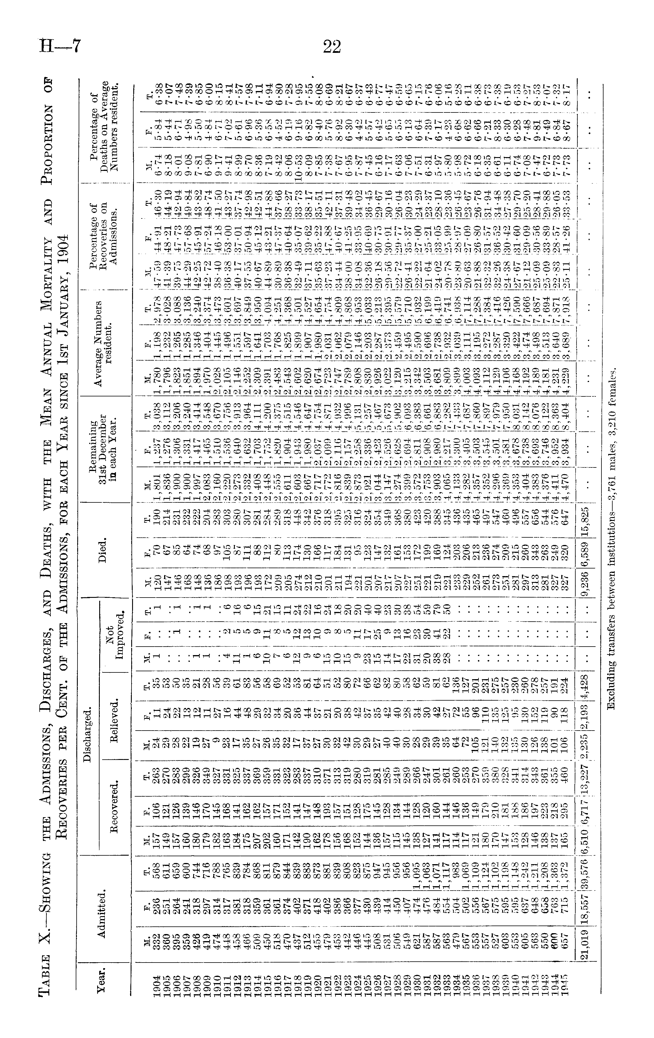Table X.—Showing the Admissions, Discharges, and Deaths, with the Mean Annual Mortality and Proportion of Recoveries per Cent. of the Admissions, for each Year since 1st January, 1904