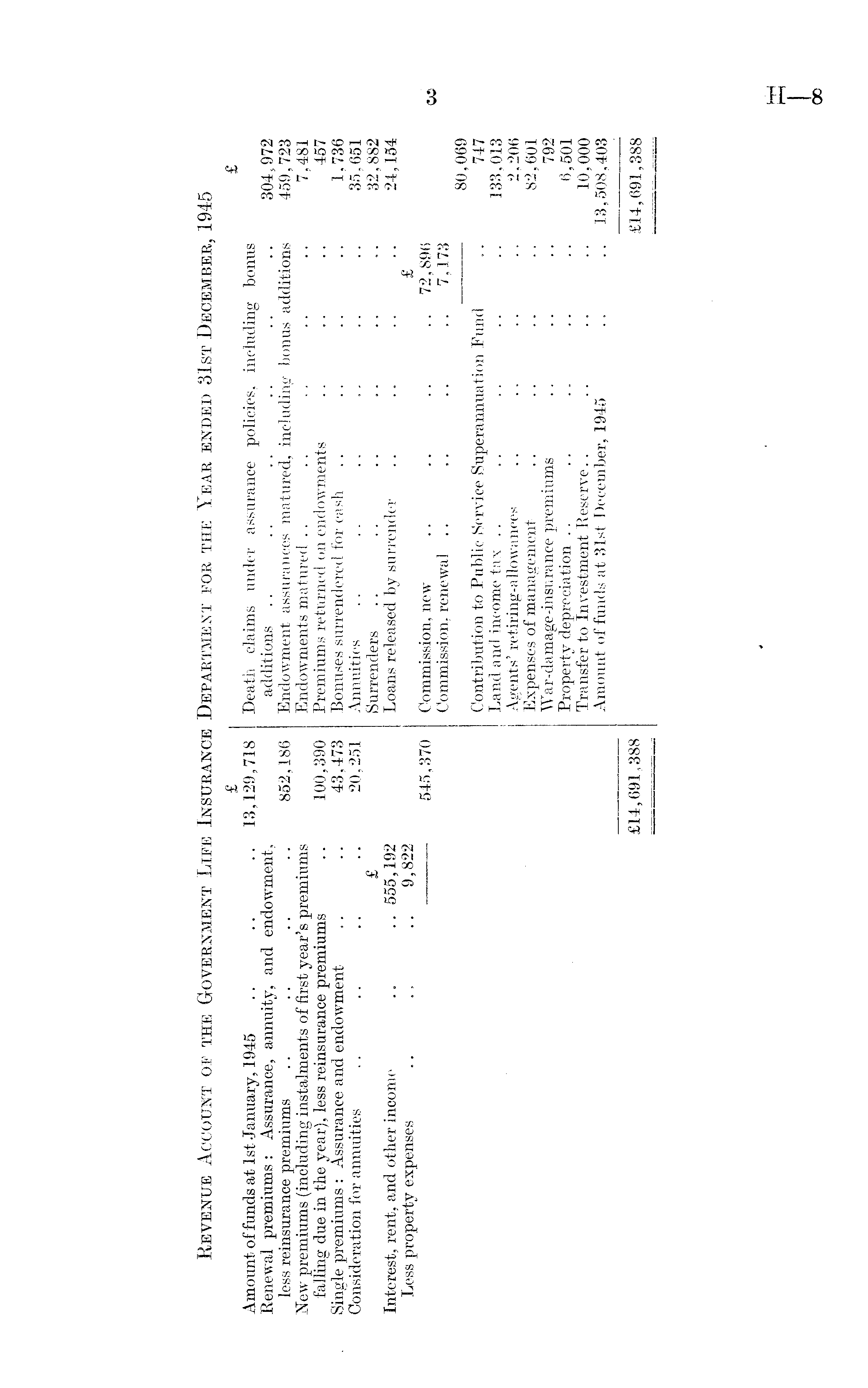 £ f £ Amount offends at Ist -January, 1945 .. .. .. 13,129,718 Death claims under assurance policies, including bonus Renewal premiums: Assurance, annuity, and endowment, additions .. .. .. .. .. .. 304,972 less reinsurance premiums .. .. .. .. 852,186 Endowment assurances matured, including bonus additions 459,723 New premiums (including instalments of first year's premiums Endowments matured .. .. .. .. .. 7,481 falling due in the year), less reinsurance premiums .. 100,390 Premiums returned on endowments .. .. .. 457 Single premiums: Assurance and endowment .. .. 43,473 Bonuses surrendered for cash .. .. .. .. 1,736 Consideration for annuities .. .. .. .. 20,251 Annuities .. .. .. .. .. .. 35,651 £ Surrenders .. .. .. .. .. .. 32,882 Interest, rent, and other income .. .. 555,192 Loans released by surrender .. .. .. .. 24,154 Less property expenses .. .. .. 9,822 • £ 545,370 Commission, new .. .. .. .. 72,896 Commission, renewal .. .. .. .. 7,173 80,069 Contribution to Public Service Superannuation Fund .. 747 Land and income tax .. .. .. .. .. 133,013 Agents' retiring-allowances .. .. .. .. 2,206 Expenses of management .. .. .. .. 82,601 War-damage-insiirance premiums .. .. .. 792 Property depreciation .. .. .. .. .. 6,501 Transfer to Investment Reserve.. .. .. .. 10,000 Amount of funds at 31st December, 1945 .. .. 13,508,403 £14,691,388 £14,691,388