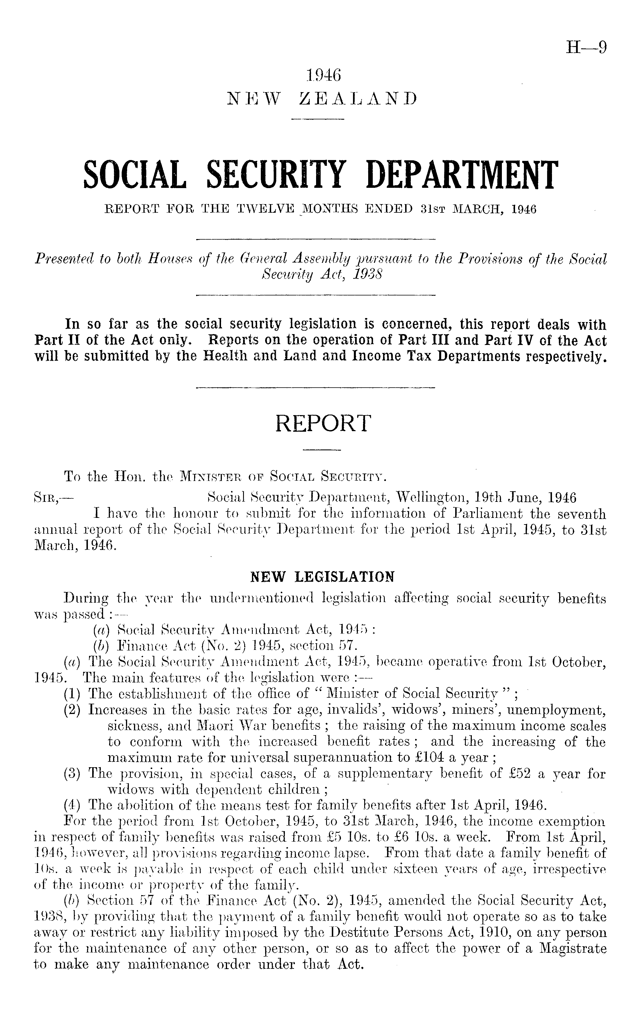 To the Hon. the Minister of Social Security. Sir,— Social Security Department, Wellington, 19th June, 1946 I have the honour to submit for the information of Parliament the seventh annual report of the Social Security Department for the period Ist April, 1945, to 31st March, 1946. NEW LEGISLATION During the year the undermentioned legislation affecting social security benefits was passed:— (a) Social Security Amendment Act, 1945 : (b) Finance Act (No. 2) 1945, section 57. (a) The Social Security Amendment Act, 1945, became operative from Ist October, 1945. The main features of the legislation were : (1) The establishment of the office of " Minister of Social Security " ; (2) Increases in the basic rates-for age, invalids', widows', miners', unemployment, sickness, and Maori War benefits ; the raising of the maximum income scales to conform with the increased benefit rates; and the increasing of the maximum rate for universal superannuation to £IQ4 a year ; (3) The provision, in special cases, of a supplementary benefit of £52 a year for widows with dependent children ; (4) The abolition of the means test for family benefits after Ist April, 1946. For the period from Ist October, 1945, to 31st March, 1946, the income exemption in respect of family benefits was raised from £5 10s. to £6 10s. a week. From Ist April, 1946, however, all provisions regarding income lapse. From that date a family benefit of 10s. a week is payable in respect of each child under sixteen years of age, irrespective of the income or property of the family. (b) Section 57 of the Finance Act (No. 2), 1945, amended the Social Security Act, 1938, by providing that the payment of a family benefit would not operate so as to take away or restrict any liability imposed by the Destitute Persons Act, 1910, on any person for the maintenance of any other person, or so as to affect the power of a Magistrate to make any maintenance order under that Act.