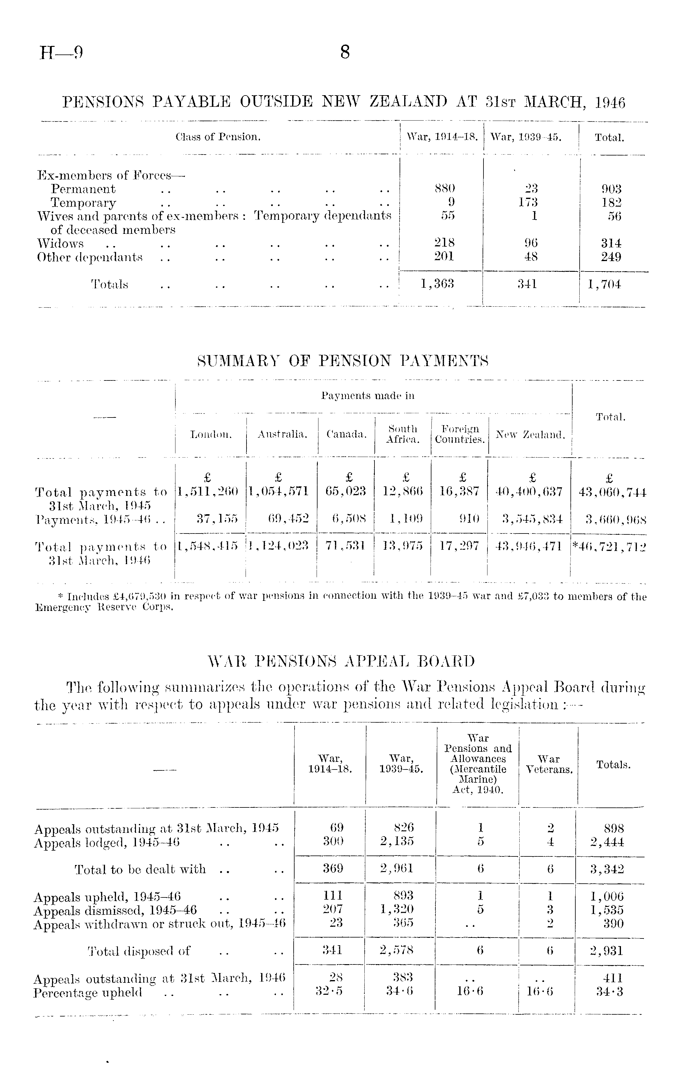 — Payments made in Total. London. Australia. Canada. South Africa. Foreign Countries. New Zealand. Total payments to 31st March, 1945 Payments, 1945-46 .. Total payments to 31st March, 1946 £ 1,511,260 37,155 £ 1,054,571 69,452 £ 65,023 6,508 £ 12,866 1,109 £ 16,387 910 £ 40,400,637 3,545,834 £ 43,060,744 3,660,968 1,548,415 1,124,023 71,531 13,975 17,297 1 43,946,471 *46,721,712 * Includes £4,679,530 in respect of war pensions in connection with the 1939-45 war and £7,033 to members of the Emergency Reserve Corps.