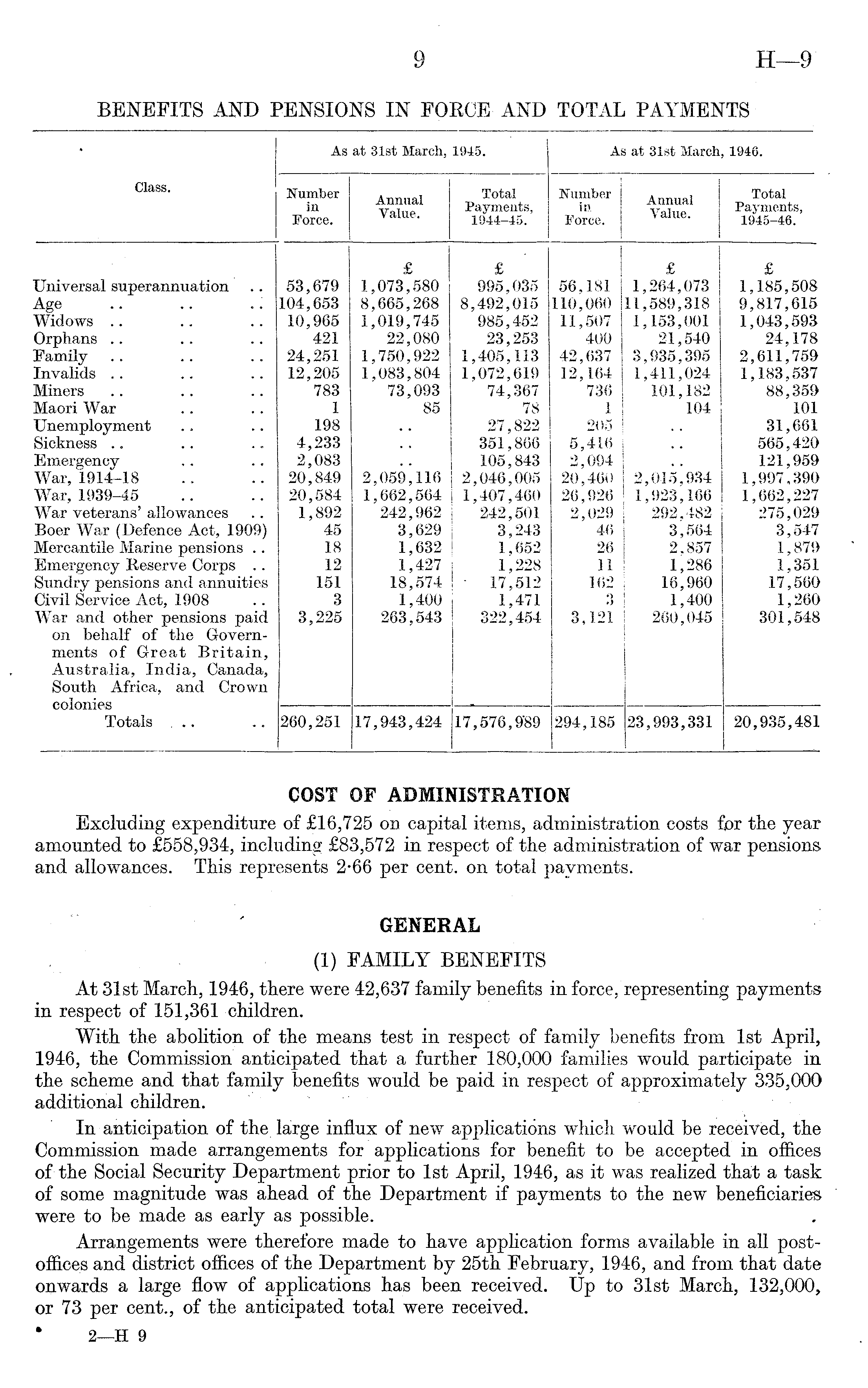 COST OF ADMINISTRATION Excluding expenditure of £16,725 on capital items, administration costs fpr the year amounted to £558,934, including £83,572 in respect of the administration of war pensions and allowances. This represents 2-66 per cent, on total payments. GENERAL (1) FAMILY BENEFITS At 31st March, 1946, there were 42,637 family benefits in force, representing payments in respect of 151,361 children. With the abolition of the means test in respect of family benefits from Ist April, 1946, the Commission anticipated that a further 180,000 families would participate in the scheme and that family benefits would be paid in respect of approximately 335,000 additional children. In anticipation of the large influx of new applications which would be received, the Commission made arrangements for applications for benefit to be accepted in offices of the Social Security Department prior to Ist April, 1946, as it was realized that a task of some magnitude was ahead of the Department if payments to the new beneficiaries were to be made as early as possible. Arrangements were therefore made to have application forms available in all postoffices and district offices of the Department by 25th February, 1946, and from that date onwards a large flow of applications has been received. Up to 31st March, 132,000, or 73 per cent., of the anticipated total were received. 2—H 9