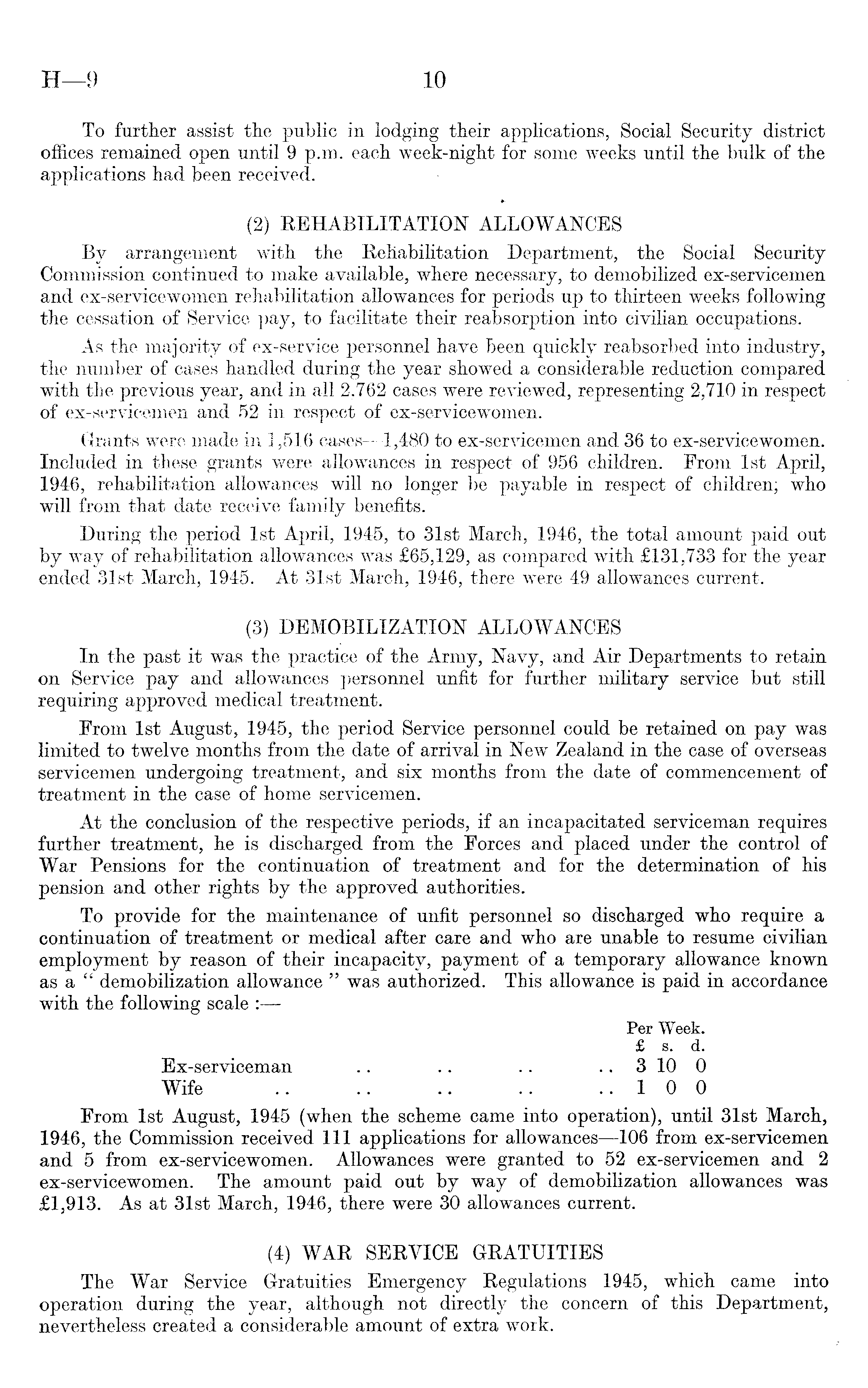 To further assist the public in lodging their applications, Social Security district offices remained open until 9 p.m. each week-night for some weeks until the bulk of the applications had been received. (2) REHABILITATION ALLOWANCES By arrangement with the Rehabilitation Department, the Social Security Commission continued to make available, where necessary, to demobilized ex-servicemen and ex-servicewomen rehabilitation allowances for periods up to thirteen weeks following the cessation of Service pay, to facilitate their reabsorption into civilian occupations. As the majority of ex-service personnel have been quickly reabsorbed into industry, the number of cases handled during the year showed a considerable reduction compared with the previous year, and in all 2,762 cases were reviewed, representing 2,710 in respect of ex-servicemen and 52 in respect of ex-servicewomen. Grants were made in 1,516 cases —1,480 to ex-servicemen and 36 to ex-servicewomen. Included in these grants were allowances in respect of 956 children. From Ist April, 1946, rehabilitation allowances will no longer be payable in respect of children; who will from that date receive family benefits. During the period Ist April, 1945, to 31st March, 1946, the total amount paid out by way of rehabilitation allowances was £65,129, as compared with £131,733 for the year ended 31st March, 1945. At 31st March, 1946, there were 49 allowances current. (3) DEMOBILIZATION ALLOWANCES In the past it was the practice of the Army, Navy, and Air Departments to retain on Service pay and allowances personnel unfit for further military service but still requiring approved medical treatment. From Ist August, 1945, the period Service personnel could be retained on pay was limited to twelve months from the date of arrival in New Zealand in the case of overseas servicemen undergoing treatment, and six months from the date of commencement of treatment in the case of home servicemen. At the conclusion of the respective periods, if an incapacitated serviceman requires further treatment, he is discharged from the Forces and placed under the control of War Pensions for the continuation of treatment and for the determination of his pension and other rights by the approved authorities. To provide for the maintenance of unfit personnel so discharged who require a continuation of treatment or medical after care and who are unable to resume civilian employment by reason of their incapacity, payment of a temporary allowance known as a " demobilization allowance " was authorized. This allowance is paid in accordance with the following scale : Per Week. £ s. d. Ex-serviceman .. .. .. .. 3 10 0 Wife 10 0 From Ist August, 1945 (when the scheme came into operation), until 31st March, 1946, the Commission received 111 applications for allowances —106 from ex-servicemen and 5 from ex-servicewomen. Allowances were granted to 52 ex-servicemen and 2 ex-servicewomen. The amount paid out by way of demobilization allowances was £1j913. As at 31st March, 1946, there were 30 allowances current. (4) WAR SERVICE GRATUITIES The War Service Gratuities Emergency Regulations 1945, which came into operation during the year, although not directly the concern of this Department, nevertheless created a considerable amount of extra work.