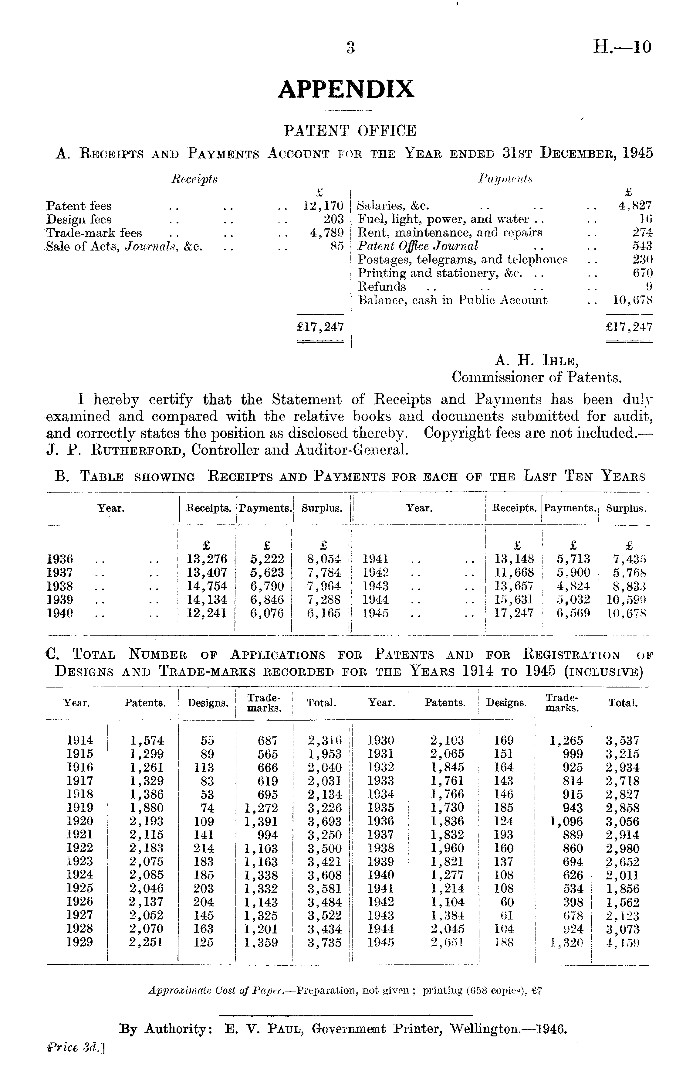 APPENDIX PATENT OFFICE A. Receipts and Payments Account for the Year ended 31st December, 1945 Receipts Payments £ £ Patent fees .. .. .. 12,170 Salaries, &c. .. .. .. 4,827 Design fees .. .. .. 203 Fuel, light, power, and water .. .. 16 Trade-mark fees .. .. .. 4,789 Rent, maintenance, and repairs .. 274 :Sale of Acts, Journals, &c. .. .. 85 Patent Office Journal .. .. 543 Postages, telegrams, and telephones .. 230 Printing and stationery, &c. .. .. 670 Refunds .. .. .. .. 9 Balance, cash in Public Account .. 10,678 £17,247 £17,247 A. H. Ihle, Commissioner of Patents. I hereby certify that the Statement of Receipts and Payments has been duly examined and compared with the relative books and documents submitted for audit, and correctly states the position as disclosed thereby. Copyright fees are not included.— J. P. Rutherford, Controller and Auditor-General.