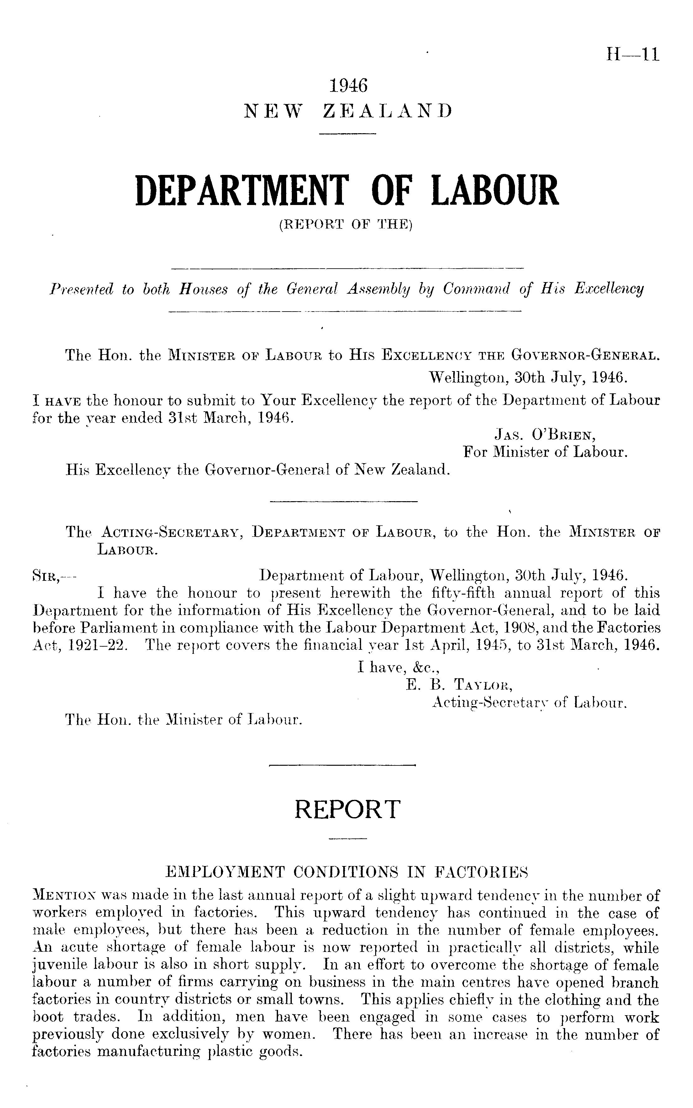 The Acting-Secretary, Department of Labour, to the Hon. the Minister of Labour. Sir, — Department of Labour, Wellington, 30th July, 1946. I have the honour to present herewith the fifty-fifth annual report of this Department for the information of His Excellency the Governor-General, and to be laid before Parliament in compliance with the Labour Department Act, 1908, and the Factories Act, 1921-22. The report covers the financial year Ist April, 1945, to 31st March, 1946. I have, &c, E. B. Taylor, Acting-Secretary of Labour. The Hon. the Minister of Labour.