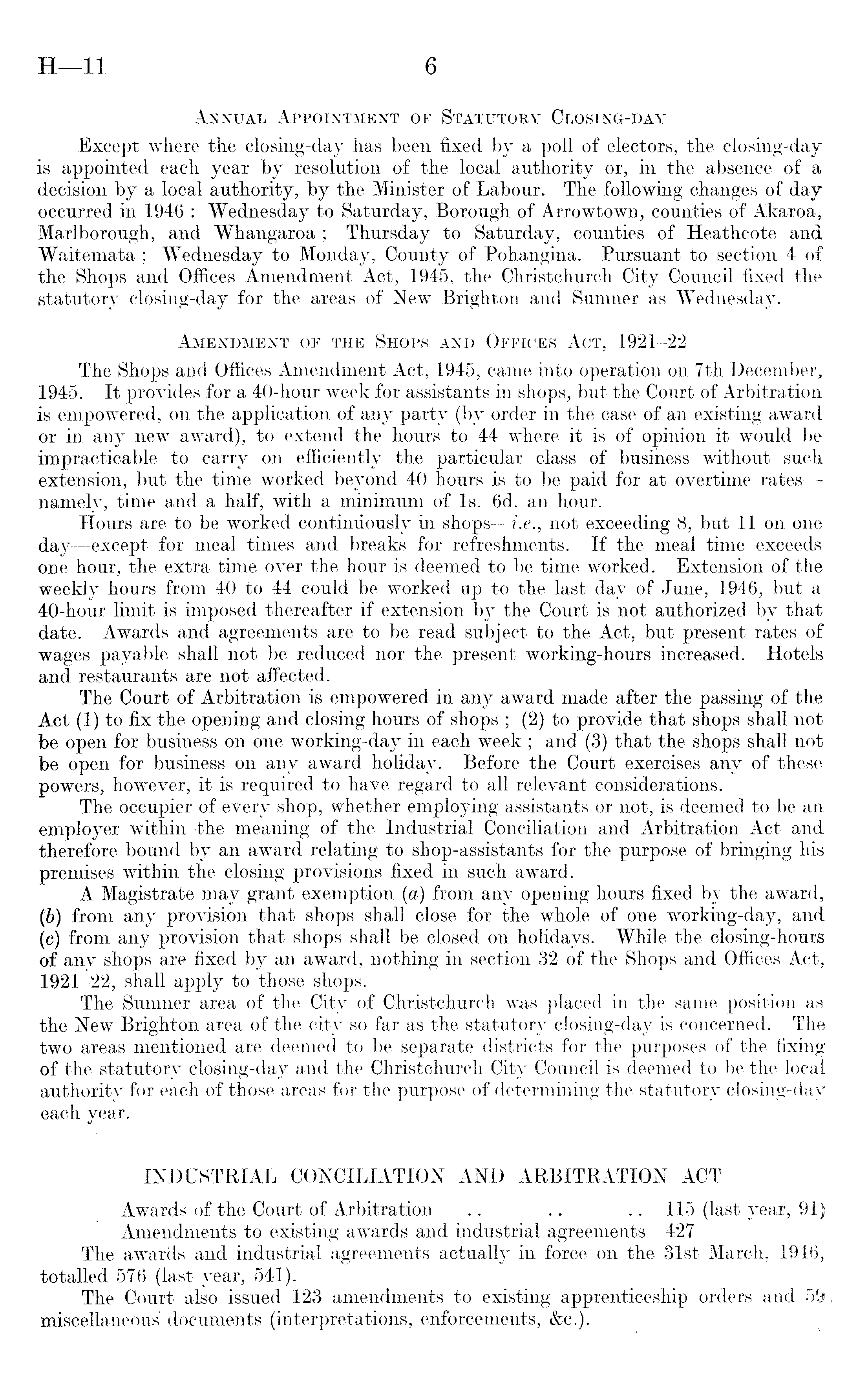 Annual Appointment op Statutory Closing-day Except where the closing-day has been fixed by a poll of electors, the closing-day is appointed each year by resolution of the local authority or, in the absence of a decision by a local authority, by the Minister of Labour. The following changes of day occurred in 1946 : Wednesday to Saturday, Borough of Arrowtown, counties of Akaroa, Marlborough, and Whangaroa ; Thursday to Saturday, counties of Heathcote and Waitemata ; Wednesday to Monday, County of Pohangina. Pursuant to section 4of the Shops and Offices Amendment Act, 1945, the Christchurch City Council fixed the statutory closing-day for the areas of New Brighton and Sumner as Wednesday. Amendment of the Shops and Offices Act, 1921-22 The Shops and Offices Amendment Act, 1945, came into operation on 7th December, 1945. It provides for a 40-hour week for assistants in shops, but the Court of Arbitration is empowered, on the application of any party (by order in the case of an existing award or in any new award), to extend the hours to 44 where it is of opinion it would be impracticable to carry on efficiently the particular class of business without such extension, but the time worked beyond 40 hours is to be paid for at overtime rates — namely, time and a half, with a minimum of Is. 6d. an hour. Hours are to be worked continuously in shops— i.e., not exceeding 8, but 11 on one day—except for meal times and breaks for refreshments. If the meal time exceeds one hour, the extra time over the hour is deemed to be time worked. Extension of the weekly hours from 40 to 44 could be worked up to the last day of June, 1946, but a 40-hour limit is imposed thereafter if extension by the Court is not authorized by that date. Awards and agreements are to be read subject to the Act, but present rates of wages payable shall not be reduced nor the present working-hours increased. Hotels and restaurants are not affected. The Court of Arbitration is empowered in any award made after the passing of the Act (1) to fix the opening and closing hours of shops ; (2) to provide that shops shall not be open for business on one working-day in each week ; and (3) that the shops shall not be open for business on any award holiday. Before the Court exercises any of these powers, however, it is required to have regard to all relevant considerations. The occupier of every shop, whether employing assistants or not, is deemed to be an employer within the meaning of the Industrial Conciliation and Arbitration Act and therefore bound by an award relating to shop-assistants for the purpose of bringing his premises within the closing provisions fixed in such award. A Magistrate may grant exemption (a) from any opening hours fixed by the award, (b) from any provision that shops shall close for the whole of one working-day, and (c) from any provision that shops shall be closed on holidays. While the closing-hours of any shops are fixed by an award, nothing in section 32 of the Shops and Offices Act, 1921-22, snail apply to those shops. The Sumner area of the City of Christchurch was placed in the same position as the New Brighton area of the city so far as the statutory closing-day is concerned. The two areas mentioned are deemed to be separate districts for the purposes of the fixing of the statutory closing-day and the Christchurch City Council is deemed to be the local authority for each of those areas for the purpose of determining the statutory closing-day each year. INDUSTRIAL CONCILIATION AND ARBITRATION ACT Awards of the Court of Arbitration .. .. .. 115 (last year, 91) Amendments to existing awards and industrial agreements 427 The awards and industrial agreements actually in force on the 31st March, 1946, totalled 576 (last year, 541). The Court also issued 123 amendments to existing apprenticeship orders and 59 miscellaneous documents (interpretations, enforcements, &c).