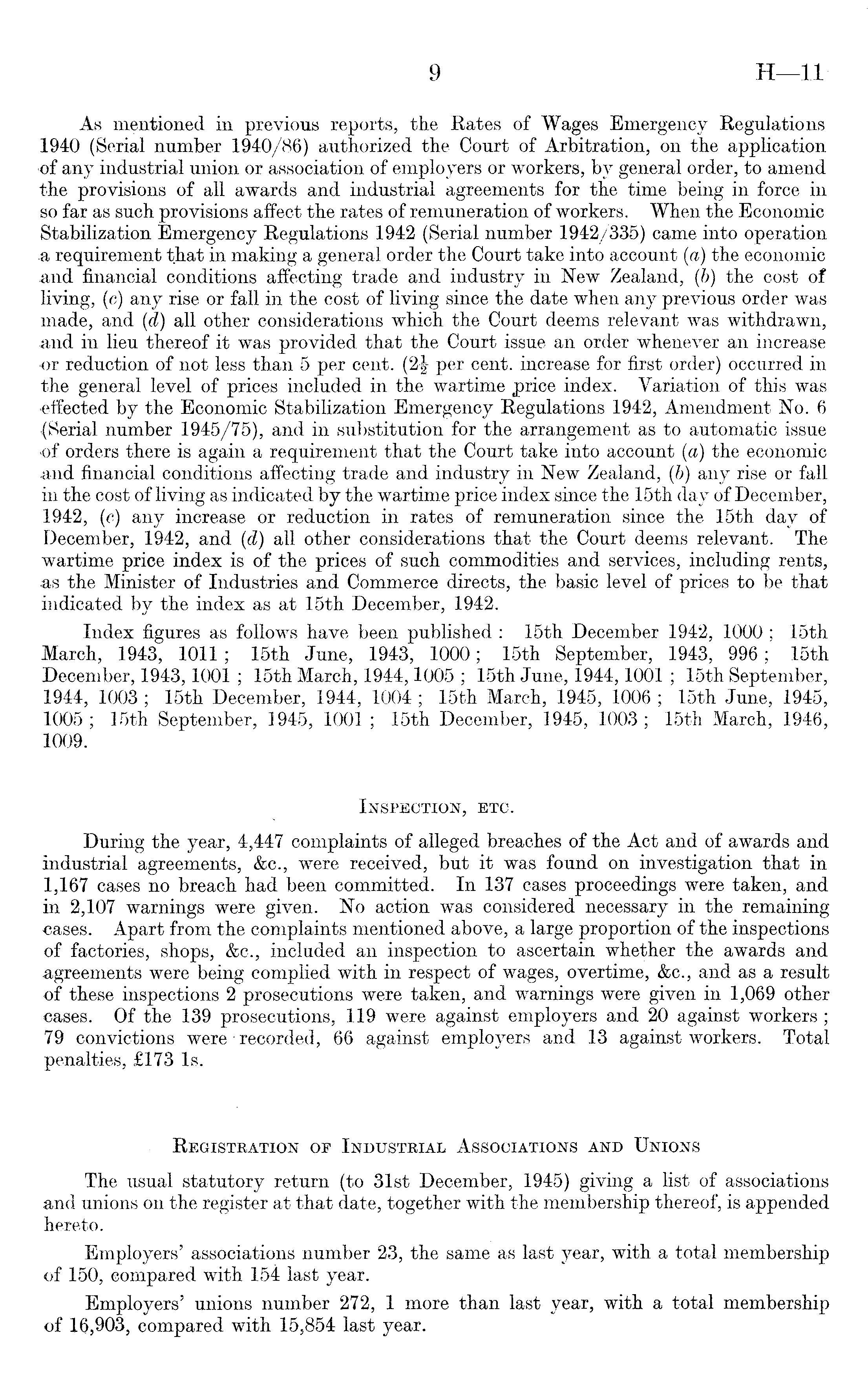 As mentioned in previous reports, the Rates of Wages Emergency Regulations 1940 (Serial number 1940/86) authorized the Court of Arbitration, on the application •of any industrial union or association of employers or workers, by general order, to amend the provisions of all awards and industrial agreements for the time being in force in so far as such provisions affect the rates of remuneration of workers. When the Economic Stabilization Emergency Regulations 1942 (Serial number 1942/335) came into operation ■a requirement that in making a general order the Court take into account (a) the economic and financial conditions affecting trade and industry in New Zealand, (b) the cost of living, (c) any rise or fall in the cost of living since the date when any previous order was made, and (d) all other considerations which the Court deems relevant was withdrawn, and in lieu thereof it was provided that the Court issue an order whenever an increase or reduction of not less than 5 per cent. (2| per cent, increase for first order) occurred in the general level of prices included in the wartime price index. Variation of this was effected by the Economic Stabilization Emergency Regulations 1942, Amendment No. 6 (Serial number 1945/75), and in substitution for the arrangement as to automatic issue •of orders there is again a requirement that the Court take into account (a) the economic and financial conditions affecting trade and industry in New Zealand, (b) any rise or fall in the cost of living as indicated by the wartime price index since the 15th day of December, 1942, (c) any increase or reduction in rates of remuneration since the 15th day of December, 1942, and (d) all other considerations that the Court deems relevant. The wartime price index is of the prices of such commodities and services, including rents, as the Minister of Industries and Commerce directs, the basic level of prices to be that indicated by the index as at 15th December, 1942. Index figures as follows have been published : 15th December 1942, 1000 ; 15th March, 1943, 1011 ; 15th June, 1943, 1000; 15th September, 1943, 996; 15th December, 1943,1001 ; 15th March, 1944,1005 ; 15th June, 1944,1001 ; 15th September, 1944, 1003 ; 15th December, 1944, 1004 ; 15th March, 1945, 1006 ; 15th June, 1945, 1005 ; 15th September, 1945, 1001 ; 15th December, 1945, 1003 ; 15th March, 1946, 1009. Inspection, etc. During the year, 4,447 complaints of alleged breaches of the Act and of awards and industrial agreements, &c, were received, but it was found on investigation that in 1,167 cases no breach had been committed. In 137 cases proceedings were taken, and in 2,107 warnings were given. No action was considered necessary in the remaining cases. Apart from the complaints mentioned above, a large proportion of the inspections of factories, shops, &c, included an inspection to ascertain whether the awards and agreements were being complied with in respect of wages, overtime, &c, and as a result of these inspections 2 prosecutions were taken, and warnings were given in 1,069 other cases. Of the 139 prosecutions, 119 were against employers and 20 against workers ; 79 convictions were • recorded, 66 against employers and 13 against workers. Total penalties, £173 Is. Registration op Industrial Associations and Unions The usual statutory return (to 31st December, 1945) giving a list of associations and unions on the register at that date, together with the membership thereof, is appended hereto. Employers' associations number 23, the same as last year, with a total membership of 150, compared with 154 last year. Employers' unions number 272, 1 more than last year, with a total membership of 16,903, compared with 15,854 last year.