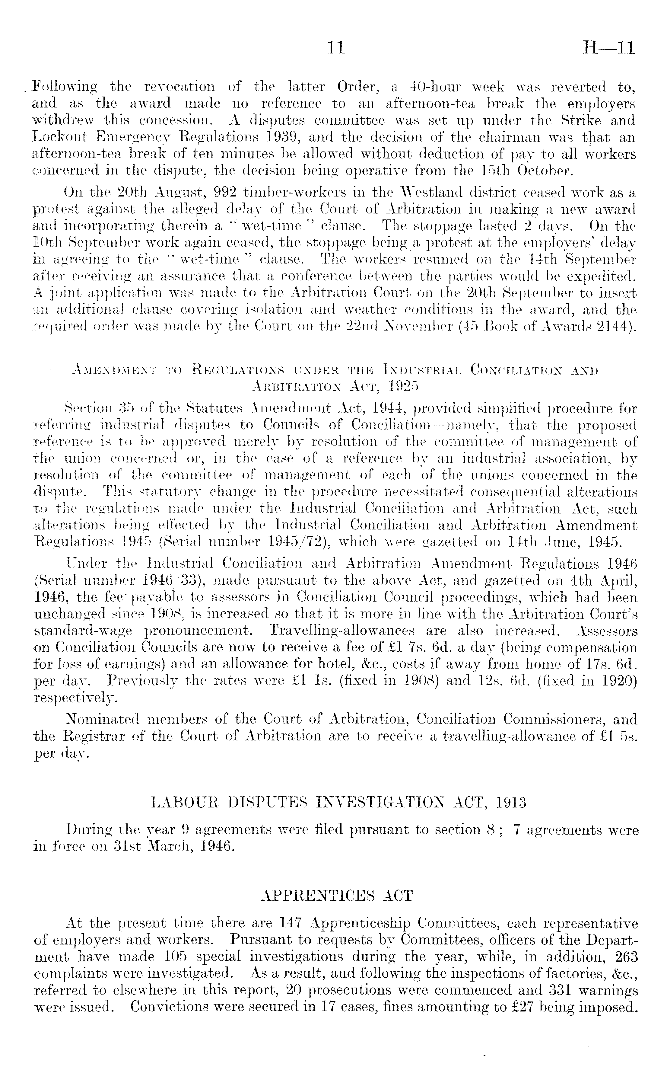 Following the revocation of the latter Order, a 40-hour week was reverted to, and as the award made no reference to an afternoon-tea break the employers withdrew this concession. A disputes committee was set up under the Strike and Lockout Emergency Regulations 1939, and the decision of the chairman was that an afternoon-tea break of ten minutes be allowed without deduction of pay to all workers concerned in the dispute, the decision being operative from the 15th October. On the 20th August, 992 timber-workers in the Westland district ceased work as a protest against the alleged delay of the Court of Arbitration in making a new award and incorporating therein a " wet-time " clause. The stoppage lasted 2 days. On the 10th September work again ceased, the stoppage being a protest at the employers' delay in agreeing to the " wet-time " clause. The workers resumed on the 14th September after receiving an assurance that a conference between the parties would be expedited. A joint application was made to the Arbitration Court on the 20th September to insert an additional clause covering isolation and weather conditions in the award, and the required order was made by the Court on the 22nd November (45 Book of Awards 2144). Amendment to Regulations undek the Industrial Conciliation and Arbitration Act, 1925 Section 35 of the Statutes Amendment Act, 1944, provided simplified procedure for referring industrial disputes to Councils of Conciliation—namely, that the proposed reference is to be approved merely by resolution of the committee of management of the union concerned or, in the case of a reference by an industrial association, by resolution of the committee, of management of each of the unions concerned in the dispute. This statutory change in the procedure necessitated consequential alterations to the regulations made under the Industrial Conciliation and Arbitration Act, such alterations being effected by the Industrial Conciliation and Arbitration Amendment Regulations 1945 (Serial number 1945/72), which were gazetted on 14th June, 1945. Under the Industrial Conciliation and Arbitration Amendment Regulations 1946 {Serial number 1946/33), made pursuant to the above Act, and gazetted on 4th April, 1946, the fee' payable to assessors in Conciliation Council proceedings, which had been unchanged since 1908, is increased so that it is more in line with the Arbitration Court's standard-wage pronouncement. Travelling-allowances are also increased. Assessors on Conciliation Councils are now to receive a fee of £1 7s. 6d. a day (being compensation for loss of earnings) and an allowance for hotel, &c, costs if away from home of 17s. 6d. per day. Previously the rates were £1 Is. (fixed in 1908) and 12s. 6d. (fixed in 1920) respectively. Nominated members of the Court of Arbitration, Conciliation Commissioners, and the Registrar of the Court of Arbitration are to receive a travelling-allowance of £1 ss. per day. LABOUR DISPUTES INVESTIGATION ACT, 1913 During the year 9 agreements were filed pursuant to section 8 ; 7 agreements were in force on 31st March, 1946. APPRENTICES ACT At the present time there are 147 Apprenticeship Committees, each representative of employers and workers. Pursuant to requests by Committees, officers of the Department have made 105 special investigations during the year, while, in addition, 263 complaints were investigated. As a result, and following the inspections of factories, &c, referred to elsewhere in this report, 20 prosecutions were commenced and 331 warnings "were issued. Convictions were secured in 17 cases, fines amounting to £27 being imposed.