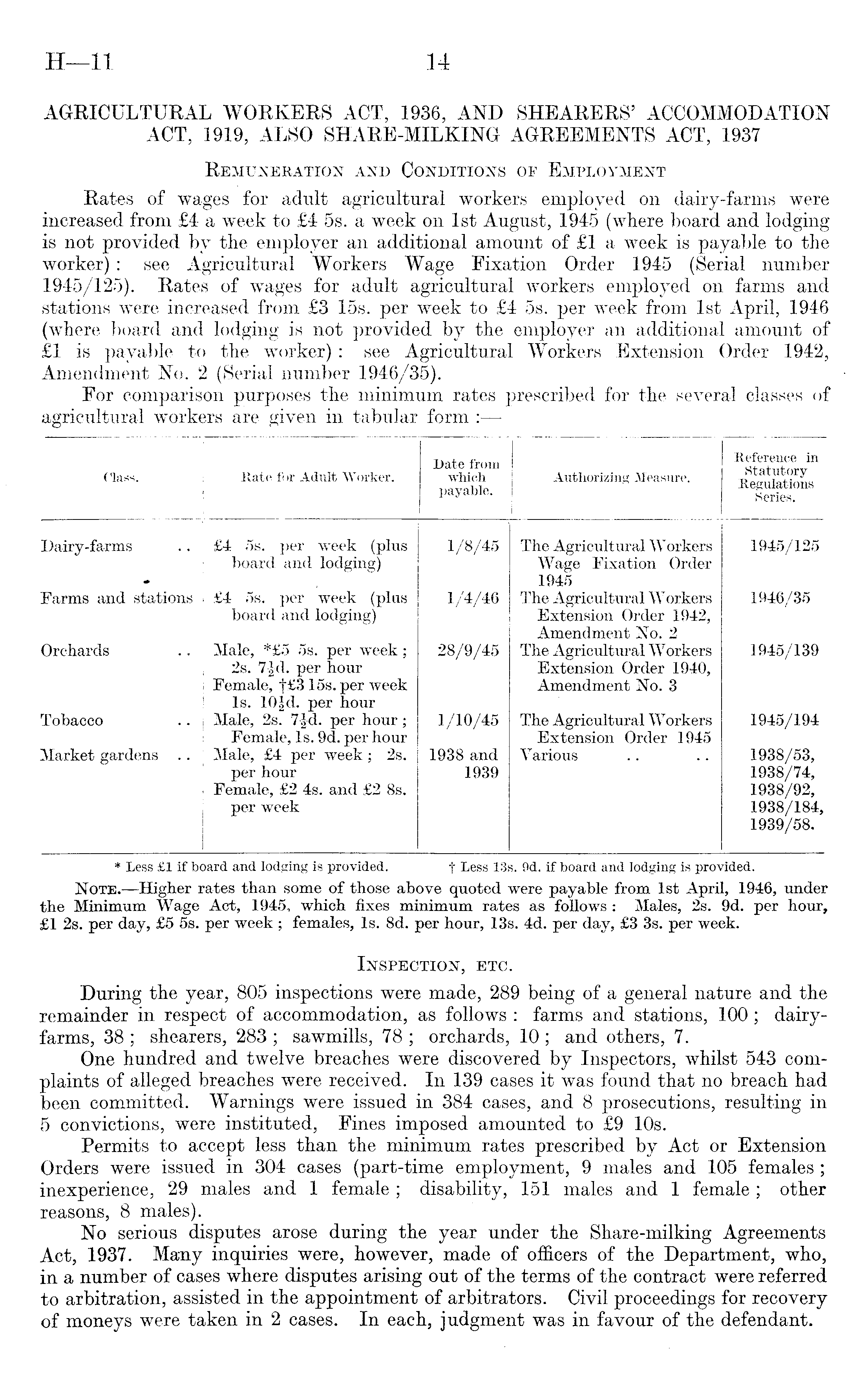 AGRICULTURAL WORKERS ACT, 1936, AND SHEARERS' ACCOMMODATION ACT, 1919, ALSO SHARE-MILKING AGREEMENTS ACT, 1937 Remuneration and Conditions of Employment Rates of wages for adult agricultural workers employed on dairy-farms were increased from £4 a week to £4 ss. a week on Ist August, 1945 (where board and lodging is not provided by the employer an additional amount of £1 a week is payable to the worker) : see Agricultural Workers Wage Fixation Order 1945 (Serial number 1945/125). Rates of wages for adult agricultural workers employed on farms and stations were increased from £3 15s. per week to £4 ss. per week from Ist April, 1946 (where board and lodging is not provided by the employer an additional amount of £1 is payable to the worker) : see Agricultural Workers Extension Order 1942, Amendment No. 2 (Serial number 1946/35).