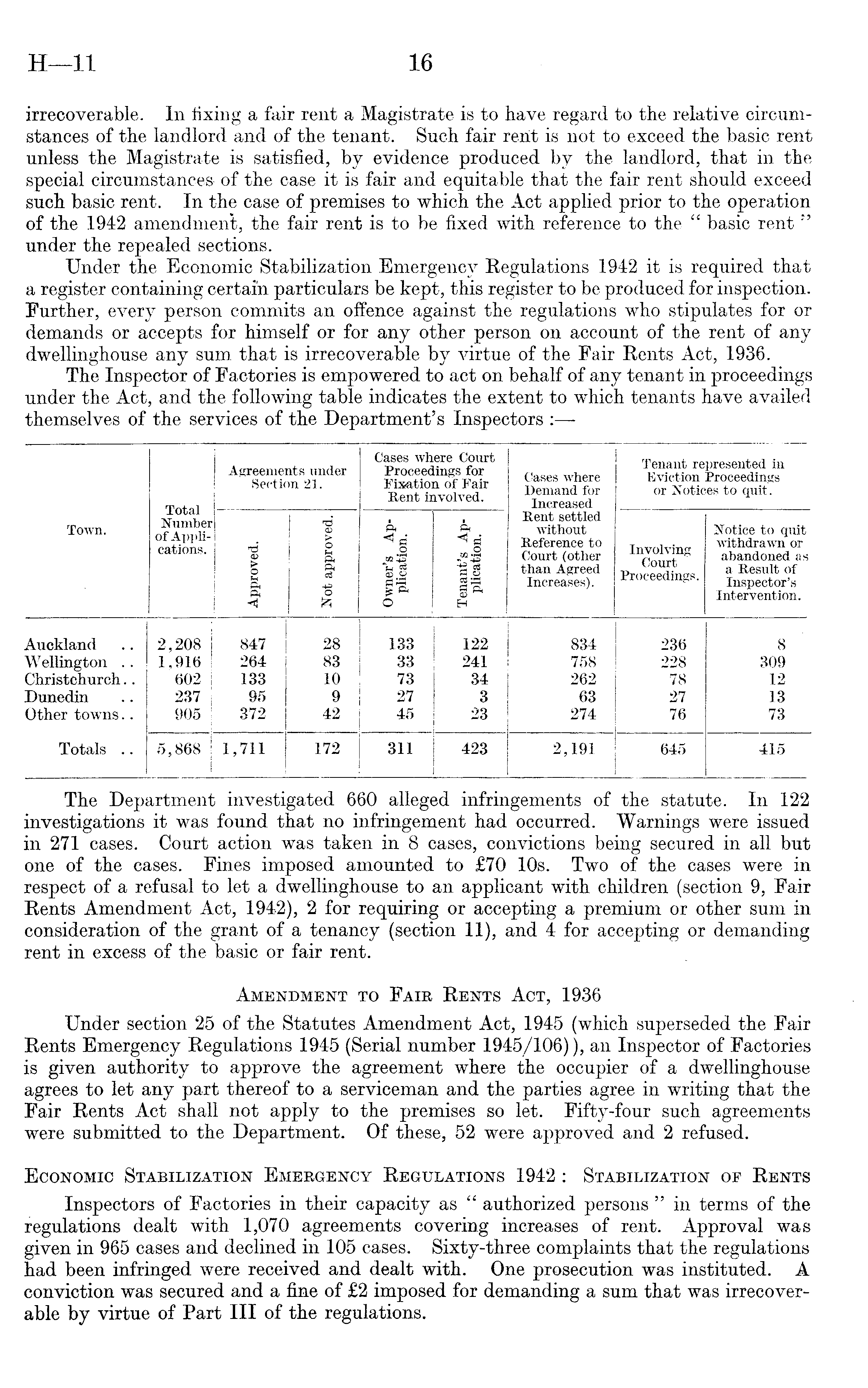 The Department investigated 660 alleged infringements of the statute. In 122 investigations it was found that no infringement had occurred. Warnings were issued in 271 cases. Court action was taken in 8 cases, convictions being secured in all but one of the cases. Fines imposed amounted to £7O 10s. Two of the cases were in respect of a refusal to let a dwellinghouse to an applicant with children (section 9, Fair Eents Amendment Act, 1942), 2 for requiring or accepting a premium or other sum in consideration of the grant of a tenancy (section 11), and 4 for accepting or demanding rent in excess of the basic or fair rent. Amendment to Faie Eents Act, 1936 Under section 25 of the Statutes Amendment Act, 1945 (which superseded the Fair Eents Emergency Eegulations 1945 (Serial number 1945/106)), an Inspector of Factories is given authority to approve the agreement where the occupier of a dwellinghouse agrees to let any part thereof to a serviceman and the parties agree in writing that the Fair Eents Act shall not apply to the premises so let. Fifty-four such agreements were submitted to the Department. Of these, 52 were approved and 2 refused. Economic Stabilization Emergency Eegulations 1942 : Stabilization op Eents Inspectors of Factories in their capacity as " authorized persons " in terms of the regulations dealt with 1,070 agreements covering increases of rent. Approval was given in 965 cases and declined in 105 cases. Sixty-three complaints that the regulations had been infringed were received and dealt with. One prosecution was instituted. A conviction was secured and a fine of £2 imposed for demanding a sum that was irrecoverable by virtue of Part 111 of the regulations.