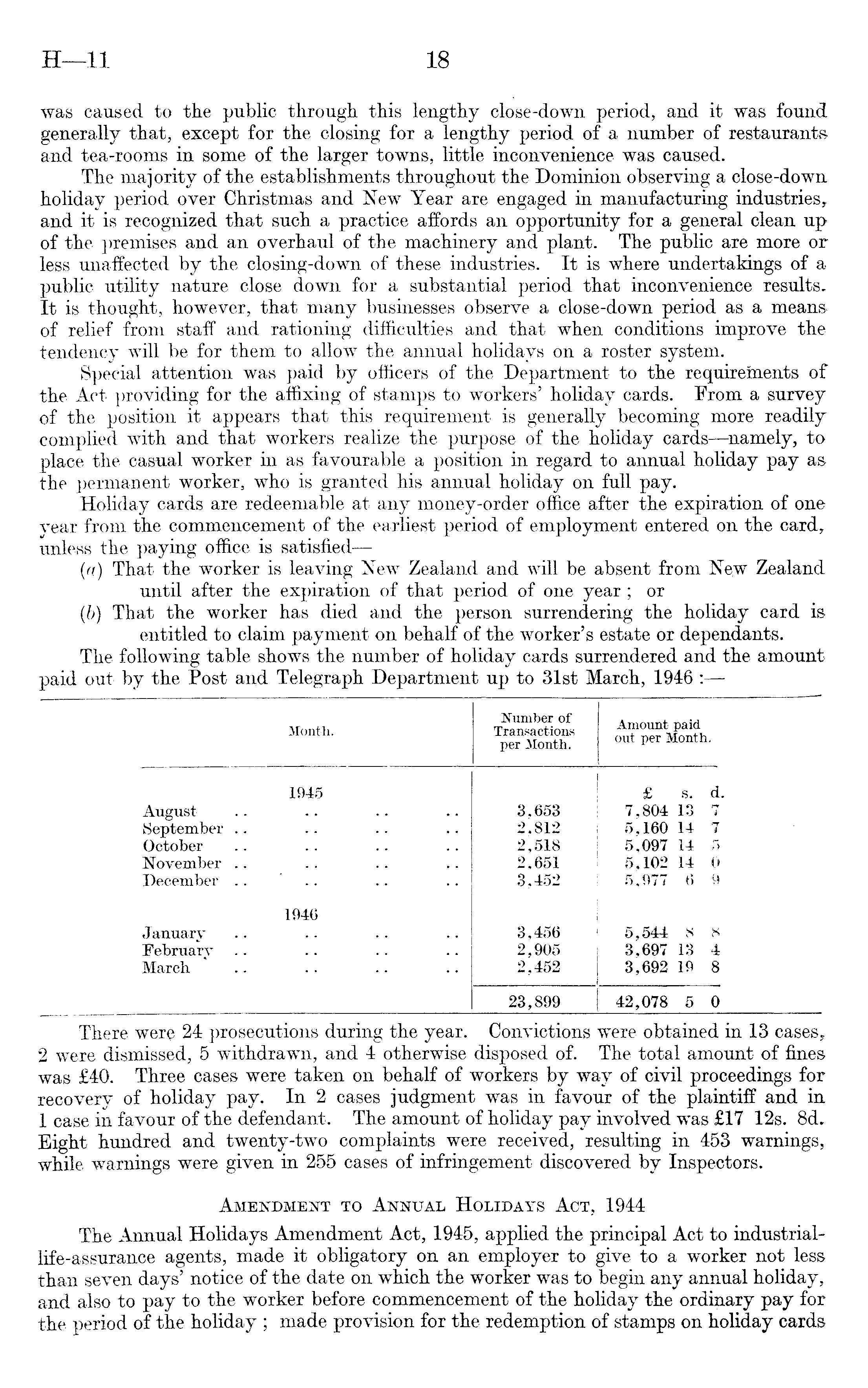 There were. 24 prosecutions during the year. Convictions were obtained in 13 cases, 2 were dismissed, 5 withdrawn, and 4 otherwise disposed of. The total amount of fines was £4O. Three cases were taken on behalf of workers by way of civil proceedings for recovery of holiday pay. In 2 cases judgment was in favour of the plaintiff and in 1 case in favour of the defendant. The amount of holiday pay involved was £l7 12s. Bd. Eight hundred and twenty-two complaints were received, resulting in 453 warnings, while warnings were given in 255 cases of infringement discovered by Inspectors. Amendment to Annual Holidays Act, 1944 The Annual Holidays Amendment Act, 1945, applied the principal Act to industrial-life-assurance agents, made it obligatory on an employer to give to a worker not less than seven days' notice of the date on which the worker was to begin any annual holiday, and also to pay to the worker before commencement of the holiday the ordinary pay for the period of the holiday ; made provision for the redemption of stamps on holiday cards