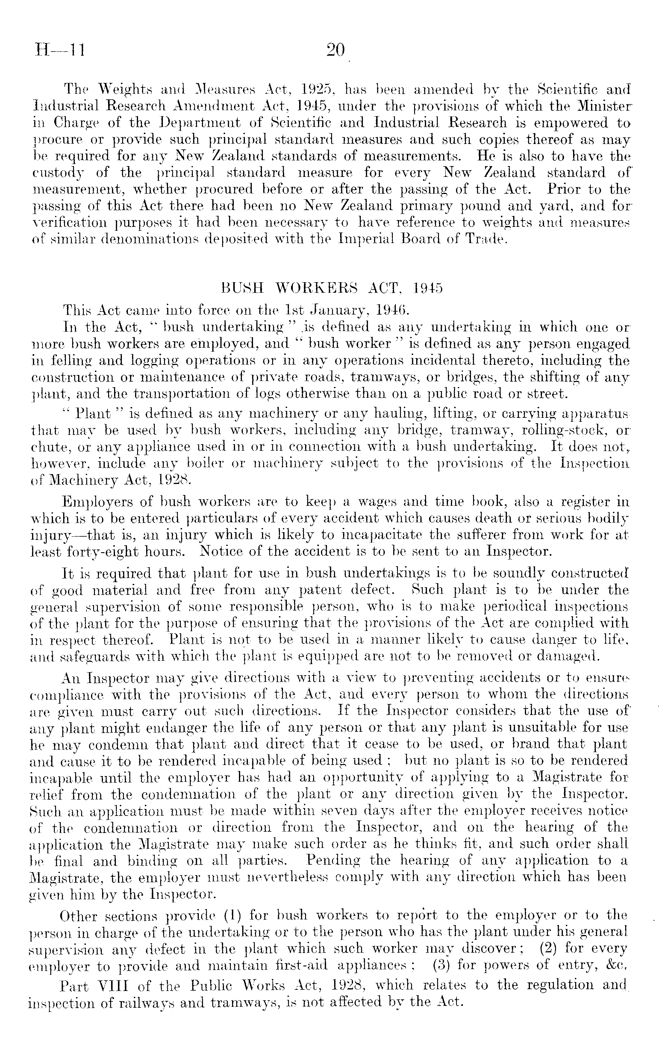 The Weights and Measures Act, 1925, has been amended by the Scientific and Industrial Research Amendment Act, 1945, under the provisions of which the Minister in Charge of the Department of Scientific and Industrial Research is empowered to procure or provide such principal standard measures and such copies thereof as may be required for any New Zealand standards of measurements. He is also to have the custody of the principal standard measure for every New Zealand standard of measurement, whether procured before or after the passing of the Act. Prior to the passing of this Act there had been no New Zealand primary pound and yard, and for verification purposes it had been necessary to have reference to weights and measures of similar denominations deposited with the Imperial Board of Trade. BUSH WORKERS ACT, 1945 This Act came into force on the Ist January, 1946. In the Act, " bush undertaking " is defined as any undertaking in which one or more bush workers are employed, and " bush worker " is defined as any person engaged in felling and logging operations or in any operations incidental thereto, including the construction or maintenance of private roads, tramways, or bridges, the shifting of any plant, and the transportation of logs otherwise than on a public road or street. " Plant " is defined as any machinery or any hauling, lifting, or carrying apparatus that may be used by bush workers, including any bridge, tramway, rolling-stock, or chute, or any appliance used in or in connection with a bush undertaking. It does not, however, include any boiler or machinery subject to the provisions of the Inspection of Machinery Act, 1928. Employers of bush workers are to keep a wages and time book, also a register in which is to be entered particulars of every accident which causes death or serious bodily injury—that is, an injury which is likely to incapacitate the sufferer from work for at least forty-eight hours. Notice of the accident is to be sent to an Inspector. It is required that plant for use in bush undertakings is to be soundly constructed of good material and free from any patent defect. Such plant is to be under the general supervision of some responsible person, who is to make periodical inspections of the plant for the purpose of ensuring that the provisions of the Act are complied with in respect thereof. Plant is not to be used in a manner likely to cause danger to life, and safeguards with which the plant is equipped are not to be removed or damaged. An Inspector may give directions with a view to preventing accidents or to ensurecompliance with the provisions of the Act, and every person to whom the directions are given must carry out such directions. If the Inspector considers that the use of any plant might endanger the life of any person or that any plant is unsuitable for use he may condemn that plant and direct that it cease to be used, or brand that plant and cause it to be rendered incapable of being used ; but no plant is so to be rendered incapable until the employer has had an opportunity of applying to a Magistrate for relief from the condemnation of the plant or any direction given by the Inspector. Such an application must be made within seven days after the employer receives notice of the condemnation or direction from the Inspector, and on the hearing of the application the Magistrate may make such order as he thinks fit, and such order shall be final and binding on all parties. Pending the hearing of any application to a Magistrate, the employer must nevertheless comply with any direction which has been given him by the Inspector. Other sections provide (1) for bush workers to report to the employer or to the person in charge of the undertaking or to the person who has the plant under his general supervision any defect in the plant which such worker may discover; (2) for every employer to provide and maintain first-aid appliances ; (3) for powers of entry, &c, Part VIII of the Public Works Act, 1928, which relates to the regulation and. inspection of railways and tramways, is not affected by the Act.