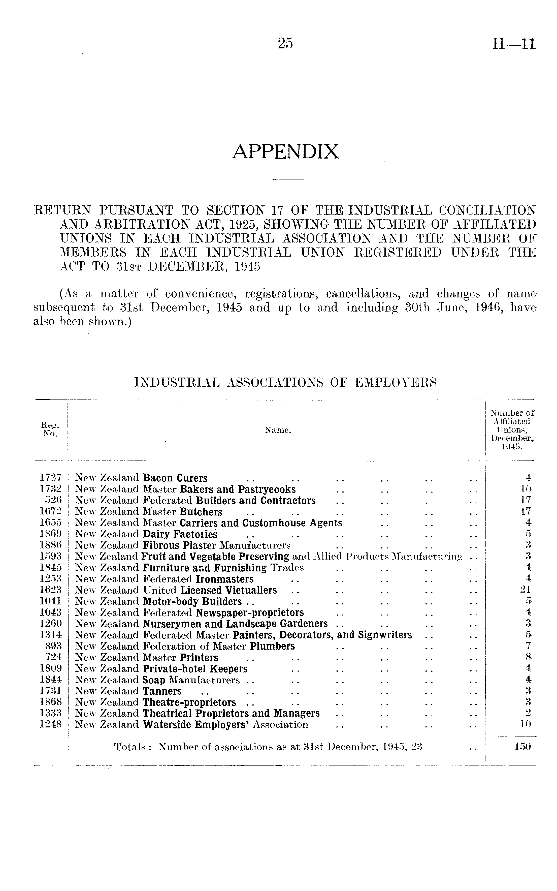 RETURN PURSUANT TO SECTION 17 OF THE INDUSTRIAL CONCILIATION AND ARBITRATION ACT, 1925, SHOWING THE NUMBER OF AFFILIATED UNIONS IN EACH INDUSTRIAL ASSOCIATION AND THE NUMBER OF MEMBERS IN EACH INDUSTRIAL UNION REGISTERED UNDER THE ACT TO 31st DECEMBER, 1945 (As a matter of convenience, registrations, cancellations, and changes of name subsequent to 31st December, 1945 and up to and including 30th June, 1946, have also been shown.)
