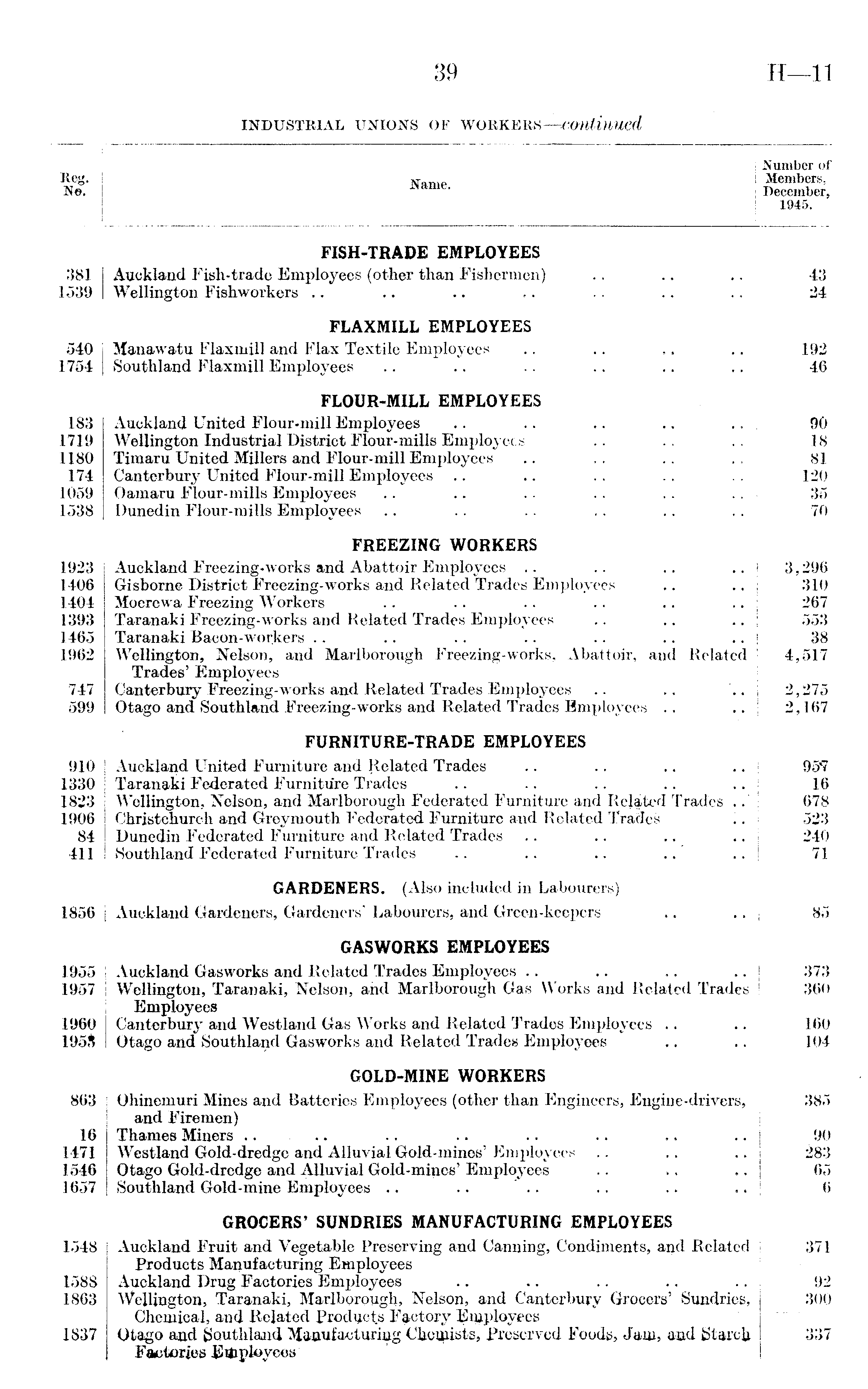 Reg. Ne. Name. Number of Members, December, 1945. FISH-TRADE EMPLOYEES 381 Auckland Fish-trade Employees (other than Fishermen) .. .. 43 1539 Wellington Fishworkers .. .. .. .. . - .. 24 FLAXMILL EMPLOYEES 540 Manawatu Flaxmill and Flax Textile Employees .. .. .. .. | 192 1754 Southland Flaxmill Employees .. .. .. .. .. 46 FLOUR-MILL EMPLOYEES 183 Auckland United Flour-mill Employees 90 1719 Wellington Industrial District Flour-mills Employees 18 1180 Timaru United Millers and Flour-mill Employees 81 174 Canterbury United Flour-mill Employees 120 1059 Oamaru Flour-mills Employees 35 1538 Dunedin Flour-mills Employees .. . . .. .. ,. 70 FREEZING WORKERS 1923 Auckland Freezing-works and Abattoir Employees 3,296 1406 Gisborne District Freezing-works and Related Trades Employees 310 1404 Moerewa Freezing Workers 267 1393 Taranaki Freezing-works and Related Trades Employees .. .. 553 1465 Taranaki Bacon-workers .. .. .. .. 38 1962 Wellington, Nelson, and Marlborough Freezing-works, Abattoir, and Related 4,517 Trades' Employees 747 Canterbury Freezing-works and Related Trades Employees .. 2,275 599 Otago and Southland Freezing-works and Related Trades Employees 2,167. FURNITURE-TRADE EMPLOYEES 910 Auckland United Furniture and Related Trades 95"7 1330 Taranaki Federated Furniture Trades .. 16 1823 Wellington, Nelson, and Marlborough Federated Furniture and Related Trades .. 678 1906 Christchureh and Grey mouth Federated Furniture and Related Trades 523 84 Dunedin Federated Furniture and Related Trades 240 411 Southland Federated Furniture Trades .. .. .. 71 GARDENERS. (Also included in Labourers) 1856 1 Auckland Gardeners, Gardeners' Labourers, and Green-keepers | 85 GASWORKS EMPLOYEES 1955 1 Auckland Gasworks and Related Trades Employees | 373 1957 Wellington, Taranaki, Nelson, and Marlborough Gas Works and Related Trades 360 Employees 1960 Canterbury and Westland Gas Works and Related Trades Employees 160 195$ Otago and Southland Gasworks and Related Trades Employees 104 GOLD-MINE WORKERS 863 Ohinemuri Mines and Batteries Employees (other than Engineers, Engine-drivers, 385 and Firemen) 16 Thames Miners .. . .. 90 1471 Westland Gold-dredge and Alluvial Gold-mines' Employees 283 1546 Otago Gold-dredge and Alluvial Gold-mines' Employees 65 1657 Southland Gold-mine Employees .. .. ' .. .. .. 6 GROCERS' SUNDRIES MANUFACTURING EMPLOYEES 1548 Auckland Fruit and Vegetable Preserving and Canning, Condiments, and Related 371 Products Manufacturing Employees 158S Auckland Drug Factories Employees 92 1863 Wellington, Taranaki, Marlborough, Nelson, and Canterbury Grocers' Sundries, 300 Chemical, and Related Products Factory Employees f 1837 Otago and Southland Manufacturing Cheaiists, Preserved Foods, Jam, and Starch 337 Factories Employees