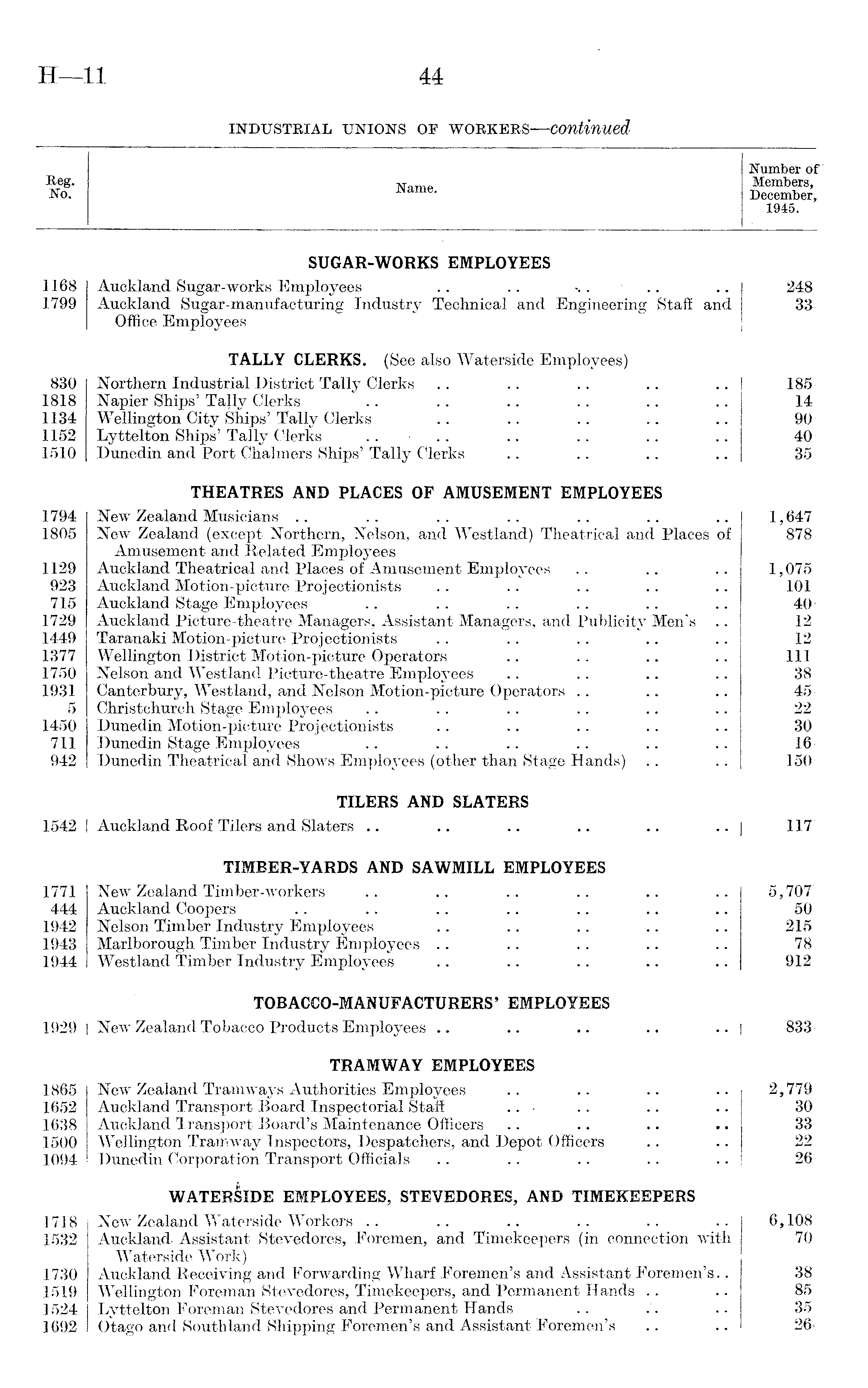 Reg. No. Name. Number of" Members, December, 1945. SUGAR-WORKS EMPLOYEES 1168 Auckland Sugar-works Employees .. .. . 248 1799 Auckland Sugar-manufacturing Industry Technical and Engineering Staff and 33 Office Employees TALLY CLERKS. (See also Waterside Employees) 830 Northern Industrial District Tally Clerks 1851818 Napier Ships' Tally Clerks 14 1134 Wellington City Ships' Tally Clerks 90 1152 Lyttelton Ships' Tally Clerks .. • .. .. .. 40 1510 Dunedin and Port Chalmers Ships' Tally Clerks .. .. .. 35THEATRES AND PLACES OF AMUSEMENT EMPLOYEES 1794 New Zealand Musicians 1,647 1805 New Zealand (except Northern, Nelson, and Westland) Theatrical and Places of 878Amusement and Related Employees 1129 Auckland Theatrical and Places of Amusement Employees... 1,075 923 Auckland Motion-picture Projectionists 101 715 Auckland Stage Employees 40' 1729 Auckland Picture-theatre Managers, Assistant Managers, and Publicity Men's .. 12 1449 Taranaki Motion-picture Projectionists 12 1377 Wellington District Motion-picture Operators 111 1750 Nelson and Westland Picture-theatre Employees .. .. .. 38. 1931 Canterbury, Westland, and Nelson Motion-picture Operators 45 5 Christchurch Stage Employees 22 1450 Dunedin Motion-picture Projectionists 30 711 Dunedin Stage Employees 16 942 Dunedin Theatrical and Shows Employees (other than Stage Hands) 150TILERS AND SLATERS 1542 I 1 Auckland Roof Tilers and Slaters .. .. .. .. .. | 117' TIMBER-YARDS AND SAWMILL EMPLOYEES 1771 New Zealand Timber-workers 5,707 444 Auckland Coopers .. 50 1942 Nelson Timber Industry Employees 215 1943 Marlborough Timber Industry Employees 781944 Westland Timber Industry Employees 912. TOBACCO-MANUFACTURERS' EMPLOYEES 1929 | New Zealand Tobacco Products Employees .. .. .. .. .. ] 833 TRAMWAY EMPLOYEES 1865 New Zealand Tramways Authorities Employees 2,779* 1652 Auckland Transport Board Inspectorial Staff .. • 301638 Auckland Transport Board's Maintenance Officers 33 1500 Wellington Tramway Inspectors, Despatchers, and Depot Officers 22 1094 Dunedin Corporation Transport Officials 2fr WATERSIDE EMPLOYEES, STEVEDORES, AND TIMEKEEPERS 1718 New Zealand Waterside Workers 6,108 1532 Auckland- Assistant Stevedores, Foremen, and Timekeepers (in connection with 70Waterside Work) 1730 Auckland Receiving and Forwarding Wharf Foremen's and Assistant Foremen's.. 381519 Wellington Foreman Stevedores, Timekeepers, and Permanent Hands 85 1524 Lyttelton Foreman Stevedores and Permanent Hands 35 1692 Otago and Southland Shipping Foremen's and Assistant Foremen's 26-