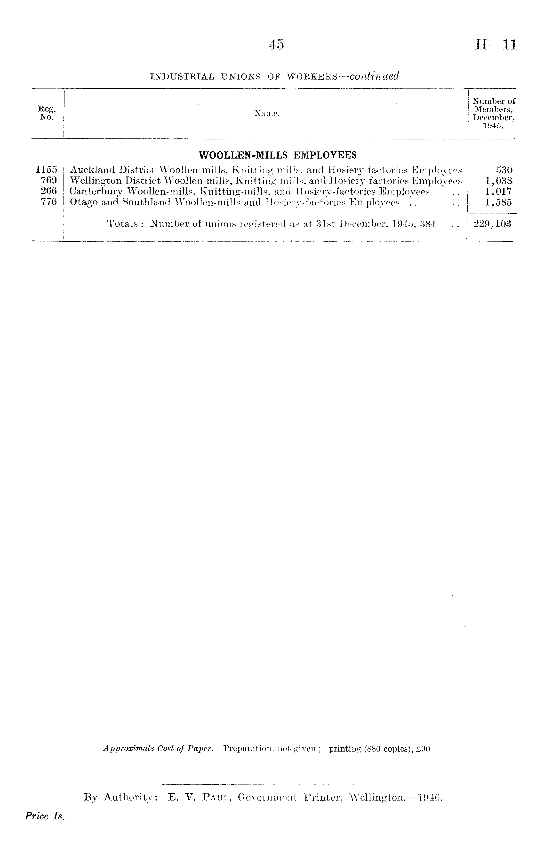 Reg. No. Name. Number of Members, December, 1945. WOOLLEN-MILLS EMPLOYEES 1155 769 266 77 6 Auckland District Woollen-mills, Knitting-mills, and Hosiery-factories Employees Wellington District Woollen-mills, Knitting-mills, and Hosiery-factories Employees Canterbury Woollen-mills, Knitting-mills, and Hosiery-factories Employees Otago and Southland Woollen-mills and Hosiery-factories Employees 530 1,038 1,017 1,585 Totals : Number of unions registered as at 31st December, 1945, 384 229,103