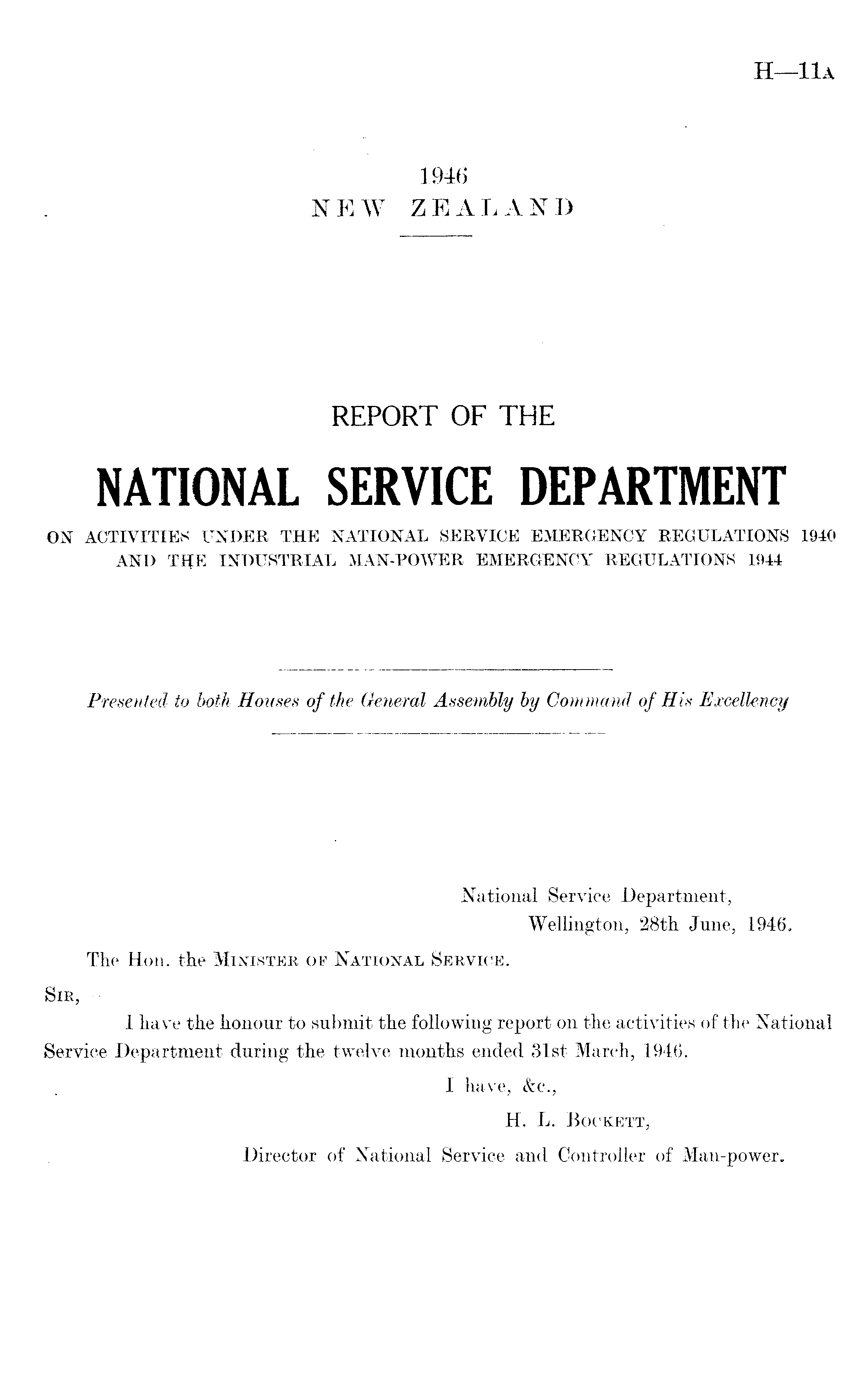 National Service Department, Wellington, 28th June, 1946. The Hon. the Minister of National Service. Sir,— I have the honour to submit the following report on the activities of the National Service Department during the twelve months ended 31st March, 1946. I have, &c., H. L. Bockett, Director of National Service and Controller of Man-power.