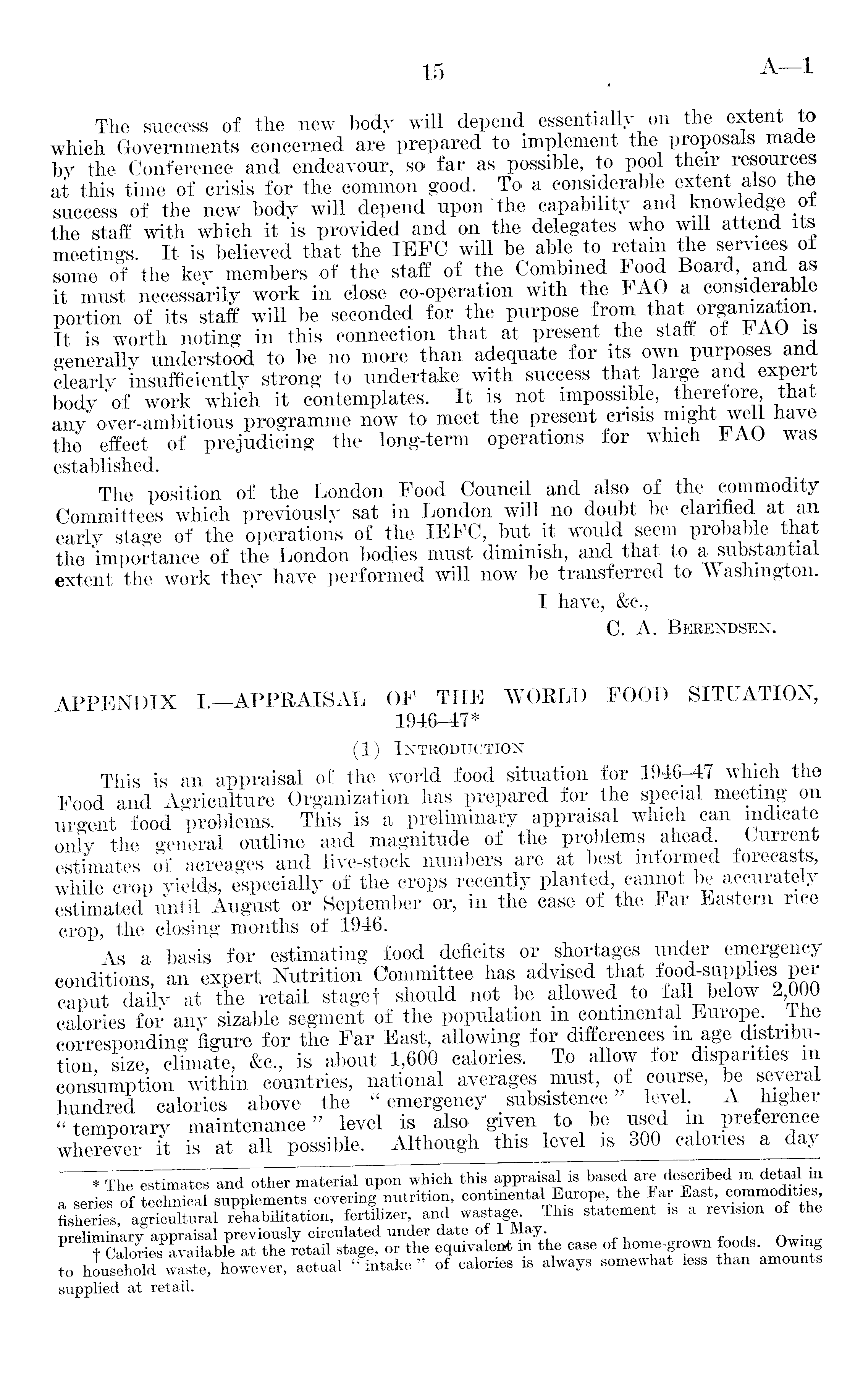 The success of the new body will depend essentially on the extent to which Governments concerned are prepared to implement the proposals made by the "Conference and endeavour, so far as possible, to pool their resources at this time of crisis for the common good. T,o a considerable extent also the success of the new body will depend upon the capability and knowledge ot the staff with which it is provided and on the delegates who will attend its meetings. It is believed that the lEFC will be able to retain the services ot some of the key members of the staff of the Combined Food Board, and as it must necessarily work in close co-operation with the FAO a considerable portion of its staff will be seconded for the purpose from that orgamzation It is worth noting in this connection that at present the start ot rAU is generally understood to be no more than adequate for its own purposes and clearly insufficiently strong to undertake with success that large and expert body of work which it contemplates. It is not impossible, therefore, that any over-ambitious programme now to meet the present crisis might well have the effect of prejudicing the long-term operations for which FAO was established. The position of the London Food Council and also of the commodity Committees which previously sat in London will no doubt be clarified at an early stage of the operations of the lEFC, but it would seem probable that the importance of the London bodies must diminish, and that to a substantial extent the work they have performed will now be transferred to Washington. I have, &c., C. A. Berendsen. APPENDIX I—APPRAISAL OP THE WORLD POOD SITUATION, 1946-47* (1) Introduction This is an appraisal of the world food situation for 1946-47 which the Food and Agriculture Organization has prepared for the special meeting on urgent food problems. This is a preliminary appraisal which can indicate only the general outline and magnitude of the problems ahead. Current estimates of acreages and live-stock numbers are at best informed forecasts, while crop yields, especially of the crops recently planted, cannot be accurately estimated until August or September or, in the case of the Far Eastern rice crop, the closing months of 1946. As a basis for estimating food deficits or shortages under emergency conditions, an expert Nutrition Committee has advised that food-supplies per caput daily at the retail stagef should not be allowed to fall below 2,000 calories for any sizable segment of the population in continental Europe. Ihe corresponding figure for the Far East, allowing for differences m age distribution size, climate, &c., is about 1,600 calories. To allow for disparities m consumption within countries, national averages must, of course, be several hundred calories above the " emergency subsistence level. A higher "temporary maintenance" level is also given to be used in preference wherever it is at all possible. Although this level is 300 calories a day