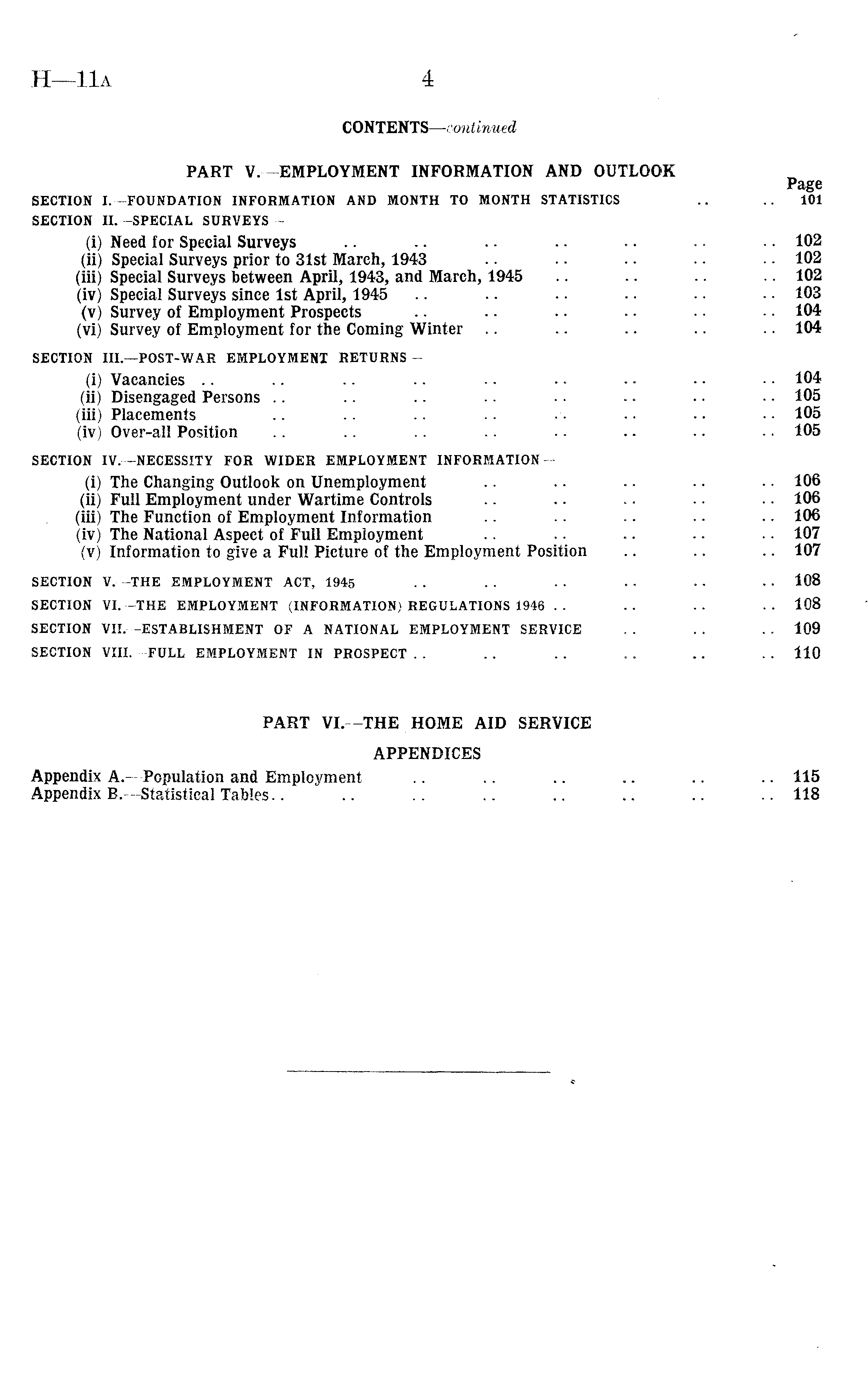 CONTENTS —continued PART V. —EMPLOYMENT INFORMATION AND OUTLOOK Page SECTION I.—FOUNDATION INFORMATION AND MONTH TO MONTH STATISTICS .. 101 SECTION II. —SPECIAL SURVEYS — (i) Need for Special Surveys .. .. .. .. 102 (ii) Special Surveys prior to 31st March, 1943 .. 102 (iii) Special Surveys between April, 1943, and March, 1945 .. .. 102 (iv) Special Surveys since Ist April, 1945 .. .. .. 103 (v) Survey of Employment Prospects .. .. - • 104 (vi) Survey of Employment for the Coming Winter .. .. .. .. 104 SECTION lII.—POST-WAR EMPLOYMENT RETURNS(i) Vacancies .. .. .. .. • • • • • • • ■ 104 (ii) Disengaged Persons .. .. •. . • ■ • • • 105 (iii) Placements .. • • • • • • 105 (iv) Over-all Position .. .. .. .. .. 105 SECTION IV.—NECESSITY FOR WIDER EMPLOYMENT INFORMATION—(i) The Changing Outlook on Unemployment .. . - 106 (ii) Full Employment under Wartime Controls .. • ■ 106 (iii) The Function of Employment Information .. .. 106 (iv) The National Aspect of Full Employment .. . • 107 (v) Information to give a Full Picture of the Employment Position .. .. .. 107 SECTION V.—THE EMPLOYMENT ACT, 1945 . . • ■ • • • • . . 108 SECTION VI.—THE EMPLOYMENT (INFORMATION) REGULATIONS 1946 . . . . . . . . 108 SECTION VII.—ESTABLISHMENT OF A NATIONAL EMPLOYMENT SERVICE . . . . . . 109 SECTION VIII.—FULL EMPLOYMENT IN PROSPECT . . . . . . . . . . . . 110 PART VI.—THE HOME AID SERVICE APPENDICES Appendix A. —Population and Employment .. .. .. .. .. .. 115 Appendix B. —Statistical Tables.. .. .. .. .. .. .. .. 118