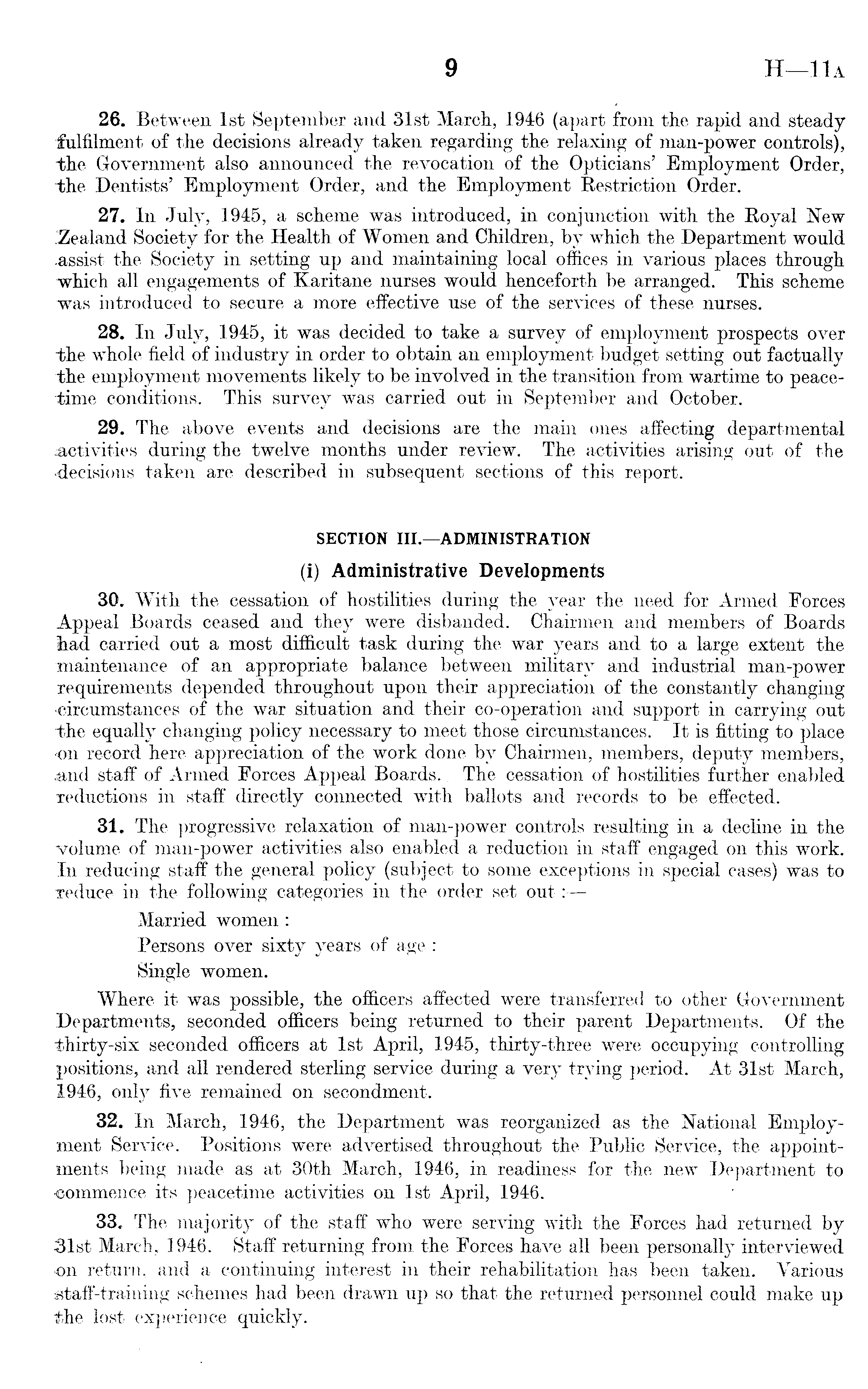 26. Between Ist September and 31st March, 1946 (apart from the rapid and steady fulfilment of the decisions already taken regarding the relaxing of man-power controls), the Government also announced the revocation of the Opticians' Employment Order, "the Dentists' Employment Order, and the Employment Restriction Order. 27. In July, 1945, a scheme was introduced, in conjunction with the Royal New Society for the Health of Women and Children, by which the Department would assist the Society in setting up and maintaining local offices in various places through -which all engagements of Karitane nurses would henceforth be arranged. This scheme -was introduced to secure a more effective use of the services of these nurses. 28. In July, 1945, it was decided to take a survey of employment prospects over the whole field of industry in order to obtain an employment budget setting out factually the employment movements likely to be involved in the transition from wartime to peacetime conditions. This survey was carried out in September and October. 29. The above events and decisions are the main ones affecting departmental activities during the twelve months under review. The activities arising out of the -decisions taken are described in subsequent sections of this report. SECTION lII.—ADMINISTRATION (i) Administrative Developments 30. With the cessation of hostilities during the year the need for Armed Forces Appeal Boards ceased and they were disbanded. Chairmen and members of Boards had carried out a most difficult task during the war years and to a large extent the maintenance of an appropriate balance between military and industrial man-power requirements depended throughout upon their appreciation of the constantly changing •circumstances of the war situation and their co-operation and support in carrying out the equally changing policy necessary to meet those circumstances. It is fitting to place •on record here appreciation of the work done by Chairmen, members, deputy members, and staff of Armed Forces Appeal Boards.. The cessation of hostilities further enabled reductions in staff directly connected with ballots and records to be effected. 31. The progressive relaxation of man-power controls resulting in a decline in the volume of man-power activities also enabled a reduction in staff engaged on this work. In reducing staff the general policy (subject to some exceptions in special cases) was to reduce in the following categories in the order set out: — Married women : Persons over sixty years of age : Single women. Where it was possible, the officers affected were transferred to other Government Departments, seconded officers being returned to their parent Departments. Of the thirty-six seconded officers at Ist April, 1945, thirty-three were occupying controlling positions, and all rendered sterling service during a very trying period. At 31st March, 1946, only five remained on secondment. 32. In March, 1946, the Department was reorganized as the National Employment Service. Positions were advertised throughout the Public Service, the appointments being made as at 30th March, 1946, in readiness for the new Department to -commence its peacetime activities on Ist April, 1946. 33. The majority of the staff who were serving with the Forces had returned by 31st March, 1946. Staff returning from the Forces have all been personally interviewed •on return, and a continuing interest in their rehabilitation has been taken. Various staff-training schemes had been drawn up so that the returned personnel could make up the lost experience quickly.