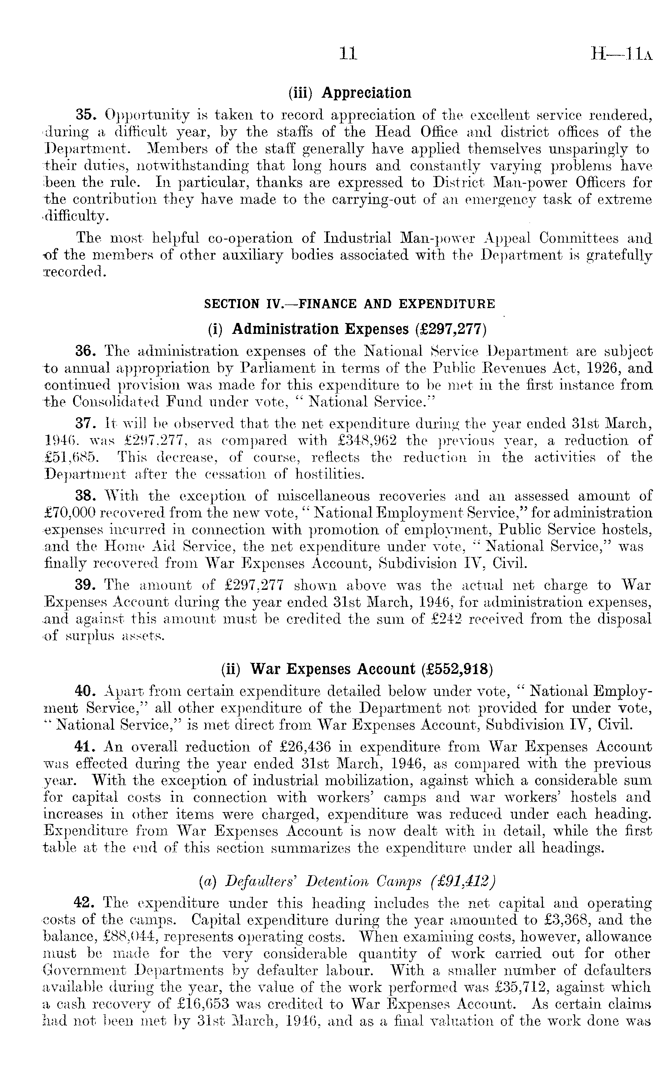 (iii) Appreciation 35. Opportunity is taken to record appreciation of the excellent service rendered, during a difficult year, by the staffs of the Head Office and district offices of the Department. Members of the staff generally have applied themselves unsparingly to their duties, notwithstanding that long hours and constantly varying problems have been the rule. In particular, thanks are expressed to District Man-power Officers for the contribution they have made to the carrying-out of an emergency task of extreme difficulty. The most helpful co-operation of Industrial Man-power Appeal Committees and of the members of other auxiliary bodies associated with the Department is gratefully trecorded. SECTION IV.—FINANCE AND EXPENDITURE (i) Administration Expenses (£297,277) 36. The administration expenses of the National Service Department are subject to annual appropriation by Parliament in terms of the Public Revenues Act, 1926, and •continued provision was made for this expenditure to be met in the first instance from the Consolidated Fund under vote, " National Service." 37. It will be observed that the net expenditure during the year ended 31st March, 1946, was £297,277, as compared with £348,962 the previous year, a reduction of .£51,685. This decrease, of course, reflects the reduction in the activities of the Department after the cessation of hostilities. 38. With the exception of miscellaneous recoveries and an assessed amount of £70,000 recovered from the new vote, " National Employment Service," for administration incurred in connection with promotion of employment, Public Service hostels, and the Home Aid Service, the net expenditure under vote, " National Service," was finally recovered from War Expenses Account, Subdivision IY, Civil. 39. The amount of £297,277 shown above was the actual net charge to War Expenses Account during the year ended 31st March, 1946, for administration expenses, And against this amount must be credited the sum of £242 received from the disposal of surplus assets. (ii) War Expenses Account (£552,918) 40. Apart from certain expenditure detailed below under vote, " National Employment Service," all other expenditure of the Department not provided for under vote, " National Service," is met direct from War Expenses Account, Subdivision IV, Civil. 41. An overall reduction of £26,436 in expenditure from War Expenses Account was effected during the year ended 31st March, 1946, as compared with the previous year. With the exception of industrial mobilization, against which a considerable sum for capital costs in connection with workers' camps and war workers' hostels and increases in other items were charged, expenditure was reduced under each heading. Expenditure from War Expenses Account is now dealt with in detail, while the first table at the end of this section summarizes the expenditure under all headings. (a) Defaulters' Detention Camps (£91,412) 42. The expenditure under this heading includes the net capital and operating •costs of the camps. Capital expenditure during the year amounted to £3,368, and the balance, £88,044, represents operating costs. When examining costs, however, allowance must be made for the very considerable quantity of work carried out for other •Government Departments by defaulter labour. With a smaller number of defaulters available during the year, the value of the work performed was £35,712, against which -a cash recovery of £16,653 was credited to War Expenses Account. As certain claims had not been met by 31st March, 1946, and as a final valuation of the work done was