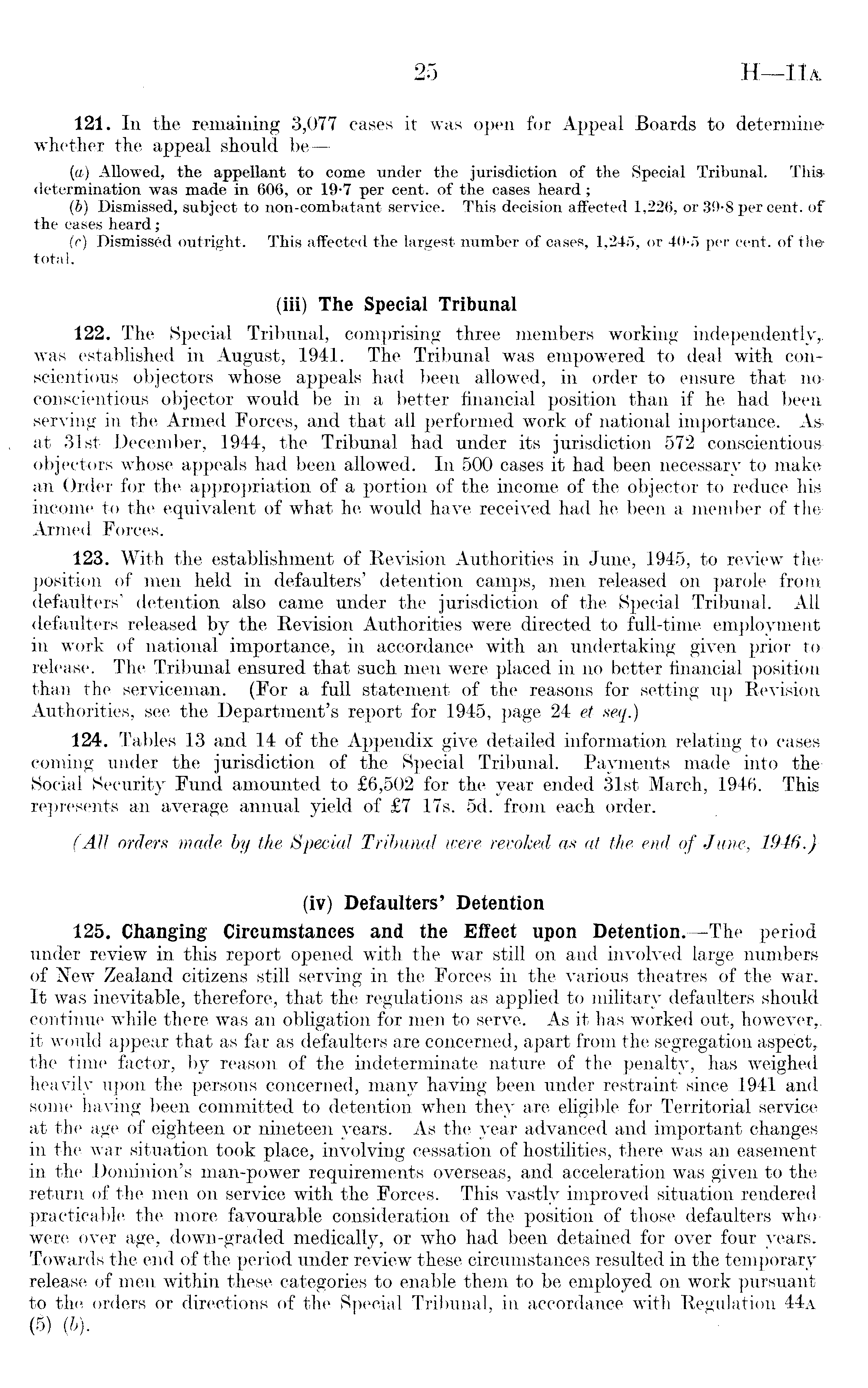 121. In the remaining 3,077 cases it was open for Appeal Boards to determine whether the appeal should be—(a) Allowed, the appellant to come under the jurisdiction of the Special Tribunal. This, determination was made in 606, or 19*7 per cent, of the cases heard ; (b) Dismissed, subject to non-combatant service. This decision affected 1,226, or 39*8 per cent, of the cases heard; (r) Dismissed outright. This affected the largest number of cases, 1,245, or 40-5 per cent, of thetotal. (iii) The Special Tribunal 122. The Special Tribunal, comprising three members working independently,, was established in August, 1941. The Tribunal was empowered to deal with conscientious objectors whose appeals had been allowed, in order to ensure that noconscientious objector would be in a better financial position than if he had been serving in the Armed Forces, and that all performed work of national importance. As. at 31st December, 1944, the Tribunal had under its jurisdiction 572 conscientiousobjectors whose appeals had been allowed. In 500 cases it had been necessary to make an Order for the appropriation of a portion of the income of the objector to reduce his income to the equivalent of what he would have received had he been a member of the Armed Forces. 123. With the establishment of Revision Authorities in June, 1945, to review theposition of men held in defaulters' detention camps, men released on parole from defaulters' detention also came under the jurisdiction of the Special Tribunal. All defaulters released by the Revision Authorities were directed to full-time employment in work of national importance, in accordance with an undertaking given prior to release. The Tribunal ensured that such men were placed in no better financial position than the serviceman. (For a full statement of the reasons for setting up Revision Authorities, see the Department's report for 1945, page 24 et seq.) 124. Tables 13 and 14 of the Appendix give detailed information relating to caseseoming under the jurisdiction of the Special Tribunal. Payments made into the Social Security Fund amounted to £6,502 for the year ended 31st March, 1946. This represents an average annual yield of £7 17s. sd. from each order. (All orders made by the Special Tribunal were revoked as at the end of June, 1946.)' (iv) Defaulters' Detention 125. Changing Circumstances and the Effect upon Detention. —-The period under review in this report opened with the war still on and involved large numbers of New Zealand citizens still serving in the Forces in the various theatres of the war. It was inevitable, therefore, that the regulations as applied to military defaulters should continue while there was an obligation for men to serve. As it has worked out, however,, it would appear that as far as defaulters are concerned, apart from the segregation aspect, the time factor, by reason of the indeterminate nature of the penalty, has weighed heavily upon the persons concerned, many having been under restraint since 1941 and some having been committed to detention when they are eligible for Territorial service at the age of eighteen or nineteen years. As the year advanced and important changes in the war situation took place, involving cessation of hostilities, there was an easement in the Dominion's man-power requirements overseas, and acceleration was given to the return of the men on service with the Forces. This vastly improved situation rendered practicable the more favourable consideration of the position of those defaulters whowere over age, down-graded medically, or who had been detained for over four years. Towards the end of the period under review these circumstances resulted in the temporary release of men within these categories to enable them to be employed on work pursuant to the orders or directions of the Special Tribunal, in accordance with Regulation 44a (5) (b).