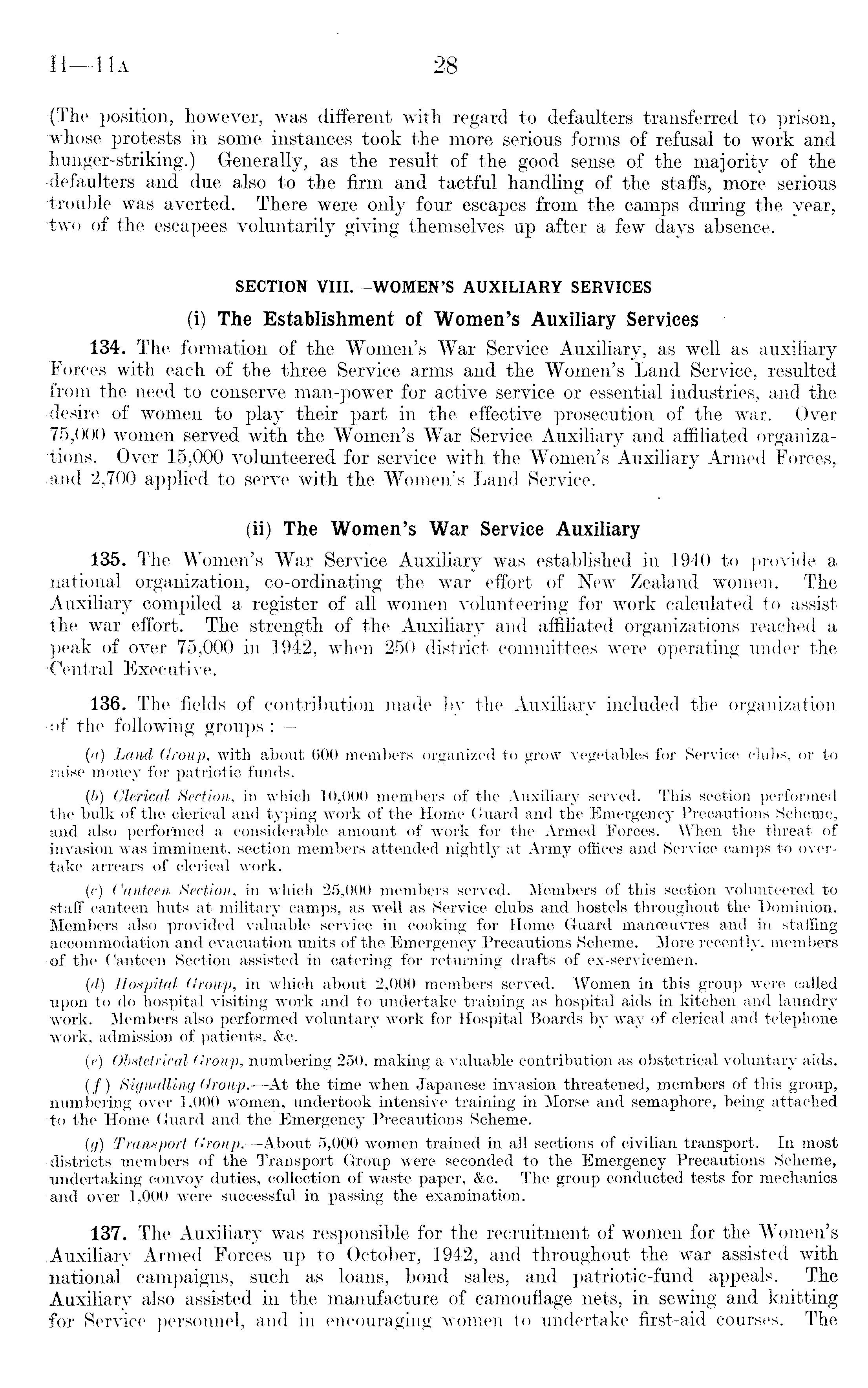 '■( The position, however, was different with regard to defaulters transferred to prison, -whose protests in some instances took the more serious forms of refusal to work and hunger-striking.) Generally, as the result of the good sense of the majority of the defaulters and due also to the firm and tactful handling of the staffs, more serious -trouble was averted. There were only four escapes from the camps during the year, -two of the escapees voluntarily giving themselves up after a few days absence. SECTION VIII. —WOMEN'S AUXILIARY SERVICES (i) The Establishment of Women's Auxiliary Services 134. The formation of the Women's War Service Auxiliary, as well as auxiliary Forces with each of the three Service arms and the Women's Land Service, resulted from the need to conserve man-power for active service or essential industries, and the desire of women to play their part in the effective prosecution of the war. Over 75,000 women served with the Women's War Service Auxiliary and affiliated organizations. Over 15,000 volunteered for service with the Women's Auxiliary Armed Forces, and 2,700 applied to serve with the Women's Land Service. (ii) The Women's War Service Auxiliary 135. The Women's War Service Auxiliary was established in 1940 to provide a national organization, co-ordinating the war effort of New Zealand women. The Auxiliary compiled a register of all women volunteering for work calculated to assist the war effort. The strength of the Auxiliary and affiliated organizations reached a peak of over 75,000 in 1942, when 250 district committees were operating under the 'Central Executive. 136. The 'fields of contribution made by the Auxiliary included the organization •of the following groups : (a) Land Group, with about 600 members organized to grow vegetables for Service clubs, or to raise money for patriotic funds. (b) Clerical Section, in which 10,000 members of the Auxiliary served. This section performed the bulk of the clerical and typing work of the Home Guard and the Emergency Precautions Scheme, and also performed a considerable amount of work for the Armed Forces. When the threat of invasion was imminent, section members attended nightly at Army offices and Service camps to overtake arrears of clerical work. (c) Canteen Section, in which 25,000 members served. Members of this section volunteered to staff canteen huts at military camps, as well as Service clubs and hostels throughout the Dominion. Members also provided valuable service in cooking for Home Guard manoeuvres and in staffing accommodation and evacuation units of the Emergency Precautions Scheme. More recently, members -of the Canteen Section assisted in catering for returning drafts of ex-servicemen. (d) Hospital Croup, in which about 2,000 members served. Women in this group were called upon to do hospital visiting work and to undertake training as hospital aids in kitchen and laundry work. Members also performed voluntary work for Hospital Boards by way of clerical and telephone -work, admission of patients, &c. (e) Obstetrical Group, numbering 250, making a valuable contribution as obstetrical voluntary aids. (/) Signalling Group.—At the time when Japanese invasion threatened, members of this group, numbering over 1,000 women, undertook intensive training in Morse and semaphore, being attached to the Home Guard and the Emergency Precautions Scheme. (g) Transport Group.—About 5,000 women trained in all sections of civilian transport. In most •districts members of the Transport Group were seconded to the Emergency Precautions Scheme, undertaking convoy duties, collection of waste paper, &c. The group conducted tests for mechanics and over 1,000 were successful in passing the examination. 137. The Auxiliary was responsible for the recruitment of women for the Women's Auxiliary Armed Forces up to October, 1942, and throughout the war assisted with national campaigns, such as loans, bond sales, and patriotic-fund appeals. The Auxiliary also assisted in the manufacture of camouflage nets, in sewing and knitting lx>r Service personnel, and in encouraging women to undertake first-aid courses. The