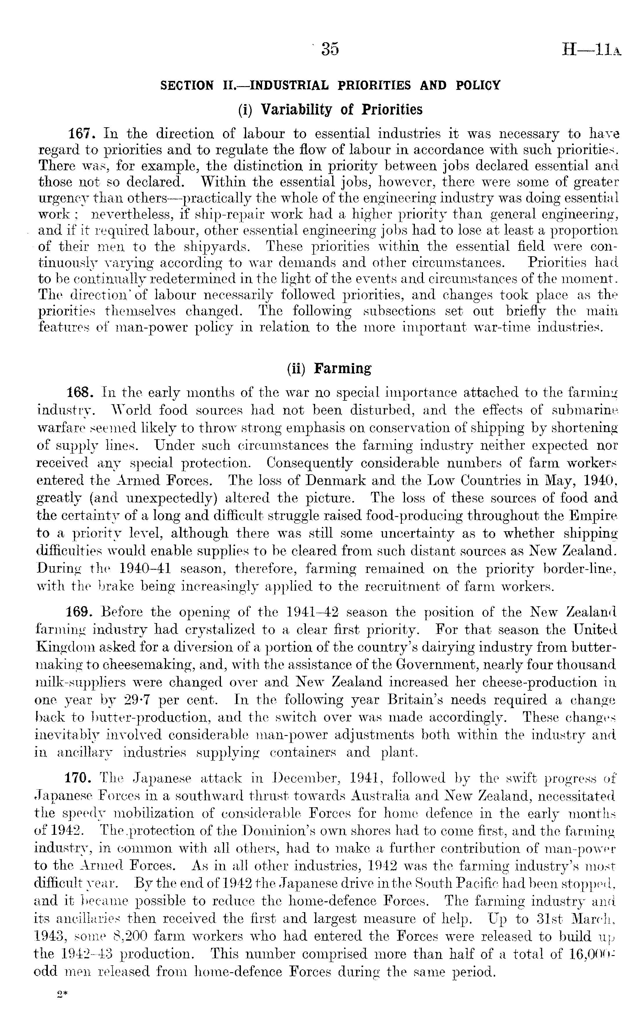 SECTION lI.—INDUSTRIAL PRIORITIES AND POLICY (i) Variability of Priorities 167. In the direction of labour to essential industries it was necessary to have regard to priorities and to regulate the flow of labour in accordance with such priorities. There was, for example, the distinction in priority between jobs declared essential and those not so declared. Within the essential jobs, however, there were some of greater urgency than others —practically the whole of the engineering industry was doing essential work ; nevertheless, if ship-repair work had a higher priority than general engineering, and if it required labour, other essential engineering jobs had to lose at least a proportion of their men to the shipyards. These priorities within the essential field were continuously varying according to war demands and other circumstances. Priorities had to be continually redetermined in the light of the events and circumstances of the moment. The direction'of labour necessarily followed priorities, and changes took place as the. priorities themselves changed. The following subsections set out briefly the main features of man-power policy in relation to the more important war-time industries. (ii) Farming 168. In the early months of the war no special importance attached to the farming industry. World food sources had not been disturbed, and the effects of submarine warfare seemed likely to throw strong emphasis on conservation of shipping by shortening of supply lines. Under such circumstances the farming industry neither expected nor received any special protection. Consequently considerable numbers of farm workers entered the Armed Forces. The loss of Denmark and the Low Countries in May, 1940, greatly (and unexpectedly) altered the picture. The loss of these sources of food and the certainty of a long and difficult struggle raised food-producing throughout the Empire to a priority level, although there was still some uncertainty as to whether shipping difficulties would enable supplies to be cleared from such distant sources as New Zealand. During the 1910-41 season, therefore, farming remained on the priority border-line, with the brake being increasingly applied to the recruitment of farm workers. 169. Before the opening of the 1941-42 season the position of the New Zealand farming industry had crystalized to a clear first priority. For that season the United Kingdom asked for a diversion of a portion of the country's dairying industry from buttermaking to cheesemaking, and, with the assistance of the Government, nearly four thousand milk-suppliers were changed over and New Zealand increased her cheese-production in one year by 29-7 per cent. In the following year Britain's needs required a change back to butter-production, and the switch over was made accordingly. These changes inevitably involved considerable man-power adjustments both within the industry and in ancillary industries supplying containers and plant. 170. The Japanese attack in December, 1941, followed by the swift progress of Japanese Forces in a southward thrust towards Australia and New Zealand, necessitated the speedy mobilization of considerable Forces for home defence in the early months of 1942. The .protection of the Dominion's own shores had to come first, and the farming industry, in common with all others, had to make a further contribution of man-power to the Armed Forces. As in all other industries, 1942 was the farming industry's most difficult year. By the end of 1942 the Japanese drive in the South Pacific had been stopped, and it became possible to reduce the home-defence Forces. The farming industry and its ancillaries then received the first and largest measure of help. Up to 31st March, 1943, some 8,200 farm workers who had entered the Forces were released to build up the 1942-43 production. This number comprised more than half of a total of 16,000odd men released from home-defence Forces during the same period. o*