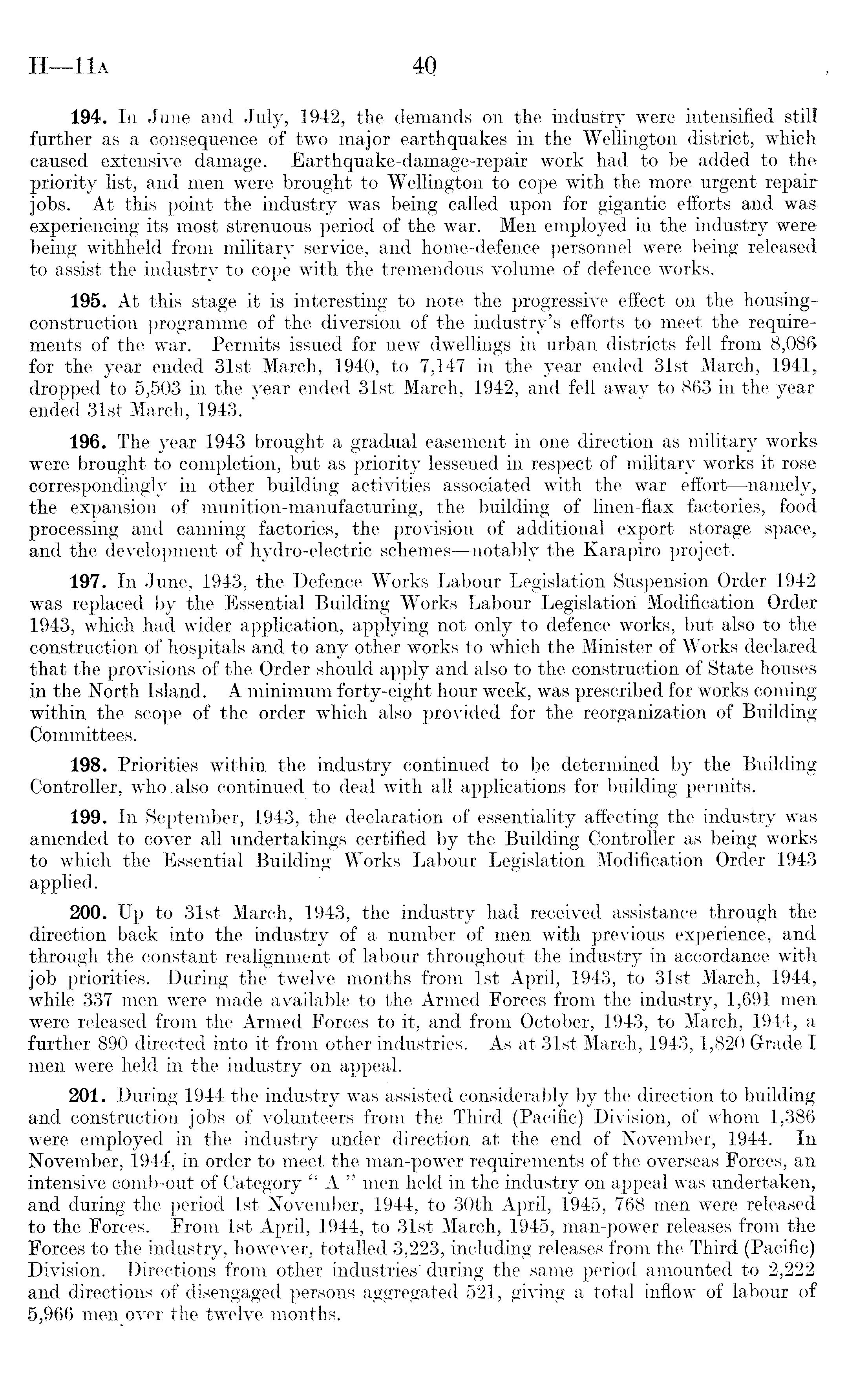 194. In June and July, 1942, the demands on the industry were intensified still further as a consequence of two major earthquakes in the Wellington district, which caused extensive damage. Earthquake-damage-repair work had to be added to the priority list, and men were brought to Wellington to cope with the more urgent repair jobs. At this point the industry was being called upon for gigantic efforts and was experiencing its most strenuous period of the war. Men employed in the industry were being withheld from military service, and home-defence personnel were being released to assist the industry to cope with the tremendous volume of defence works. 195. At this stage it is interesting to note the progressive effect on the housingconstruction programme of the diversion of the industry's efforts to meet the requirements of the war. Permits issued for new dwellings in urban districts fell from 8,086 for the year ended 31st March, 1940, to 7,147 in the year ended 31st March, 1941, dropped to 5,503 in the year ended 31st March, 1942, and fell away to 863 in the year ended 31st March, 1943. 196. The year 1943 brought a gradual easement in one direction as military works were brought to completion, but as priority lessened in respect of military works it rose correspondingly in other building activities associated with the war effort —namely, the expansion of munition-manufacturing, the building of linen-flax factories, food processing and canning factories, the provision of additional export storage space, and the development of hydro-electric schemes —notably the Karapiro project. 197. In June, 1943, the Defence Works Labour Legislation Suspension Order 1942 was replaced by the Essentia! Building Works Labour Legislation Modification Order 1943, which had wider application, applying not only to defence works, but also to the construction of hospitals and to any other works to which the Minister of Works declared that the provisions of the Order should apply and also to the construction of State houses in the North Island. A minimum forty-eight hour week, was prescribed for works coming within the scope of the order which also provided for the reorganization of Building Committees. 198. Priorities within the industry continued to be determined by the Building Controller, who.also continued to deal with all applications for building permits. 199. In September, 1943, the declaration of essentiality affecting the industry was amended to cover all undertakings certified by the Building Controller as being works to which the Essential Building Works Labour Legislation Modification Order 1943 applied. 200. Up to 31st March, 1943, the industry had received assistance through the direction back into the industry of a number of men with previo'us experience, and through the constant realignment of labour throughout the industry in accordance with job priorities. During the twelve months from Ist April, 1943, to 31st March, 1944, while 337 men were made available to the Armed Forces from the industry, 1,691 men were released from the Armed Forces to it, and from October, 1943, to March, 1944, a further 890 directed into it from other industries. As at 31st March, 1943,1,820 Grade I men were held in the industry on appeal. 201. During 1944 the industry was assisted considerably by the direction to building and construction jobs of volunteers from the Third (Pacific) Division, of whom 1,386 were employed in the industry under direction at the end of November, 1944. In November, 1944', in order to meet the man-power requirements of the overseas Forces, an intensive comb-out of Category " A " men held in the industry on appeal was undertaken, and during the period Ist November, 1944, to 30th April, 1945, 768 men were released to the Forces. From Ist April, 1944, to 31st March, 1945, man-power releases from the Forces to the industry, however, totalled 3,2'23, including releases from the Third (Pacific) Division. Directions from other industries' during the same period amounted to 2,222 and directions of disengaged persons aggregated 521, giving a total inflow of labour of 5,966 men over the twelve months.
