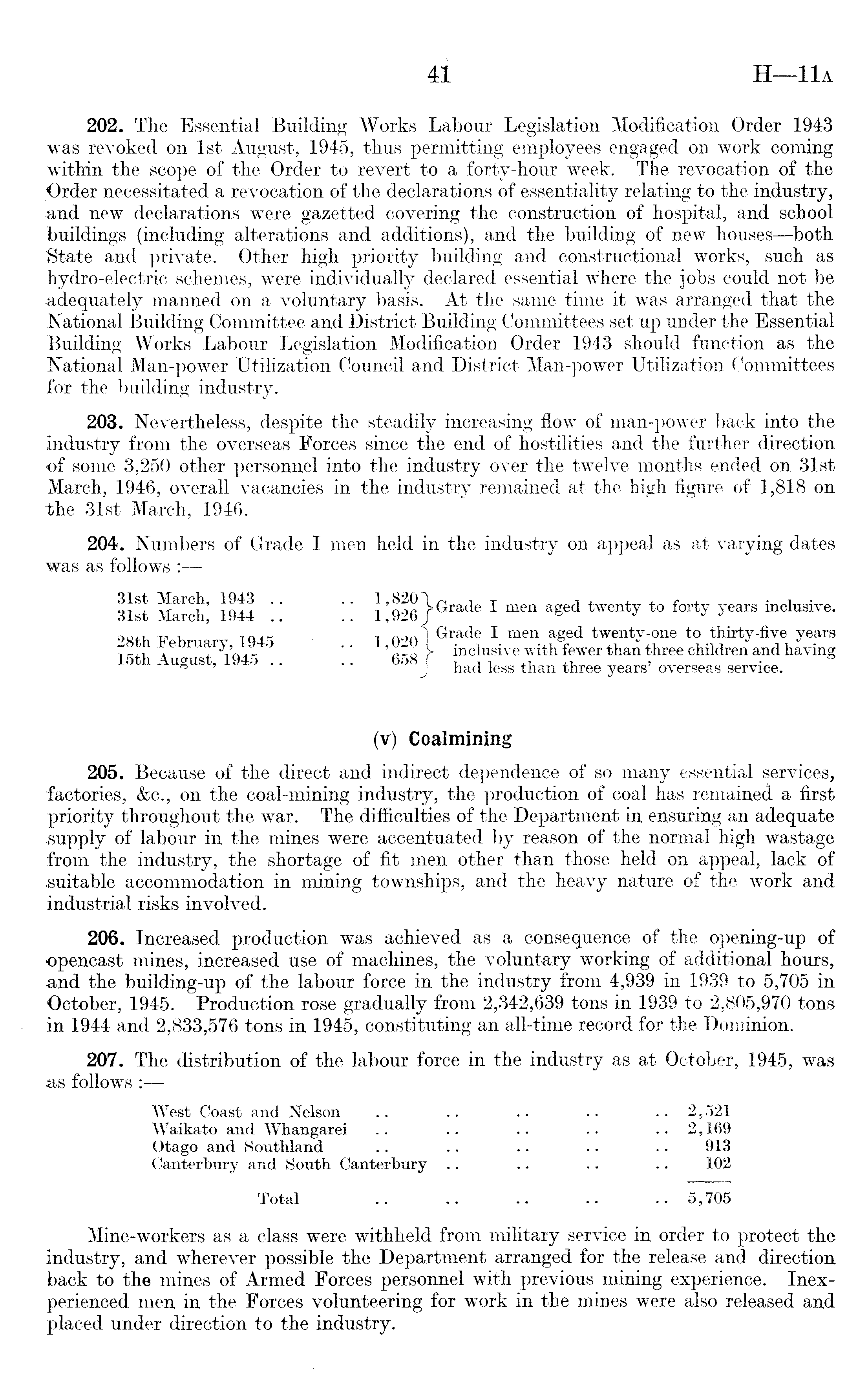 202. The Essential Building Works Labour Legislation Modification Order 1943 was revoked on Ist August, 1945, thus permitting employees engaged on work coming within the scope of the Order to revert to a forty-hour week. The revocation of the Order necessitated a revocation of the declarations of essentiality relating to the industry, and new declarations were gazetted covering the construction of hospital, and school buildings (including alterations and additions), and the building of new houses —both State and private. Other high priority building and constructional works, such as hydro-electric schemes, were individually declared essential where the jobs could not be adequately manned on a voluntary basis. At the same time it was arranged that the National Building Committee and District Building Committees set up under the Essential Building Works Labour Legislation Modification Order 1943 should function as the National Man-power Utilization Council and District Man-power Utilization Committees for the building industry. 203. Nevertheless, despite the steadily increasing flow of man-power back into the Industry from the overseas Forces since the end of hostilities and the further direction of some 3,250 other personnel into the industry over the twelve months ended on 31st March, 1946, overall vacancies in the industry remained at the high figure of 1,818 on the 31st March, 1946. 204. Numbers of Grade I men held in the industry on appeal as at varying dates was as follows : 31st March, 1943 .. .. jt jj. », ±. e • i • 31st March' 1944 .. .. 1^926/ Grade 1 men aged twent y to fort y y ears mclusive. 98th -FVhnmrv 1Q45 1 Grade 1 men aged twent y-° ne to thirty-five years a ! ~ inclusive with fewer than three children and having 15th August, 1945 .. .. 658J had legs than three yearg , overseas service . (v) Coalmining 205. Because of the direct and indirect dependence of so many essential services, factories, &c., on the coal-mining industry, the production of coal has remained a first priority throughout the war. The difficulties of the Department in ensuring an adequate supply of labour in the mines were accentuated by reason of the normal high wastage from the industry, the shortage of fit men other than those held on appeal, lack of suitable accommodation in mining townships, and the heavy nature of the work and industrial risks involved. 206. Increased production was achieved as a consequence of the opening-up of opencast mines, increased use of machines, the voluntary working of additional hours, and the building-up of the labour force in the industry from 4,939 in 1939 to 5,705 in October, 1945. Production rose gradually from 2,342,639 tons in 1939 to 2,805,970 tons in 1944 and 2,833,576 tons in 1945, constituting an all-time record for the Dominion. 207. The distribution of the labour force in the industry as at October, 1945, was as follows :• — West Coast and Nelson .. .. .. .. .. 2,521 Waikato and Whangarei .. .. .. .. .. 2,169 Otago and Southland .. .. .. .. .. 913 Canterbury and South Canterbury .. .. .. .. 102 Total .. .. .. .. .. 5,705 Mine-workers as a class were withheld from military service in order to protect the industry, and wherever possible the Department arranged for the release and direction back to the mines of Armed Forces personnel with previous mining experience. Inexperienced men in the Forces volunteering for work in the mines were also released and placed under direction to the industry.