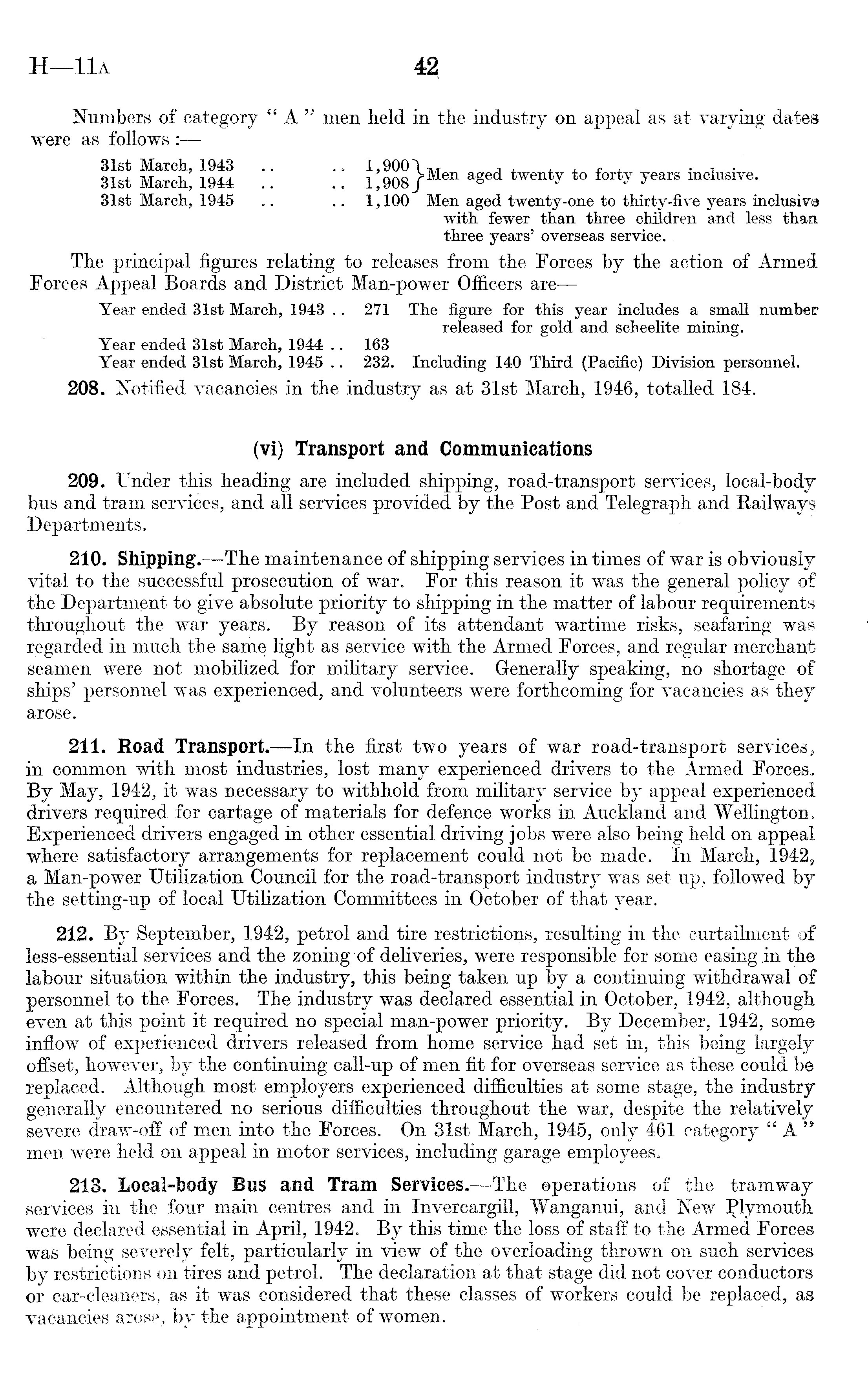 Numbers of category " A " men held in the industry on appeal as at varying dates were as follows : 31st March., 1943 .. .. 1,9001 , , , , „ , . , . 31st March'l944 .. .. a § ed twenty to forty y ears molusive31st March, 1945 .. .. 1,100 Men aged twenty-one to thirty-five years inclusive with fewer than three children and less than three years' overseas service. . The principal figures relating to releases from the Forces by the action of Armed Forces Appeal Boards and District Man-power Officers are — Year ended 31st March, 1943 .. 271 The figure for this year includes a small number released for gold and scheelite mining. Year ended 31st March, 1944 .. 163 Year ended 31st March, 1945 .. 232. Including 140 Third (Pacific) Division personnel. 208. Notified vacancies in the industry as at 31st March, 1946, totalled 184. (vi) Transport and Communications 209. Under this heading are included shipping, road-transport services, local-body bus and tram services, and all services provided by the Post and Telegraph and Railways Departments. 210. Shipping.—The maintenance of shipping services in times of war is obviously vital to the successful prosecution of war. For this reason it was the general policy of the Department to give absolute priority to shipping in the matter of labour requirements throughout the war years. By reason of its attendant wartime risks, seafaring was regarded in much the same light as service with the Armed Forces, and regular merchant seamen were not mobilized for military service. Generally speaking, no shortage of ships' personnel was experienced, and volunteers were forthcoming for vacancies as they arose. 211. Road Transport.—ln the first two years of war road-transport services, in common with most industries, lost many experienced drivers to the Armed Forces. By May, 1942, it was necessary to withhold from military service by appeal experienced drivers required for cartage of materials for defence works in Auckland and Wellington. Experienced drivers engaged in other essential driving jobs were also being held on appeal where satisfactory arrangements for replacement could not be made. In March, 1942, a Man-power Utilization Council for the road-transport industry was set up, followed by the setting-up of local Utilization Committees in October of that year. 212. By September, 1942, petrol and tire restrictions, resulting in the curtailment of less-essential services and the zoning of deliveries, were responsible for some easing in the labour situation within the industry, this being taken up by a continuing withdrawal of personnel to the Forces. The industry was declared essential in October, 1942, although even at this point it required no special man-power priority. By December, 1942, some inflow of experienced drivers released from home service had set in, this being largely offset, however, by the continuing call-up of men fit for overseas service as these could be replaced. Although most employers experienced difficulties at some stage, the industry generally encountered no serious difficulties throughout the war, despite the relatively severe draw-off of men into the Forces. On 31st March, 1945, only 461 category "A " men were held on appeal in motor services, including garage employees. 213. Local-body Bus and Tram Services. —The operations of the tramway services in the four main centres and in Invercargill, Wanganui, and New Plymouth were declared essential in April, 1942. By this time the loss of staff to the Armed Forces was being severely felt, particularly in view of the overloading thrown on such services by restrictions on tires and petrol. The declaration at that stage did not cover conductors or car-cleaners, as it was considered that these classes of workers could be replaced, as vacancies arose, by the appointment of women.