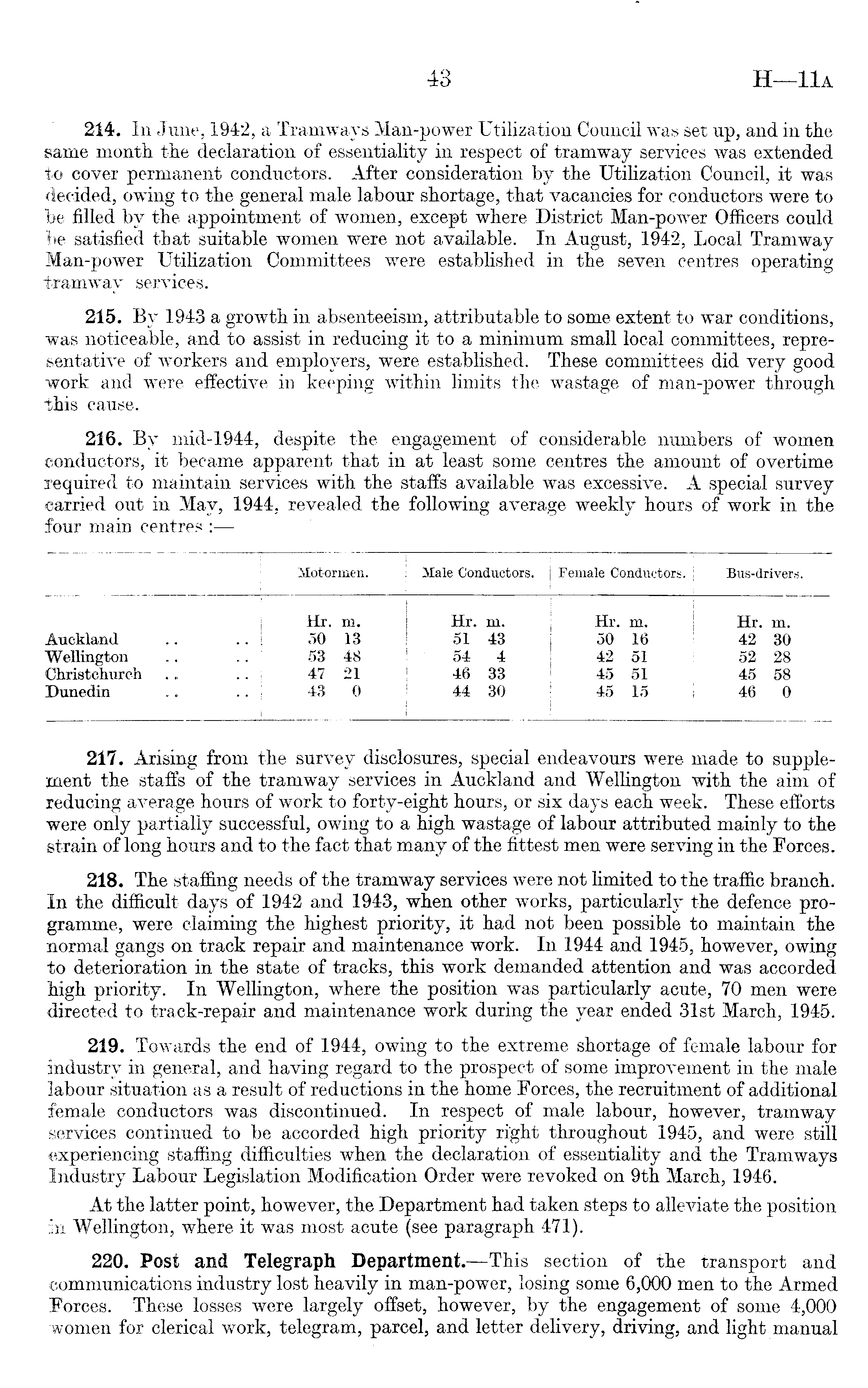 217. Arising from the survey disclosures, special endeavours were made to supplement tlie staffs of the tramway services in Auckland and Wellington with the aim of reducing average hours of work to forty-eight hours, or six days each week. These efforts were only partially successful, owing to a high wastage of labour attributed mainly to the strain of long hours and to the fact that many of the fittest men were serving in the Forces. 218. The staffing needs of the tramway services were not limited to the traffic branch. In the difficult days of 1942 and 1943, when other works, particularly the defence programme, were claiming the highest priority, it had not been possible to maintain the normal gangs on track repair and maintenance work. In 1944 and 1945, however, owing to deterioration in the state of tracks, this work demanded attention and was accorded high priority. In Wellington, where the position was particularly acute, 70 men were directed to track-repair and maintenance work during the year ended 31st March, 1945. 219. Towards the end of 1944, owing to the extreme shortage of female labour for industry in general, and having regard to the prospect of some improvement in the male labour situation as a result of reductions in the home Forces, the recruitment of additional female conductors was discontinued. In respect of male labour, however, tramway services continued to be accorded high priority right throughout 1945, and were still experiencing staffing difficulties when the declaration of essentiality and the Tramways Industry Labour Legislation Modification Order were revoked on 9th March, 1946. At the latter point, however, the Department had taken steps to alleviate the position in Wellington, where it was most acute (see paragraph 471). 220. Post and Telegraph Department.—This section of the transport and communications industry lost heavily in man-power, losing some 6,000 men to the Armed Forces. These losses were largely offset, however, by the engagement of some 4,000 women for clerical work, telegram, parcel, and letter delivery, driving, and light manual